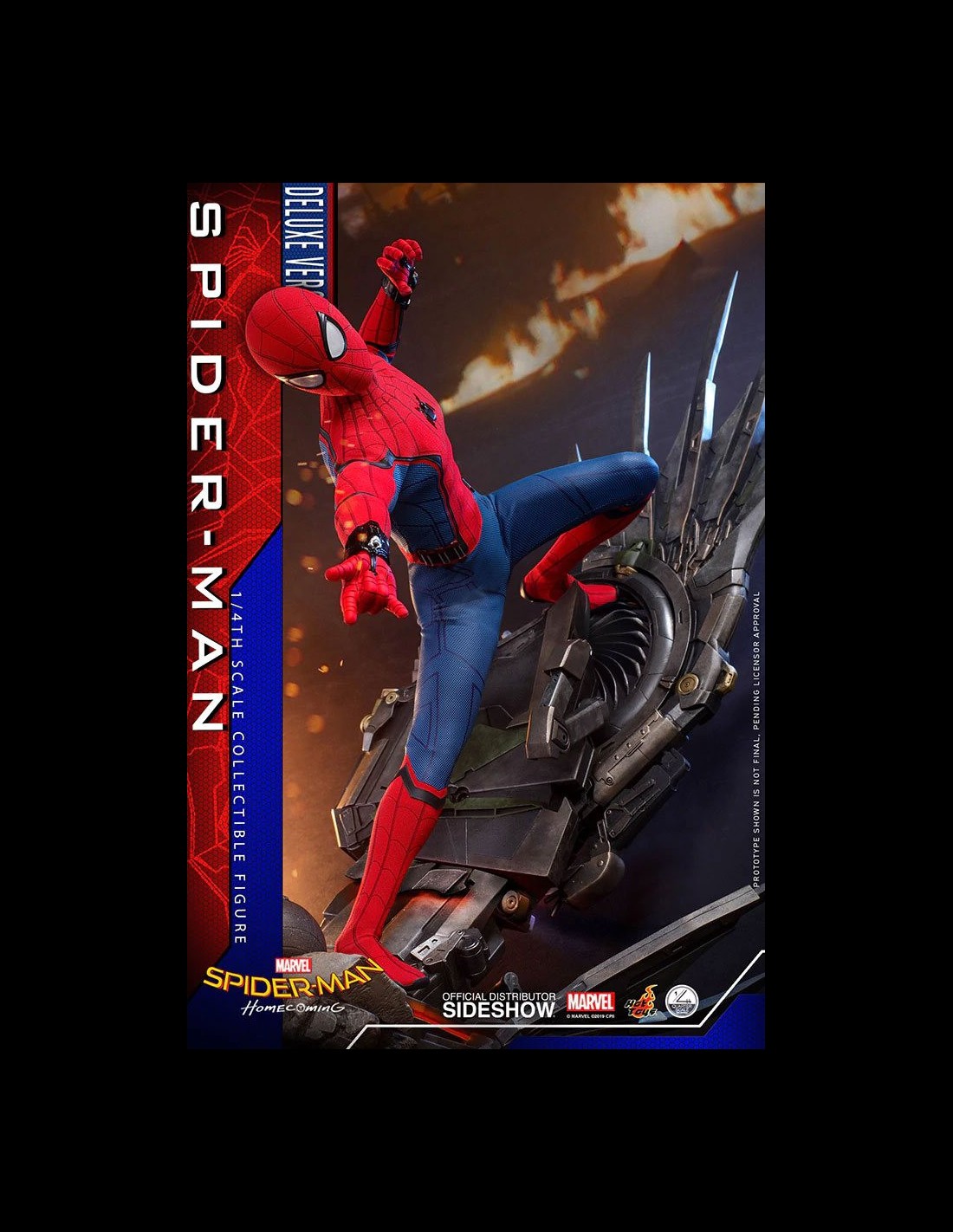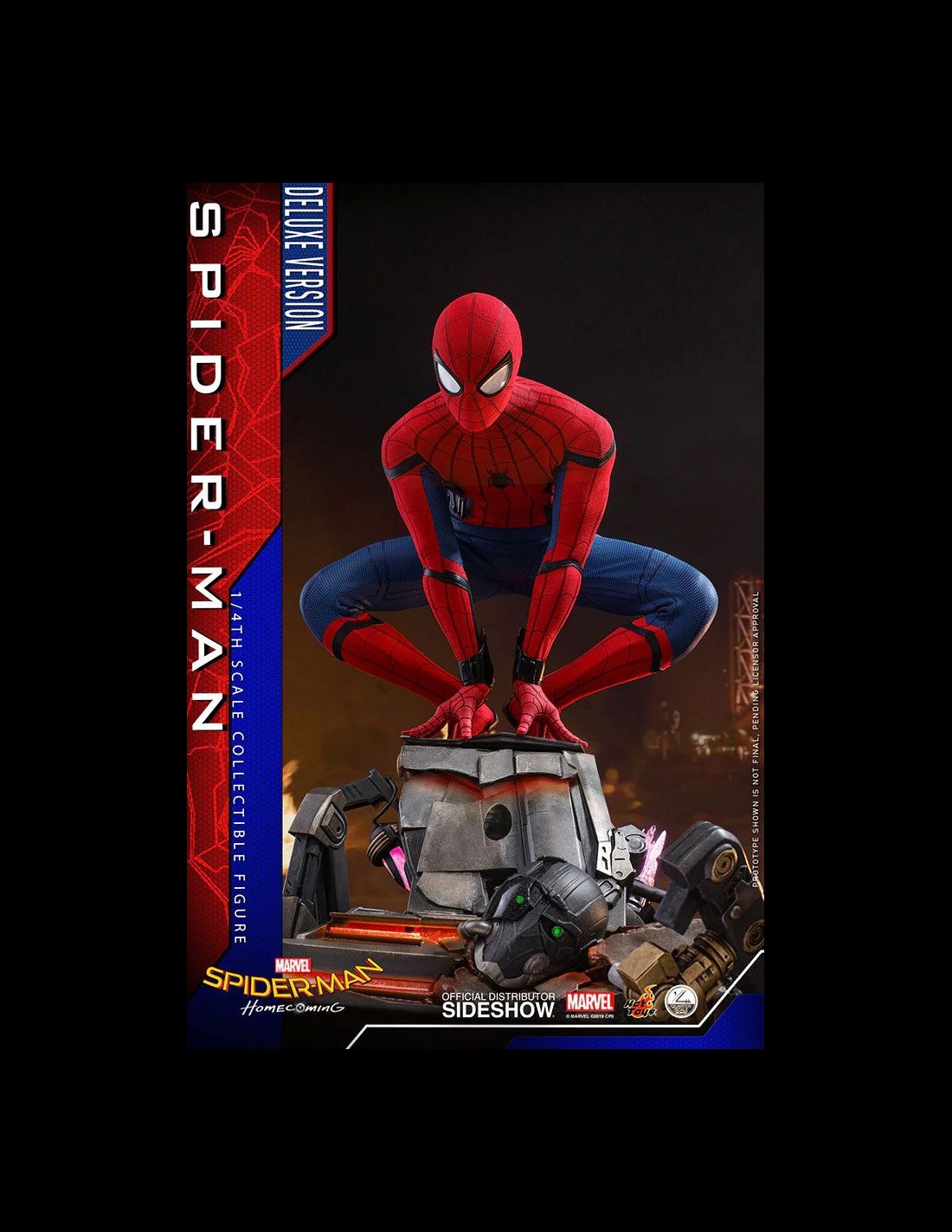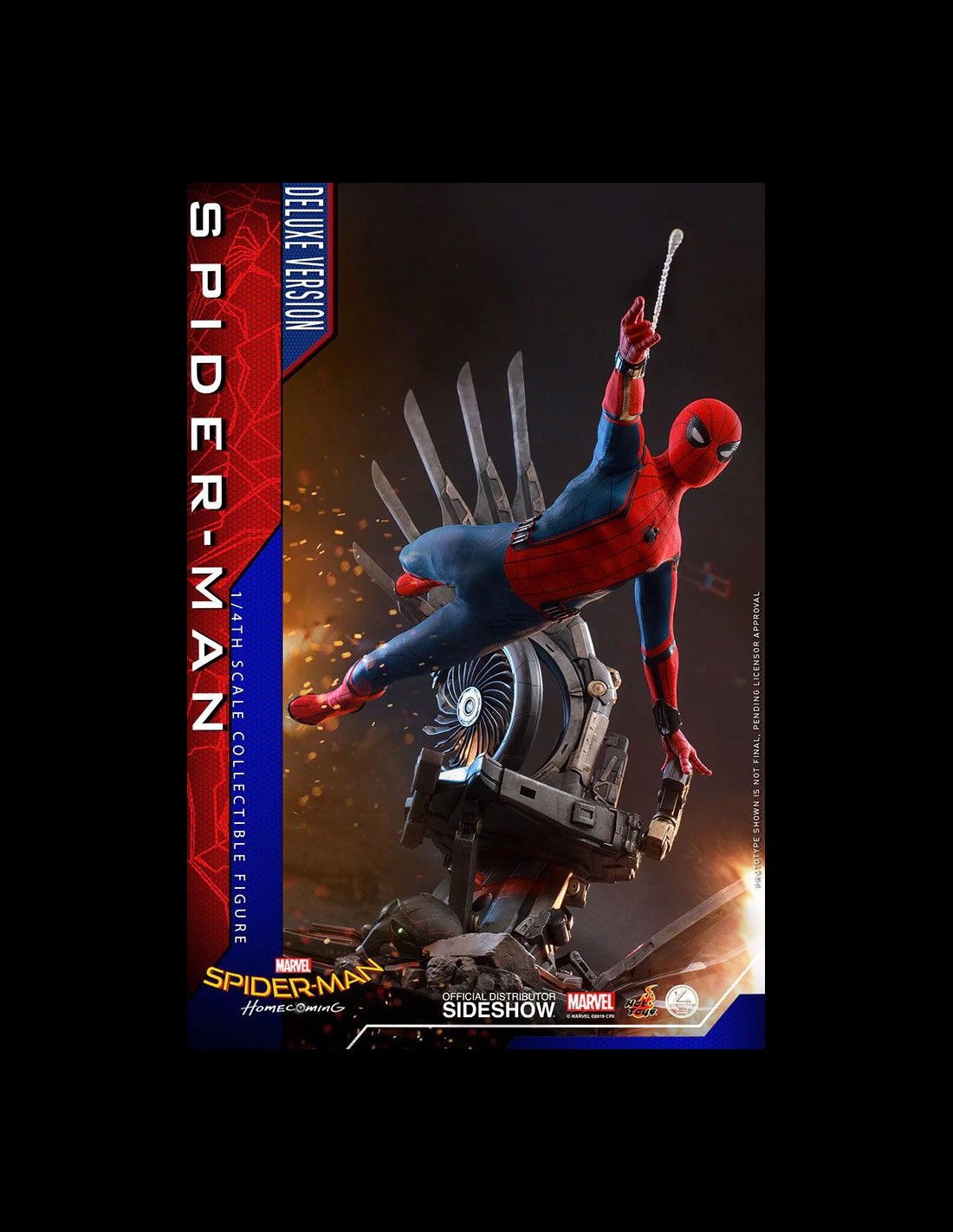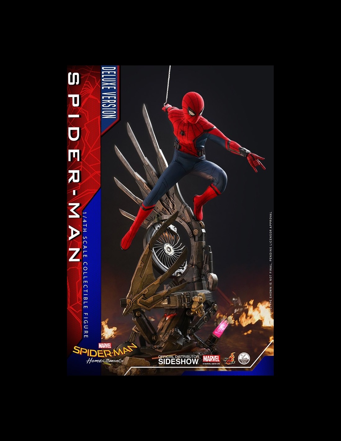 La figura da collezione di Spider-Man in scala 1:4, fedele allo schermo, è realizzata sulla base della tuta da combattimento data a Peter Parker da Tony Stark e presenta una testa mascherata di nuova concezione scolpita con cinque paia di oculari intercambiabili per creare numerose combinazioni di espressioni di Spider-Man . La testa scolpita intercambiabile di nuova concezione ha una notevole somiglianza con Tom Holland. Questa figura vanta un corpo specializzato di nuova concezione che è alto circa 43,5 cm, un costume su misura e molto dettagliato, un paio di ali a ragnatela attaccabili magneticamente, una serie di accessori tra cui uno Spider Drone, una mappatura di proiezione, uno smartphone, uno zaino , una maschera di Spider-Man, una varietà di parti dell'effetto di ripresa della ragnatela e una base di diorama illuminata a LED con due modalità di illuminazione per una visualizzazione alternativa ispirata alla scena del combattimento finale tra Spider-Man e L'Avvoltoio.