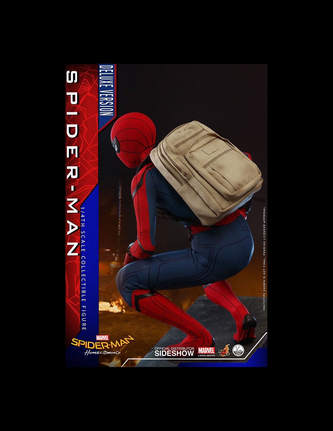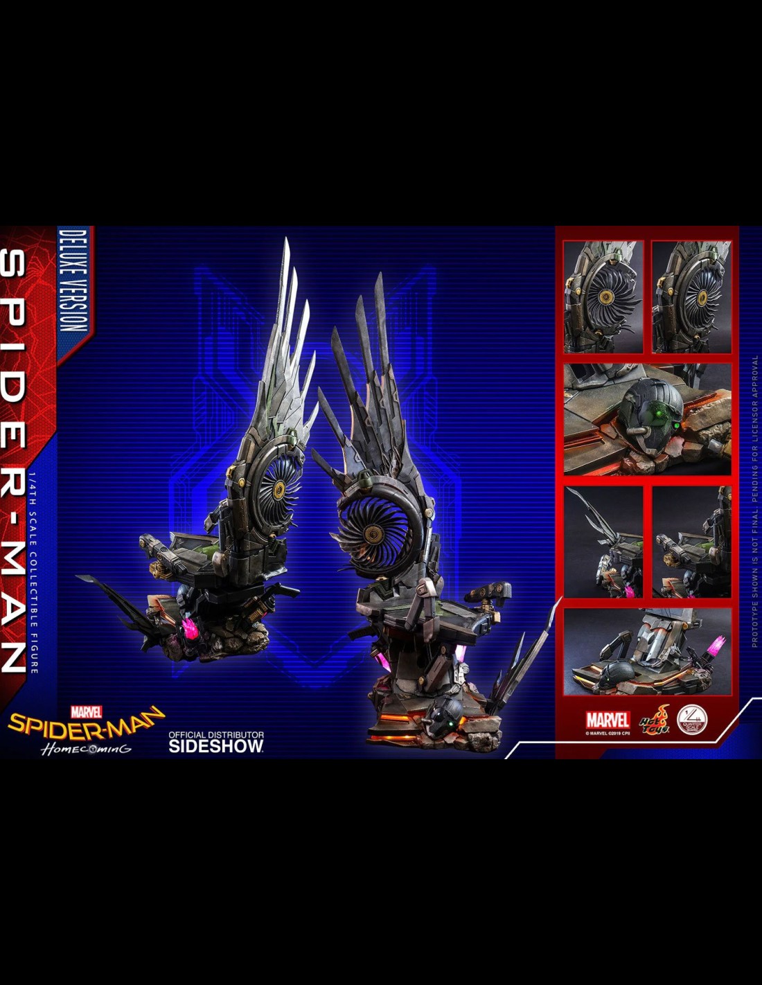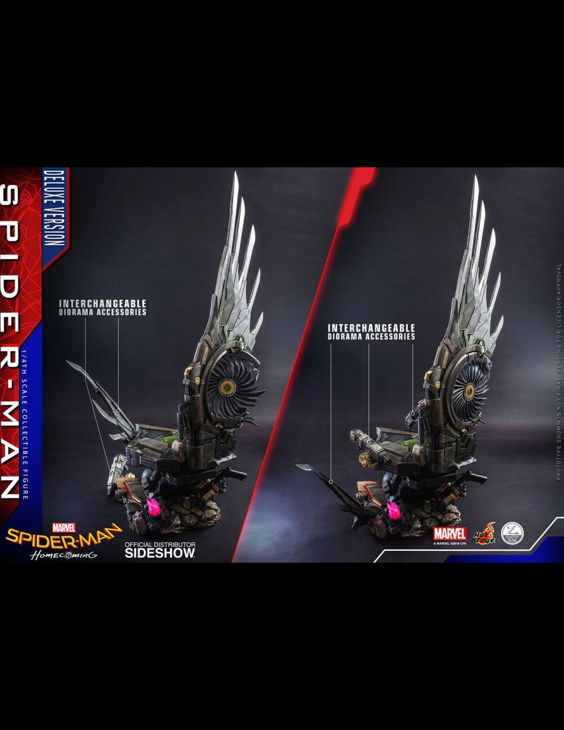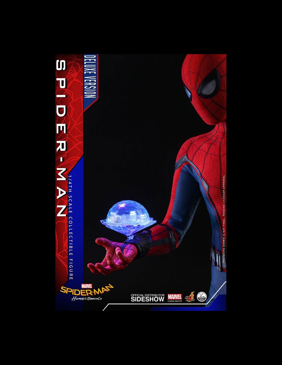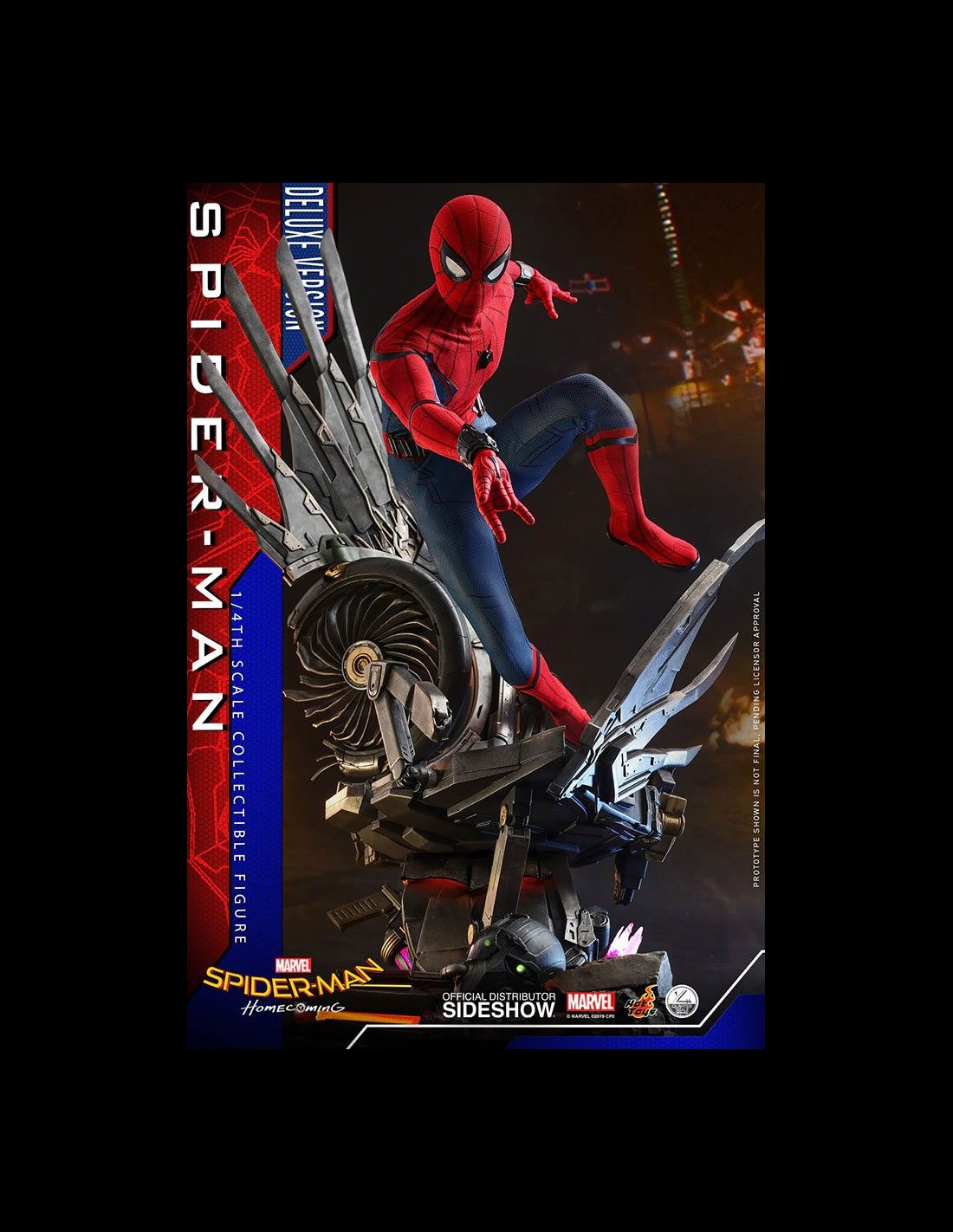 La figura da collezione di Spider-Man in scala 1:4, fedele allo schermo, è realizzata sulla base della tuta da combattimento data a Peter Parker da Tony Stark e presenta una testa mascherata di nuova concezione scolpita con cinque paia di oculari intercambiabili per creare numerose combinazioni di espressioni di Spider-Man . La testa scolpita intercambiabile di nuova concezione ha una notevole somiglianza con Tom Holland. Questa figura vanta un corpo specializzato di nuova concezione che è alto circa 43,5 cm, un costume su misura e molto dettagliato, un paio di ali a ragnatela attaccabili magneticamente, una serie di accessori tra cui uno Spider Drone, una mappatura di proiezione, uno smartphone, uno zaino , una maschera di Spider-Man, una varietà di parti dell'effetto di ripresa della ragnatela e una base di diorama illuminata a LED con due modalità di illuminazione per una visualizzazione alternativa ispirata alla scena del combattimento finale tra Spider-Man e L'Avvoltoio.