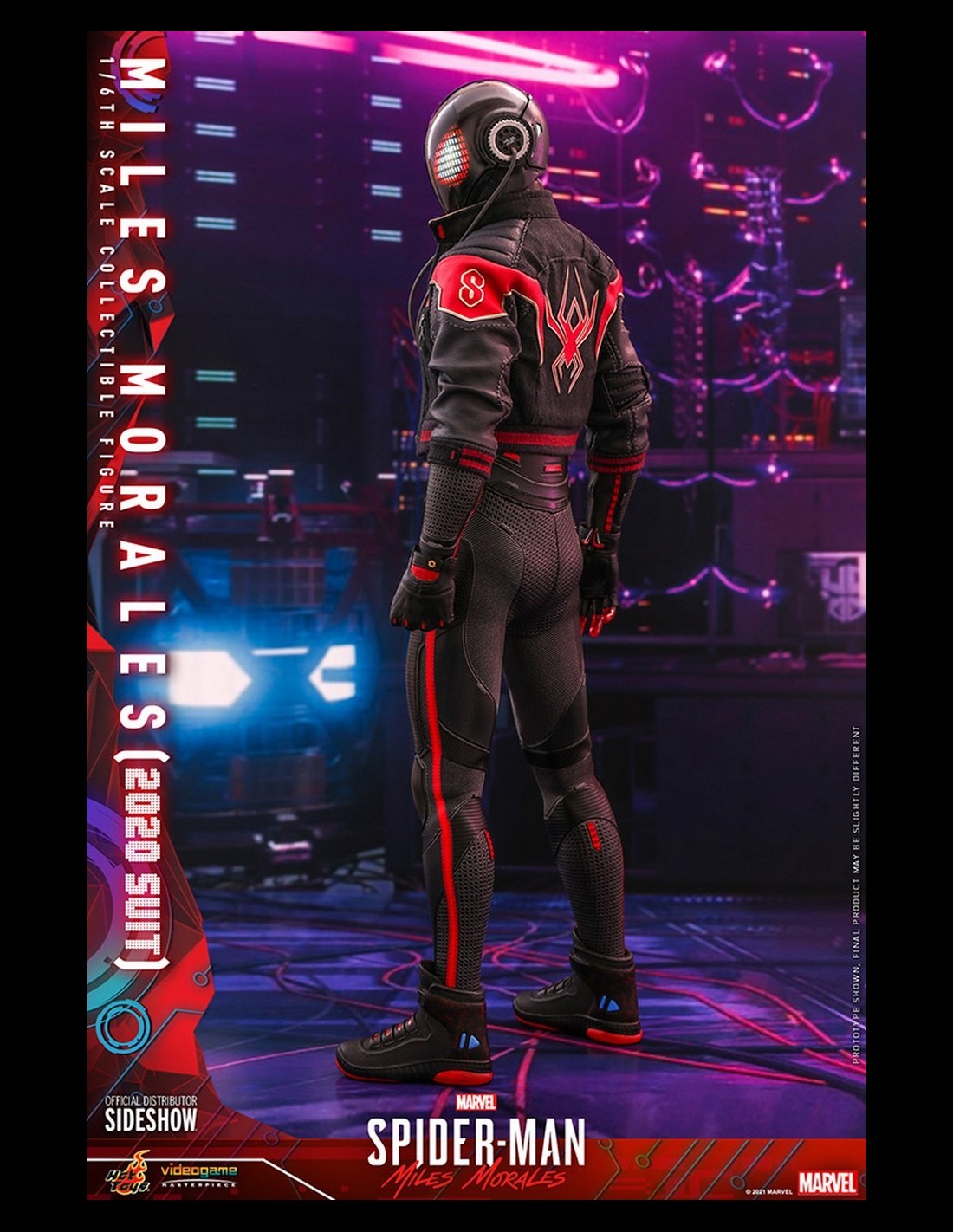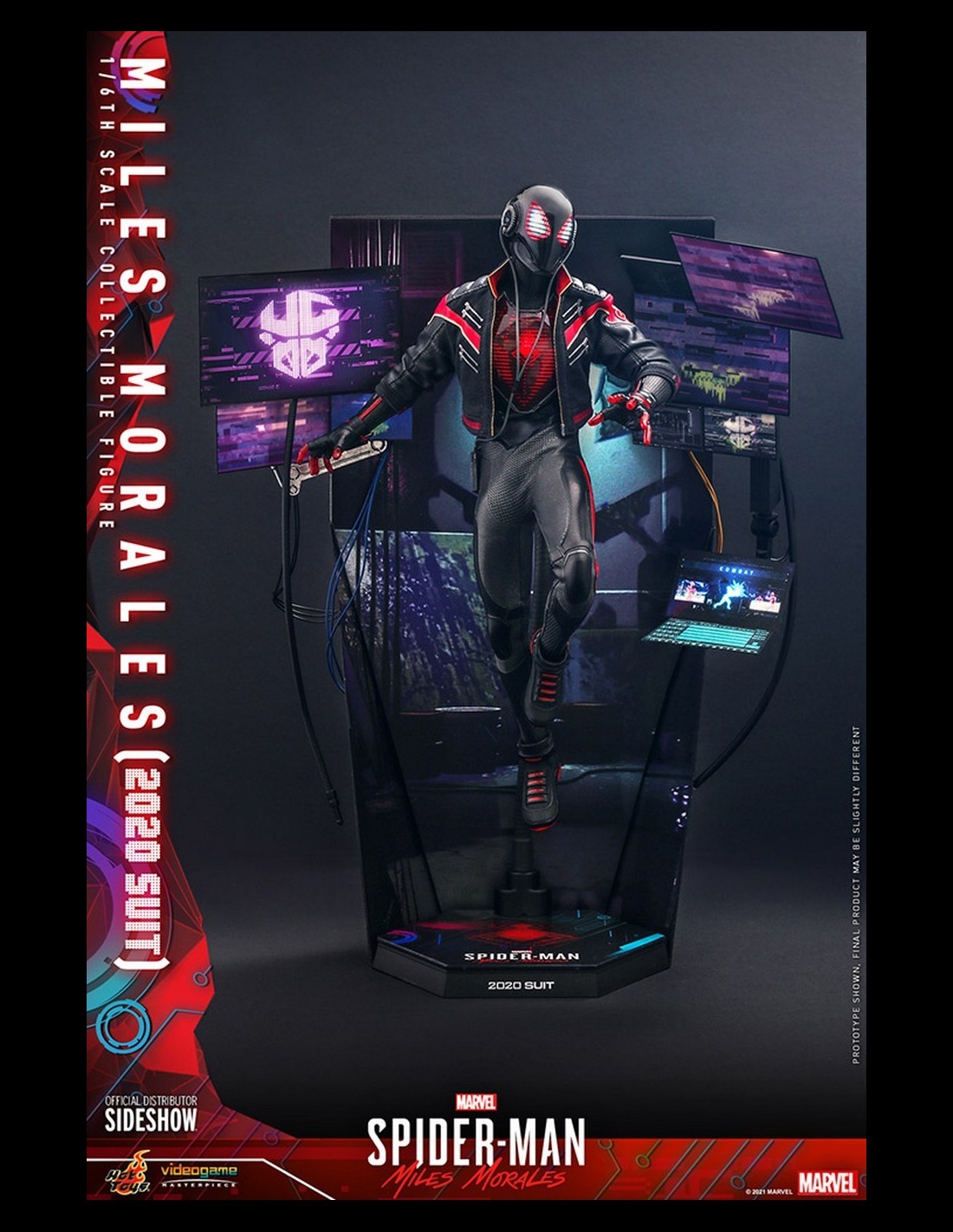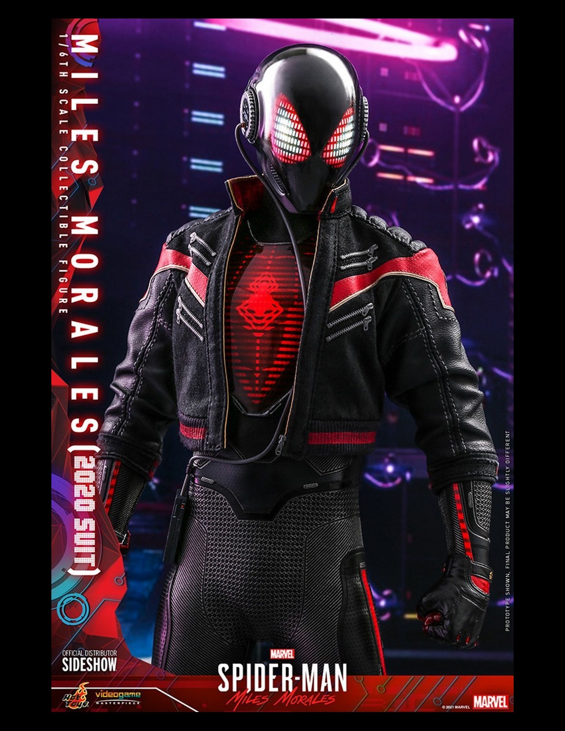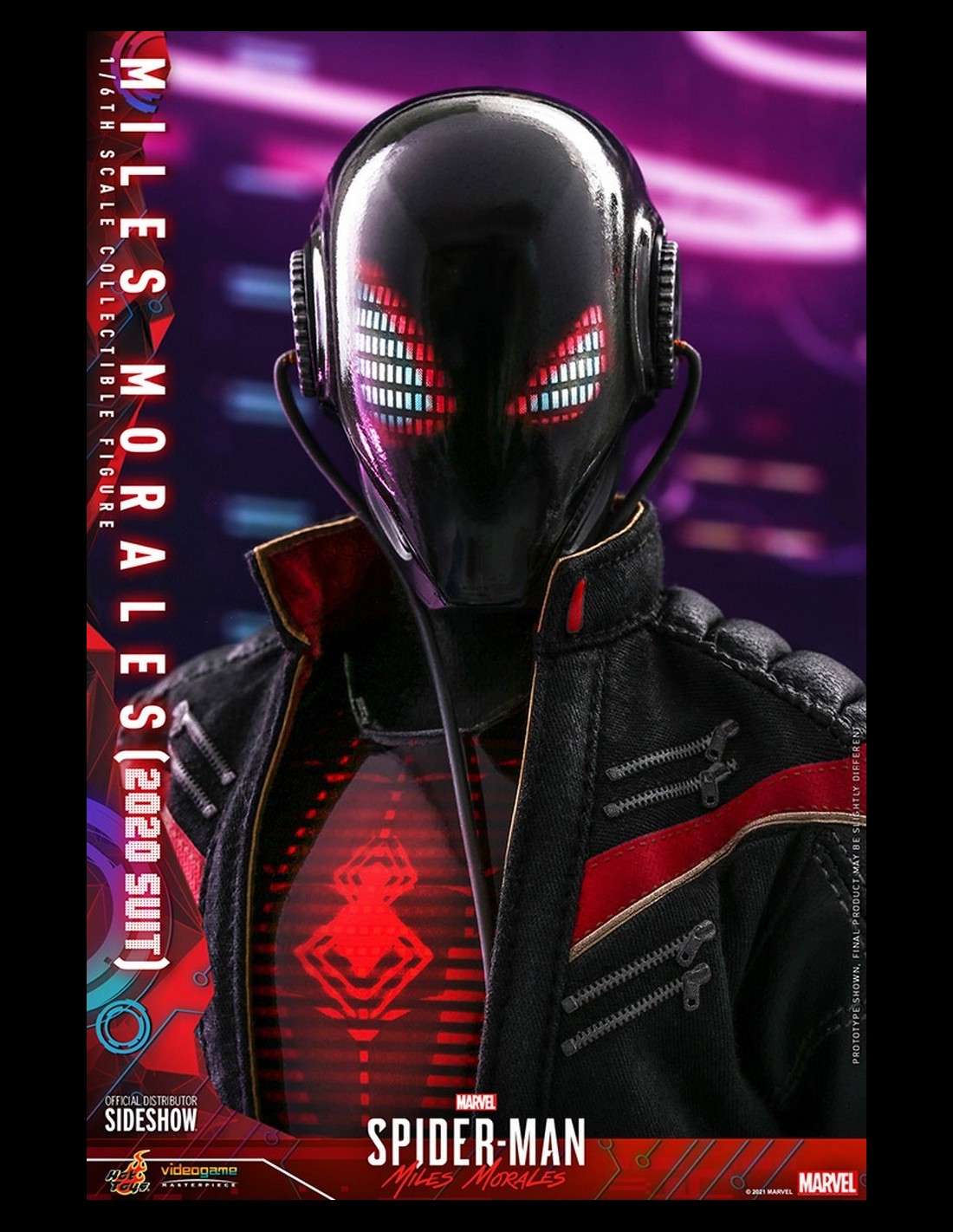 The highly accurate figure is crafted based on Miles Morales in 2020 Suit from the video game, includes a newly crafted masked head with LED light-up function and multiple interchangeable eyepieces for different expressions, a newly developed body, 2020 Suit with LED light-up chest panel to recreate the signature design, faux leather textured jacket with red Spider emblem, interchangeable hands for signature poses, assorted spider-web effect accessories and a dynamic figure stand with cybernetic workshop inspired backdrop for a complete display.