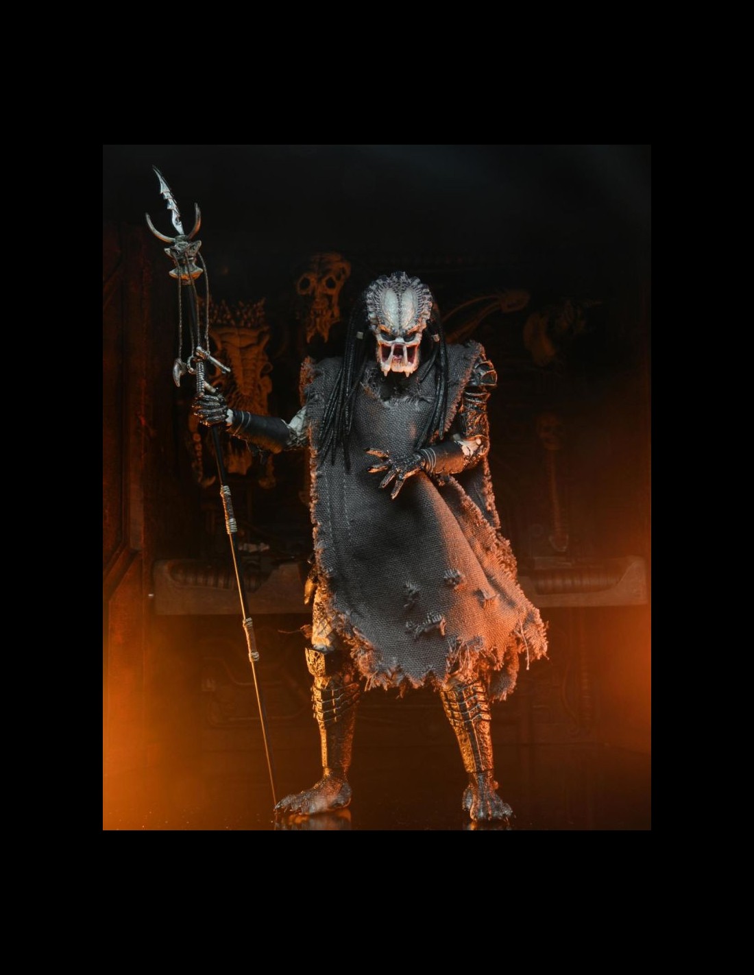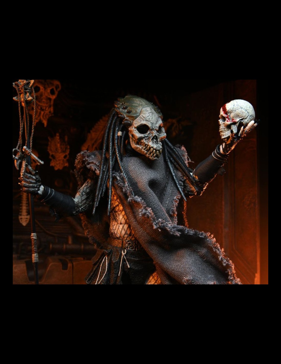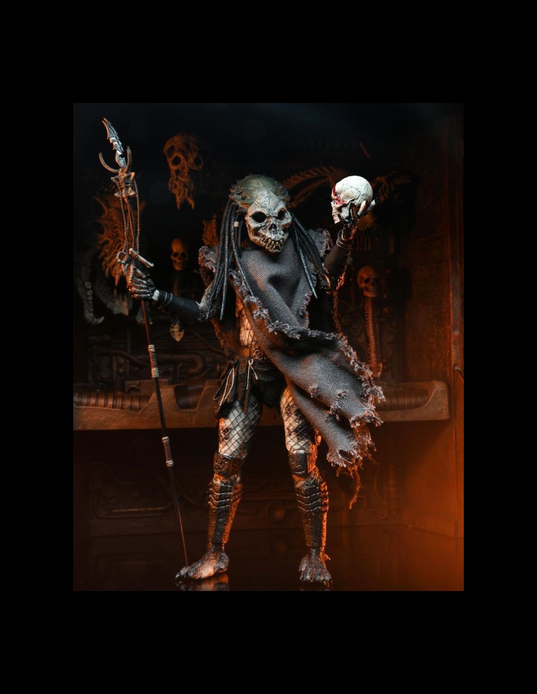 Nuova action figure Ultimate ispirata a Predator: ecco lo Shaman Predator! La figura ha ottimi dettagli ed è dotata di mantello in vera stoffa, bastone, teschio, mani e testa intercambiabili e altro ancora!