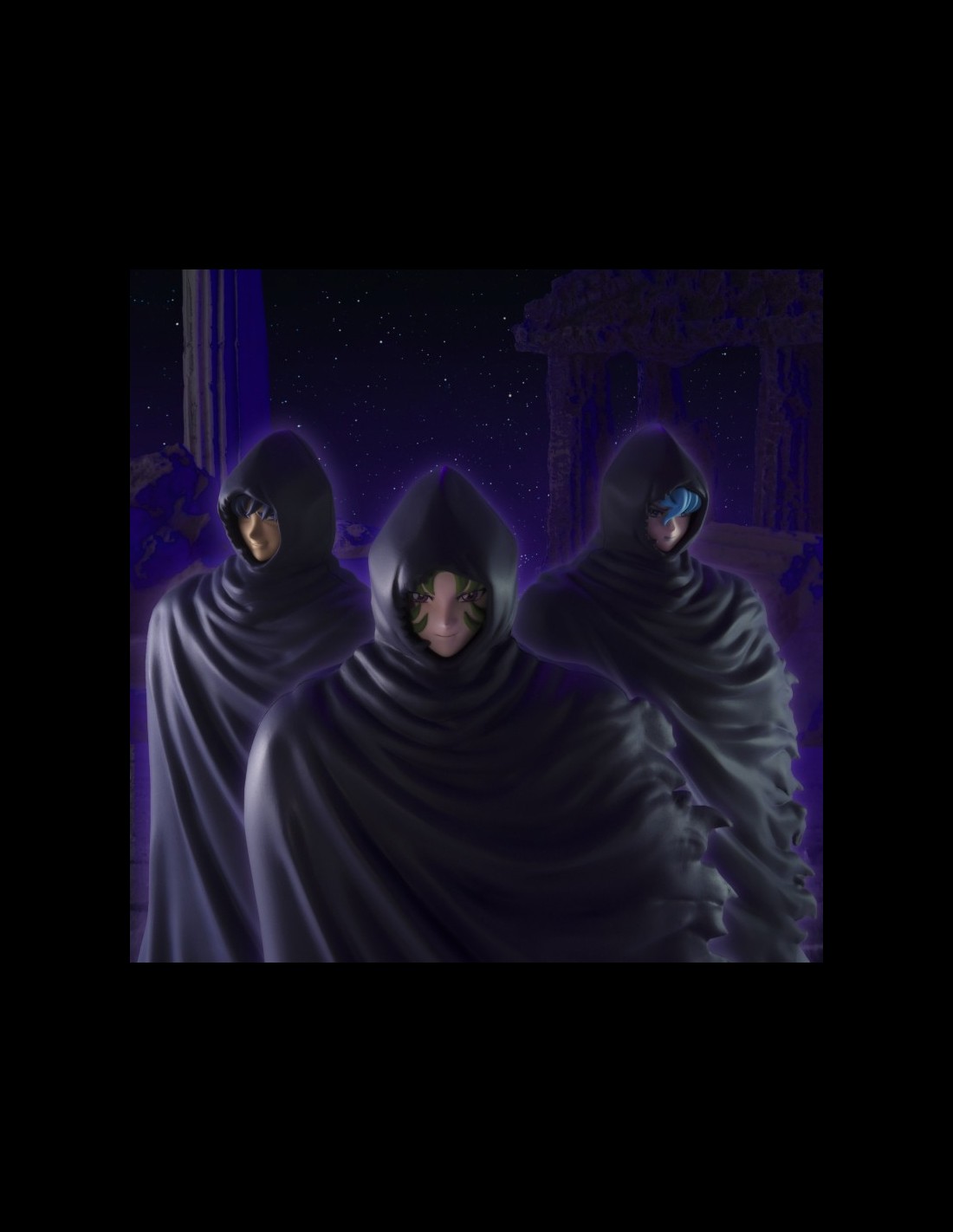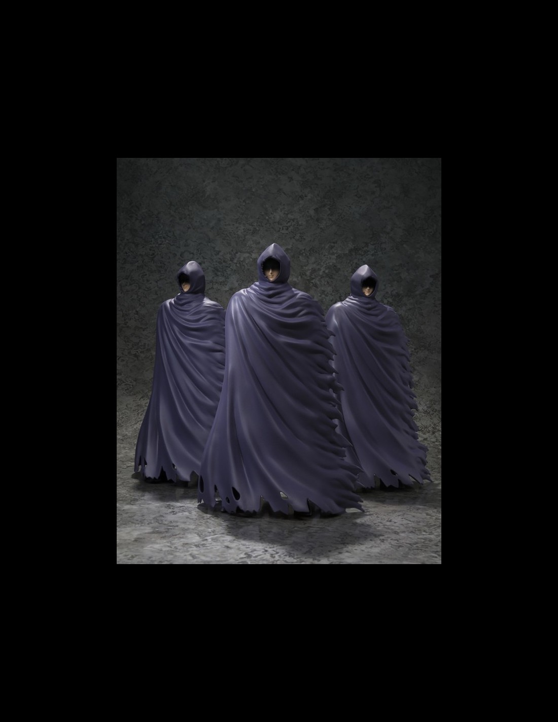 Questi 3 personaggi incappucciati, come apparsi nella saga di Hades, sono figure non articolate da 18cm, in scala con i Myth Cloth, che rappresentano Sion, Deathmask e Aphrodite in questa particolare veste di spettri. Ogni soggetto è dotato di un volto/accessorio extra sostituibile.