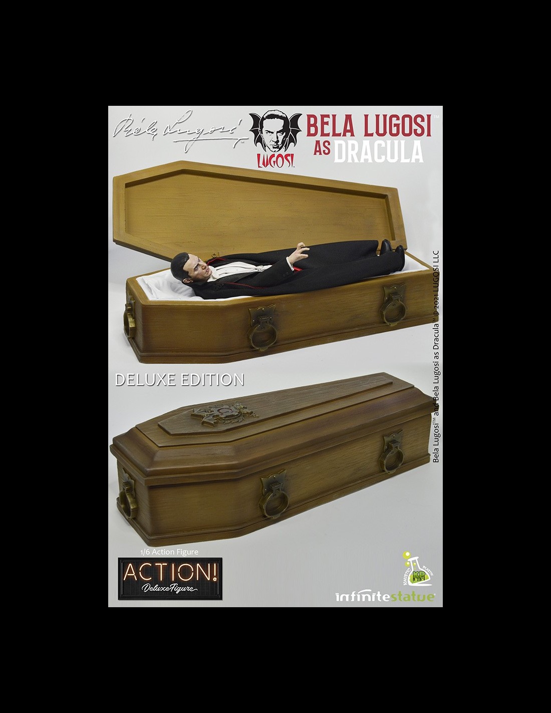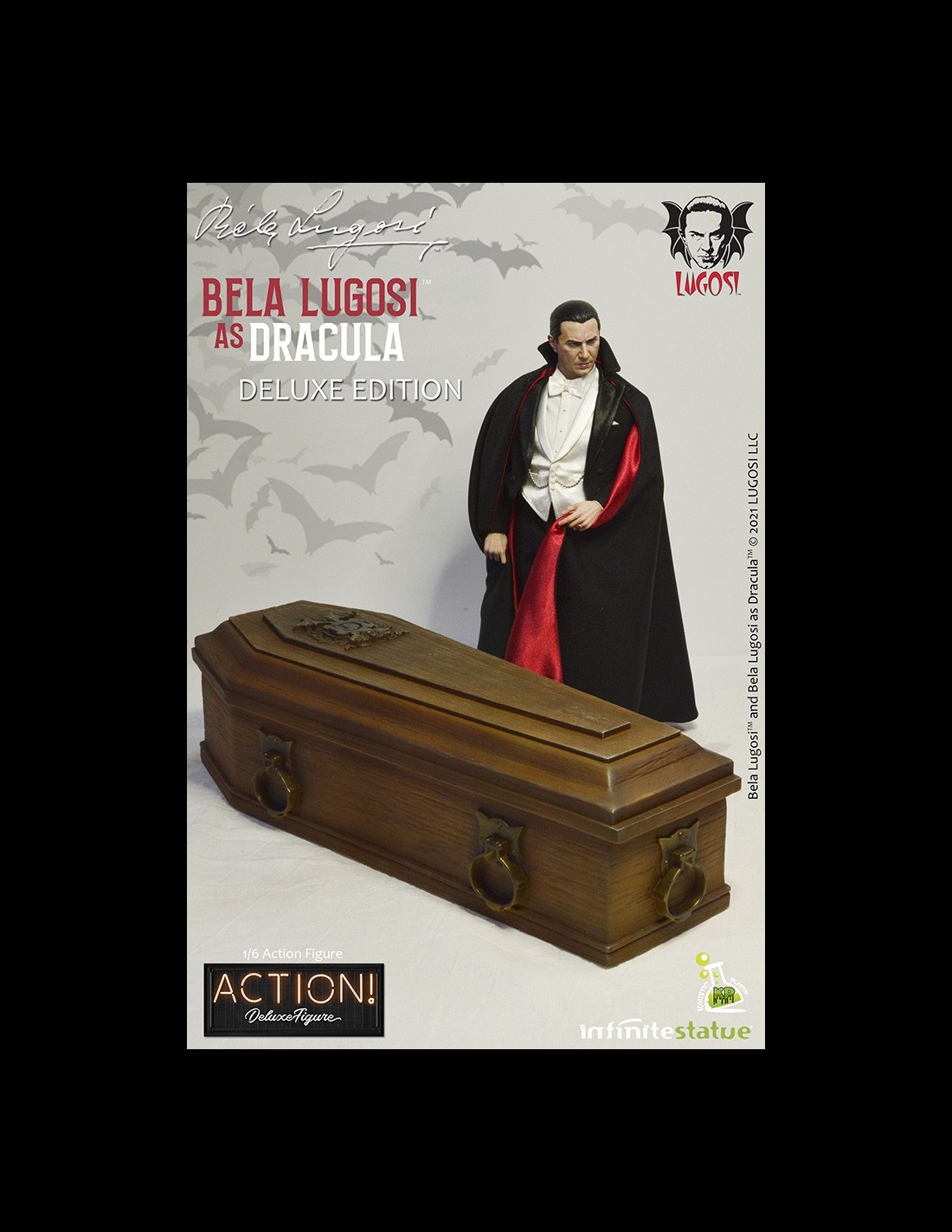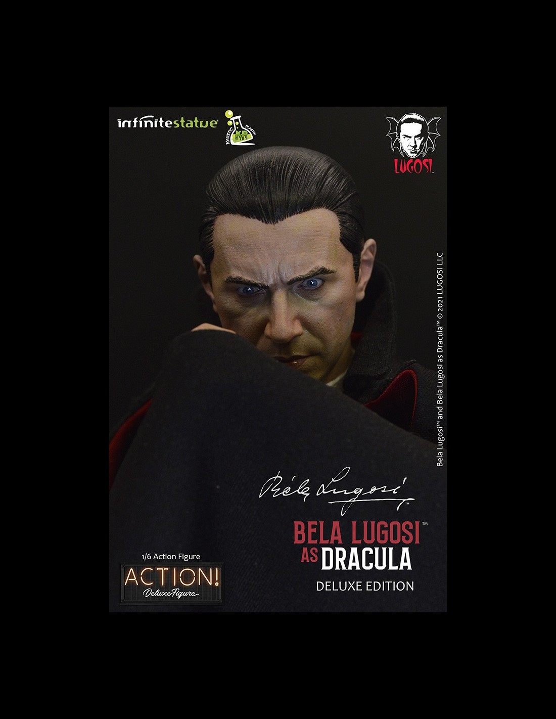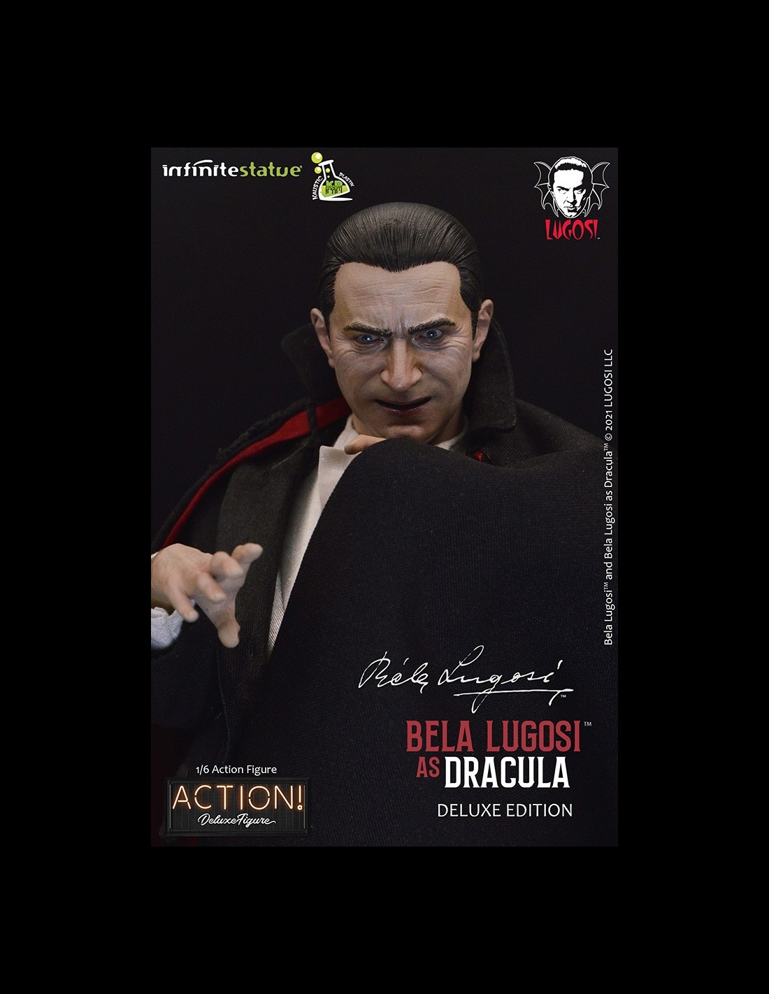 Da Infinite Statue e Kaustic Plastik l’action figure di Bela Lugosi as Dracula Deluxe Edition. Realizzata e dipinta a mano con cura meticolosa e grandi dettagli, Bela Lugosi action figure è in scala 1/6 con vestiti in stoffa e include accessori e parti intercambiabili esclusivi per questa Deluxe Edition.