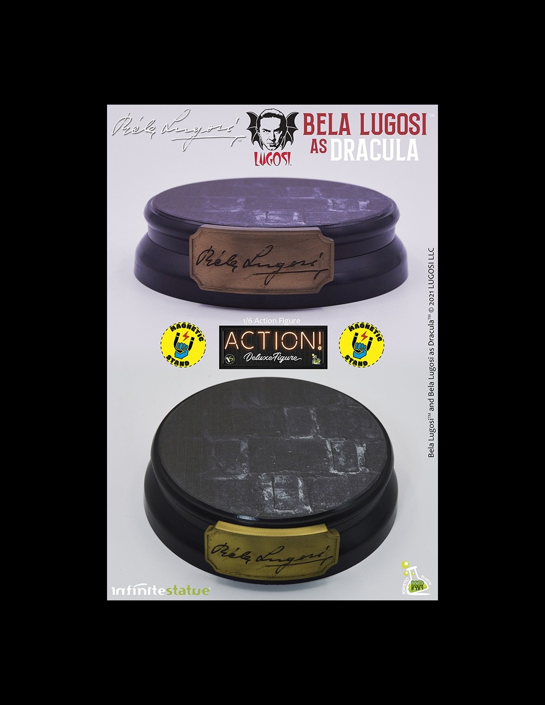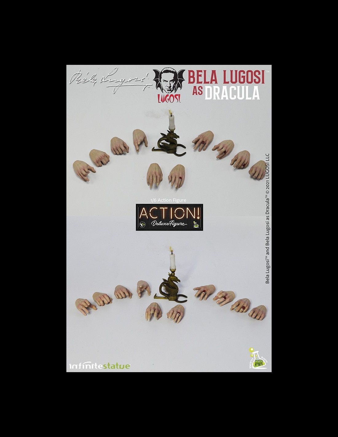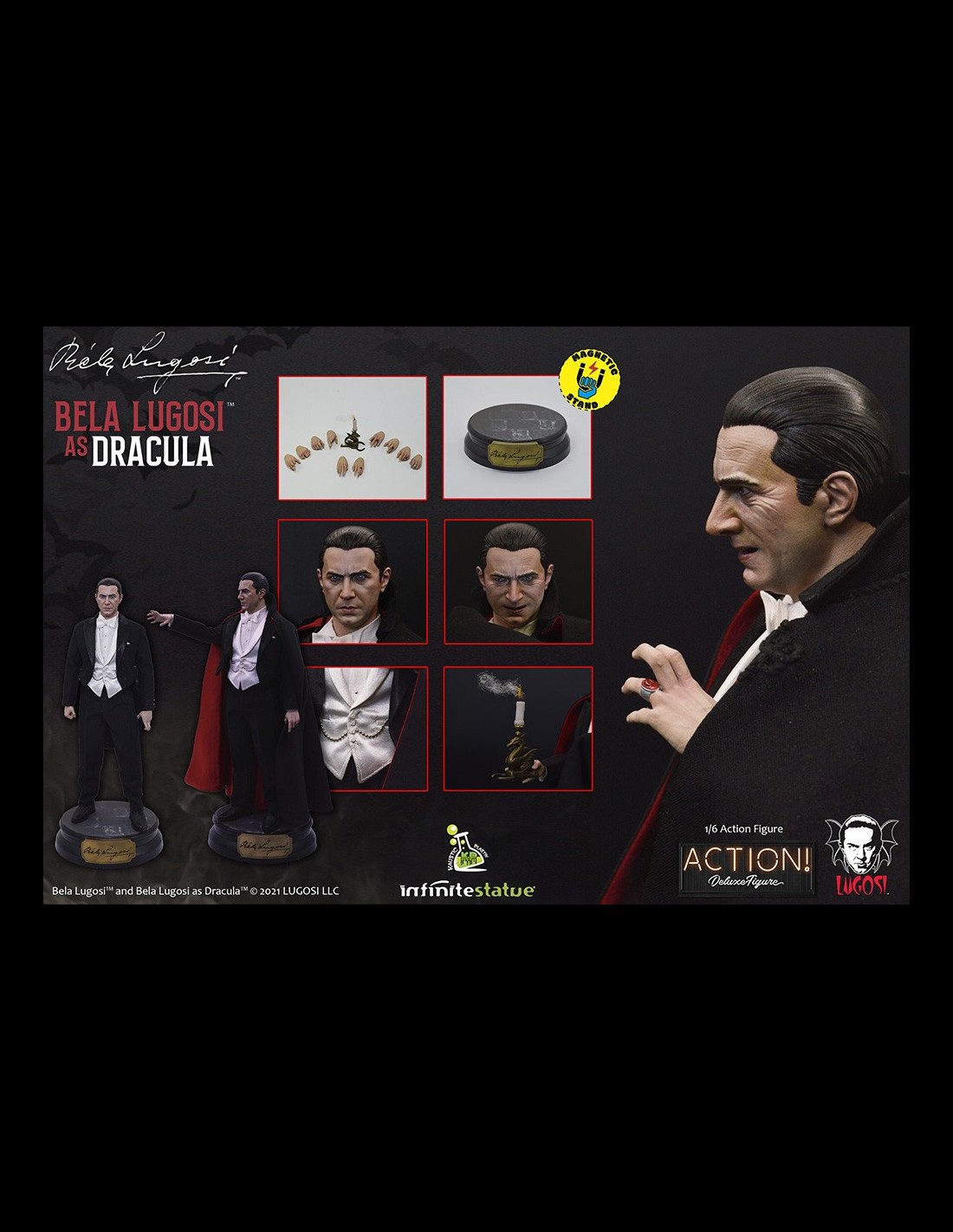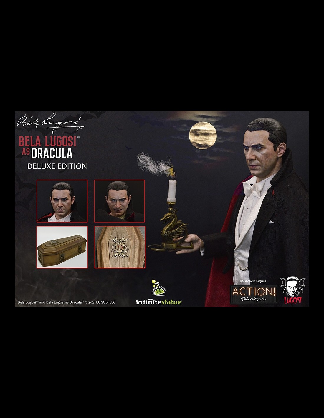 Da Infinite Statue e Kaustic Plastik l’action figure di Bela Lugosi as Dracula Deluxe Edition. Realizzata e dipinta a mano con cura meticolosa e grandi dettagli, Bela Lugosi action figure è in scala 1/6 con vestiti in stoffa e include accessori e parti intercambiabili esclusivi per questa Deluxe Edition.