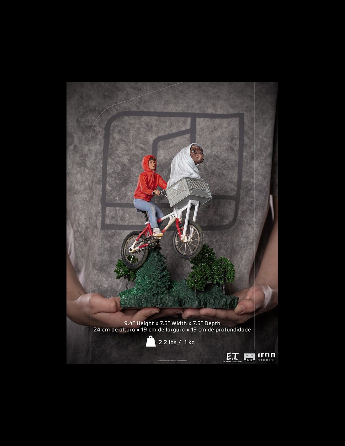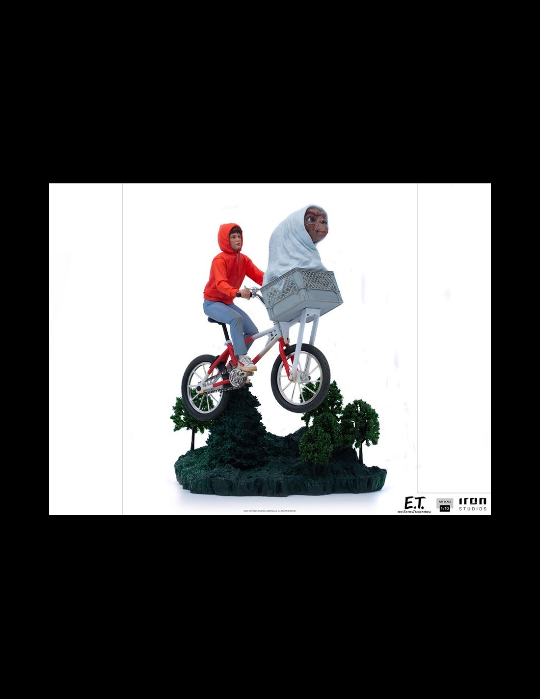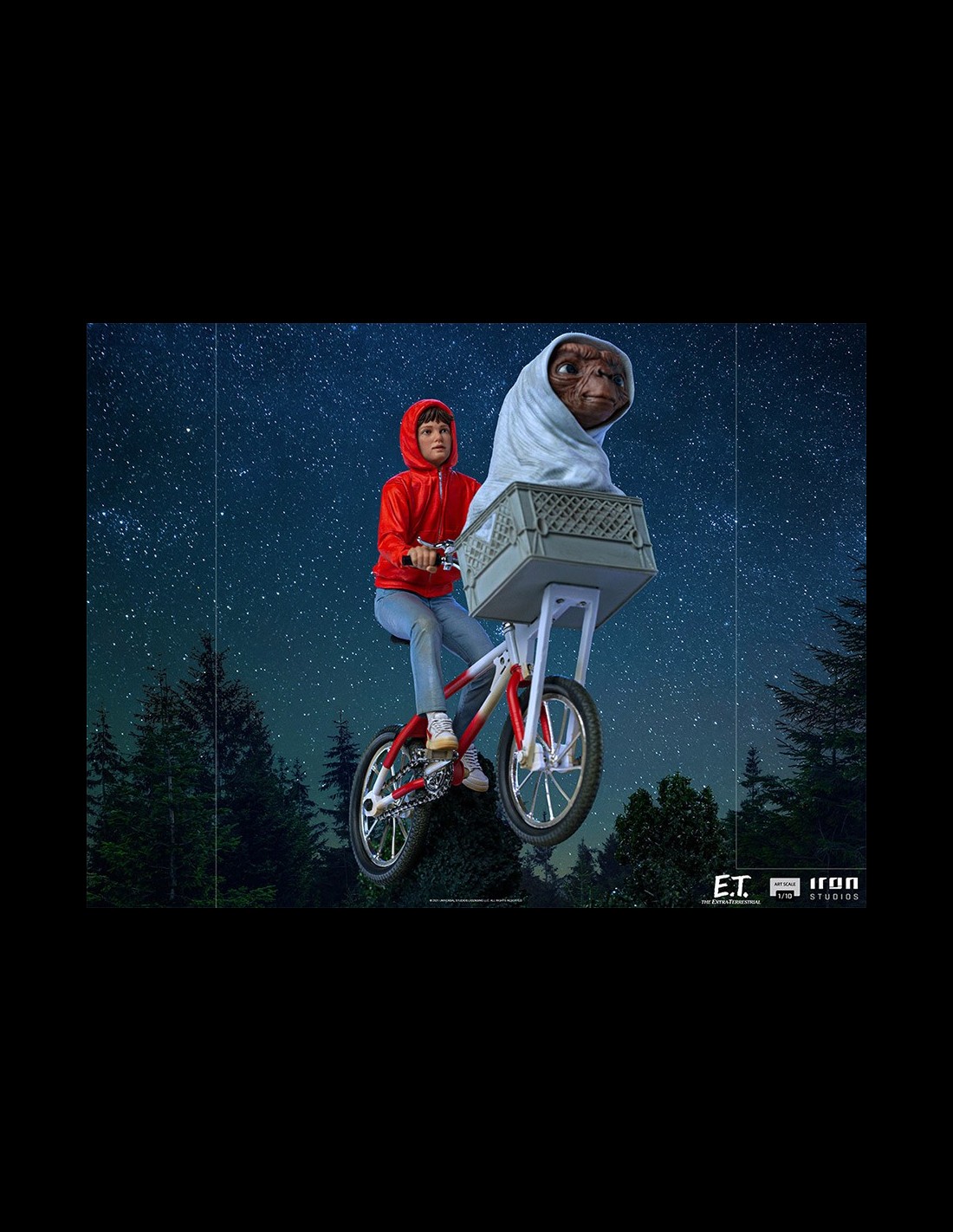 A boy carries in his bicycle basket, wrapped in a white sheet, an unusual friend, a small alien lost on Earth that is being pursued by government forces. In their flight to find their fellow men and return to his world, the two friends run towards a California forest, where the spacecraft that will rescue him must land. To escape a police blockade, the little alien uses its telekinetic abilities to levitate the bike, lifting them into the air and flying over the trees towards their destination. This anthological scene, which has the moon as a backdrop, was also used in the promotion of the film, becoming one of the best known and most striking images in cinema, even becoming the logo of Amblin Entertainment, Steven Spielberg's film producer, and now also proudly replicated with the statue "ET & Elliot - Art Scale 1/10 Deluxe - ET - Iron Studios" and "E.T. & Elliot - Art Scale 1/10 - E.T. - Iron Studios".