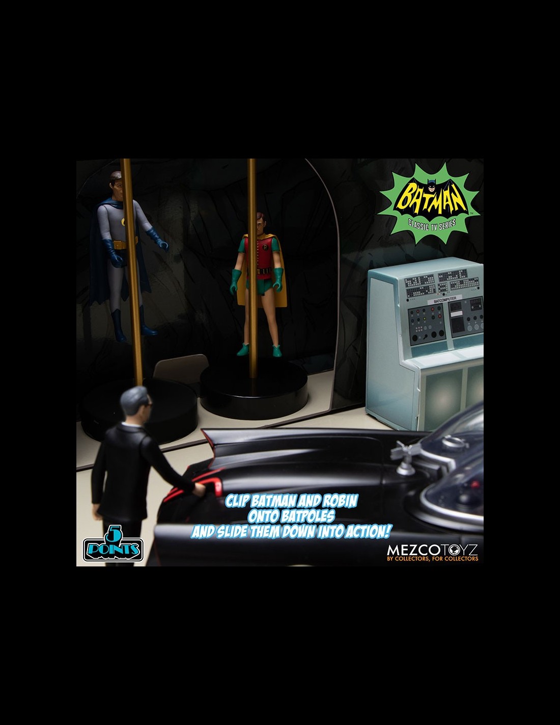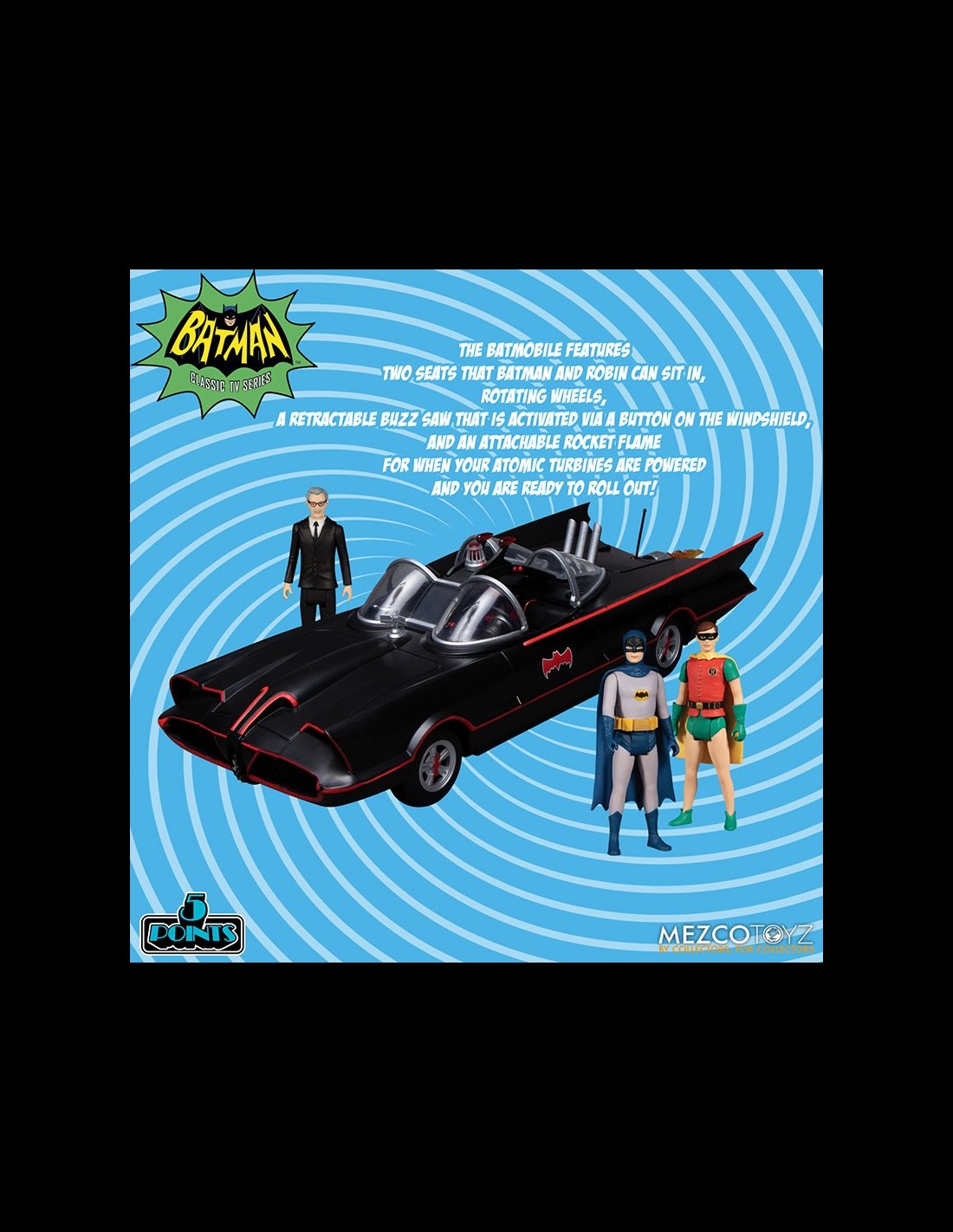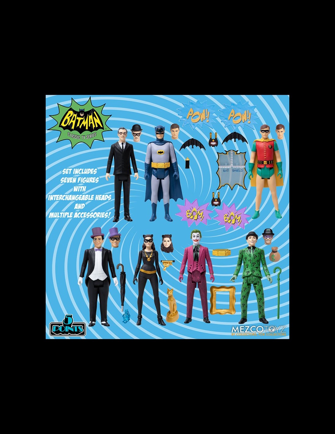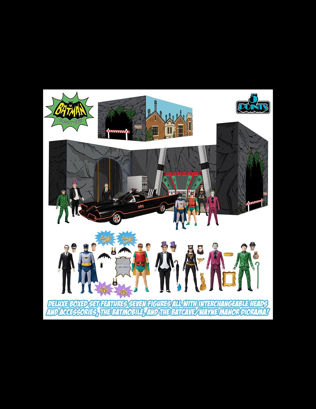 La serie 5 Points di Mezco è dedicata ad action figure di celebri personaggi della cultura pop caratterizzate dal look vintage! Il nuovo set è ispirato alla mitica serie TV di Batman degli anni '60! Il box incclude 7 action figures, la Batmobile (con ruote funzionanti) e uno scenario per ricreare la Batcave! Ogni figura dispone di una testa intercambiabile e di accessori. Imperdibile per gli appassionati di Batman!