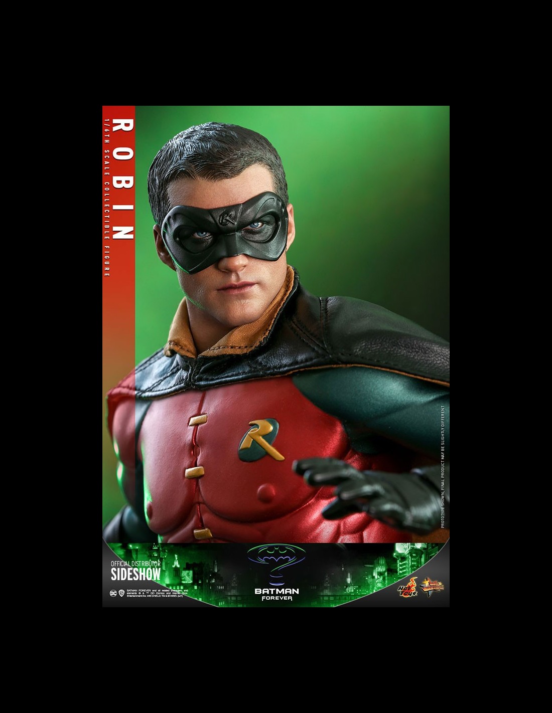 La figura estremamente accurata è appositamente realizzata in base all'immagine di Robin, con una testa scolpita di nuova concezione con una somiglianza sbalorditiva che traduce perfettamente i dettagli tra cui la maschera facciale, un corpo con la ricostruzione dettagliata del costume iconico con il ' Logo R ' con un sottile luccichio metallico, ed una base espositiva.