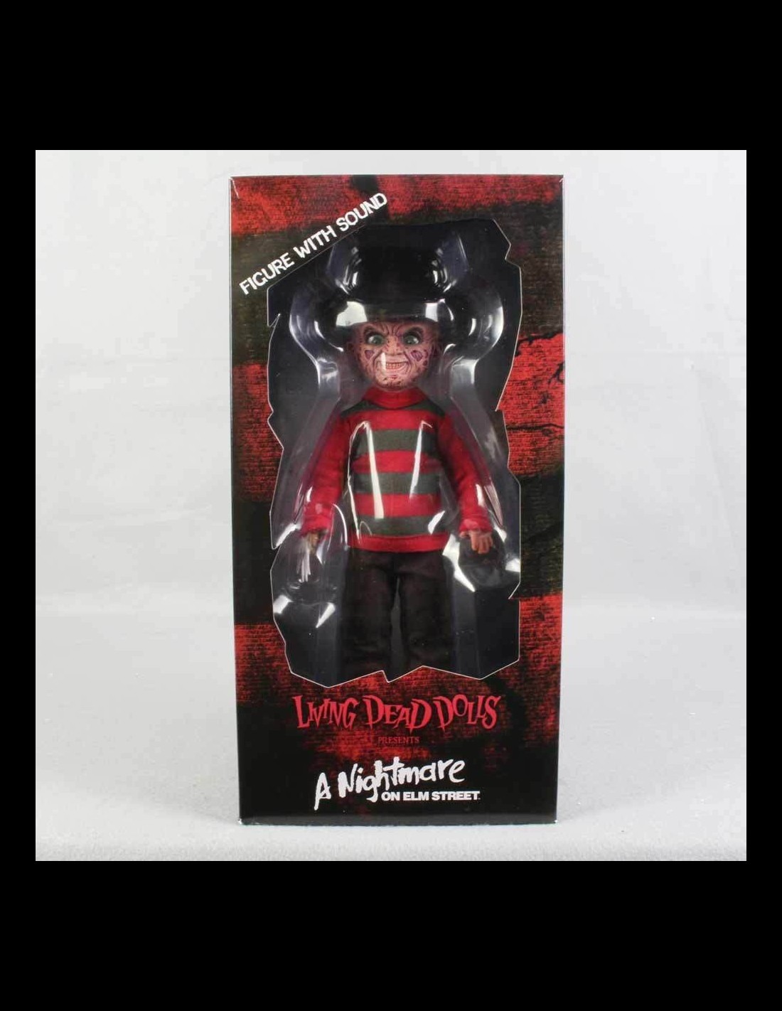 La terrificante figura di Nightmare entra a far parte della serie Living Dead Dolls di Mezco! La figura ha 5 punti di articolazione ed è vestita con i classici abiti visti nel film, in vera stoffa. Alta circa 28 cm la bambola è dotata anche di effetti sonori.