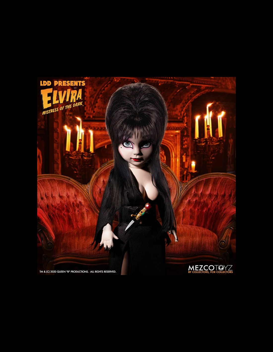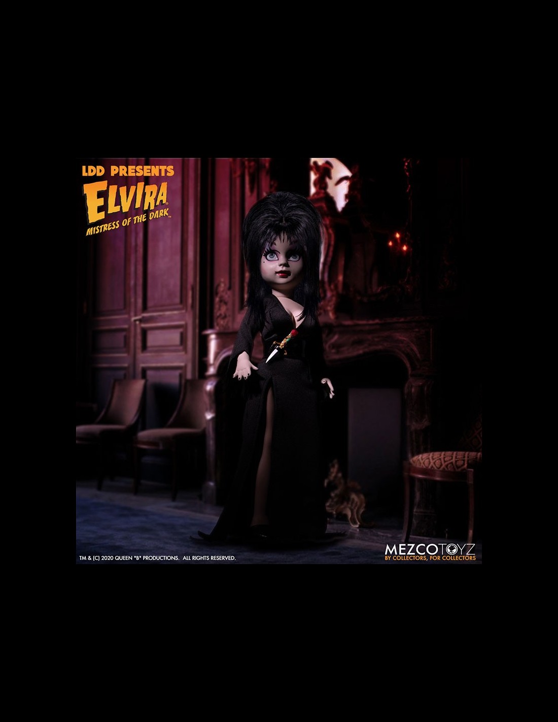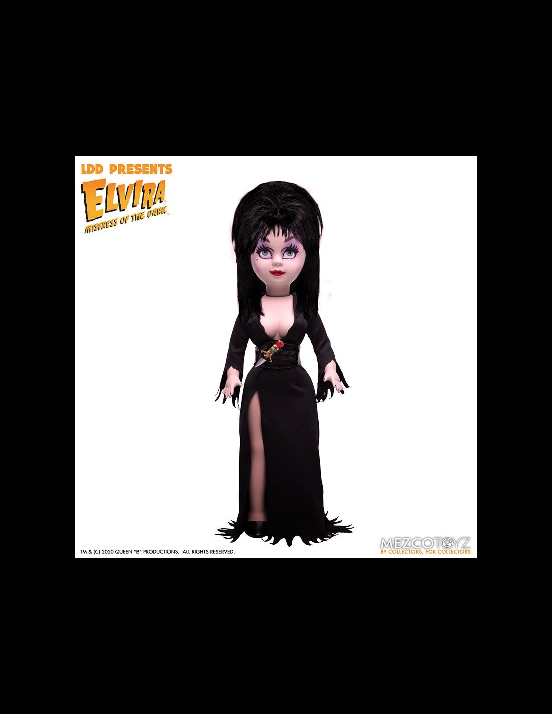 Elvira Mistress of the Dark, icona dell'horror e di tutto ciò che è spaventoso, entra nella serie Living Dead Dolls di Mezco! La doll è vestita di un dettagliato abito in vera stoffa, completo di pugnale. Da non perdere!
