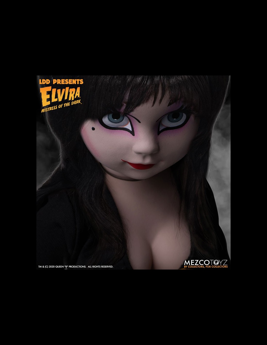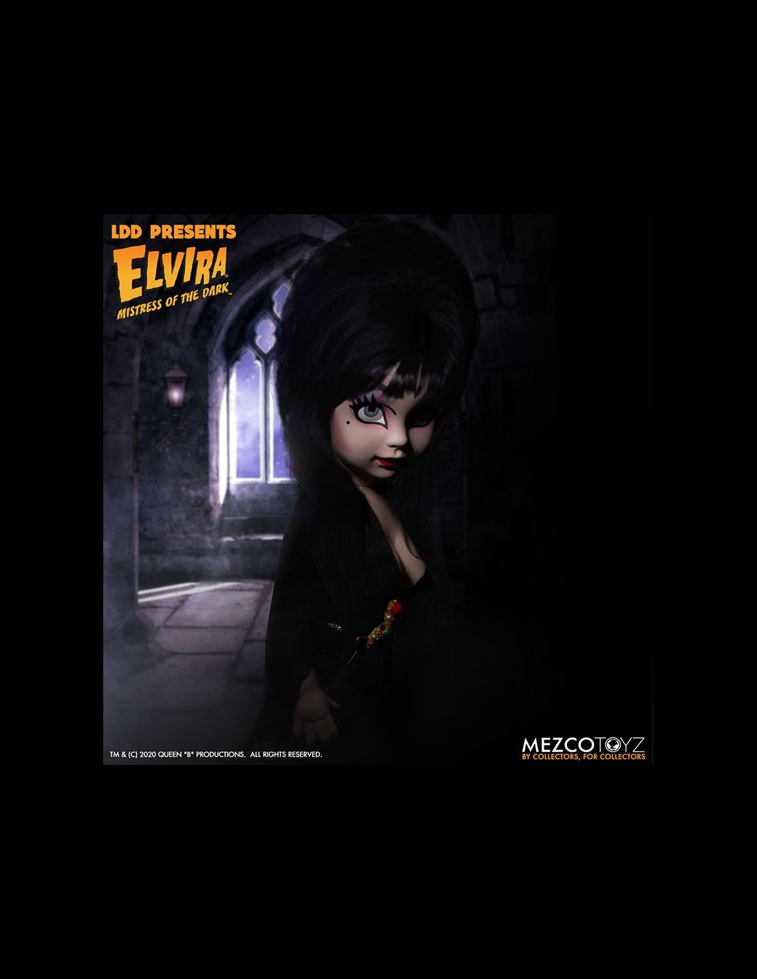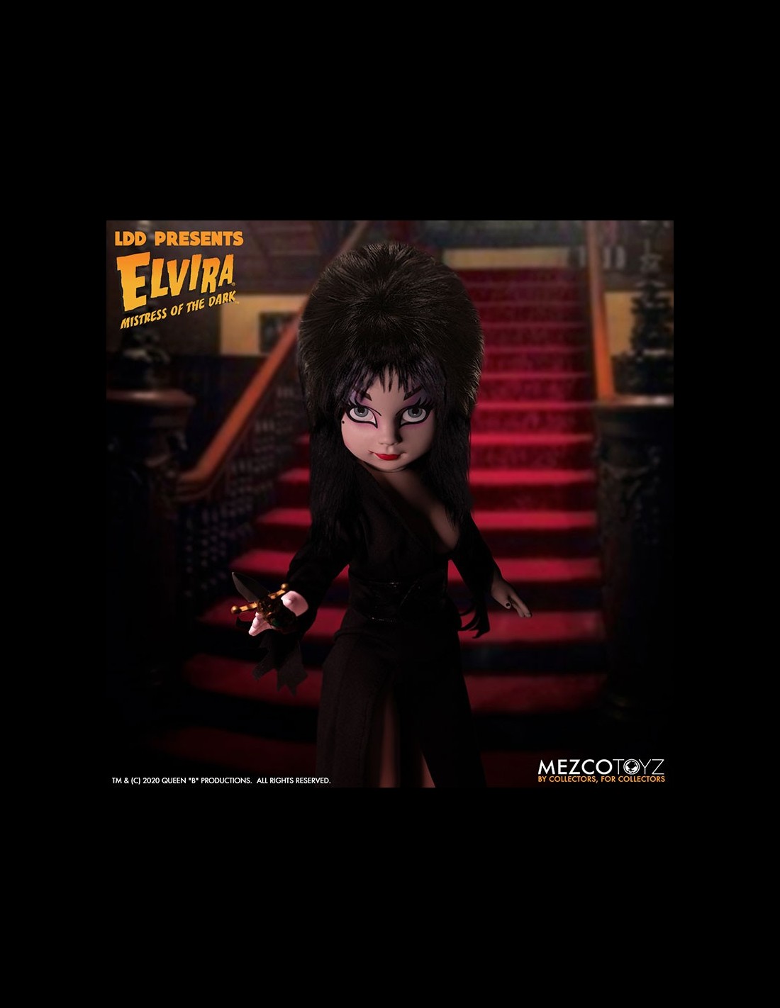 Elvira Mistress of the Dark, icona dell'horror e di tutto ciò che è spaventoso, entra nella serie Living Dead Dolls di Mezco! La doll è vestita di un dettagliato abito in vera stoffa, completo di pugnale. Da non perdere!