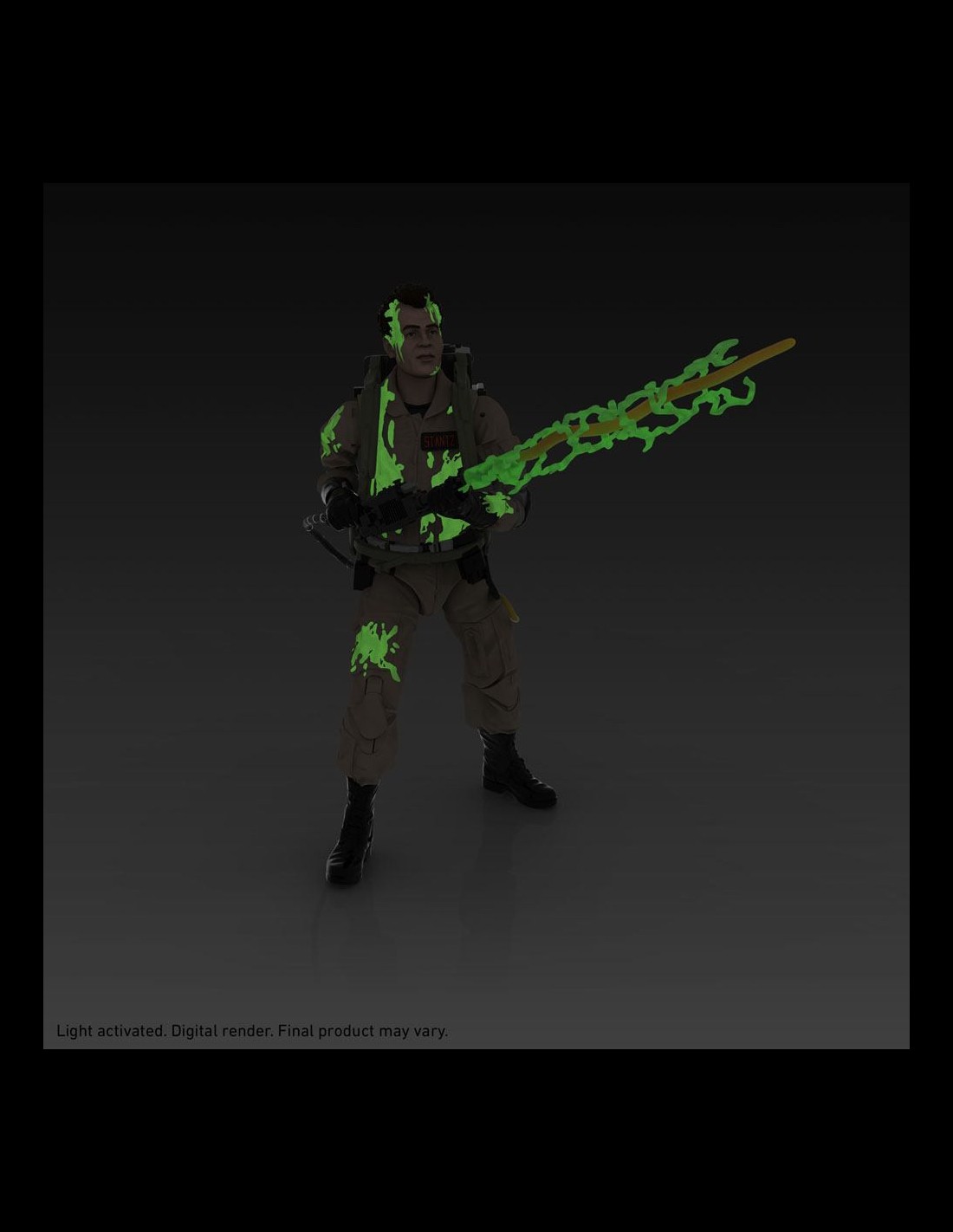 GLOW-IN-THE-DARK FIGURE: This Ray Stantz action figure features glow-in-the-dark ecto-plasm deco for that supernatural "slimed" look. To charge glow-in-the-dark effect, place under light