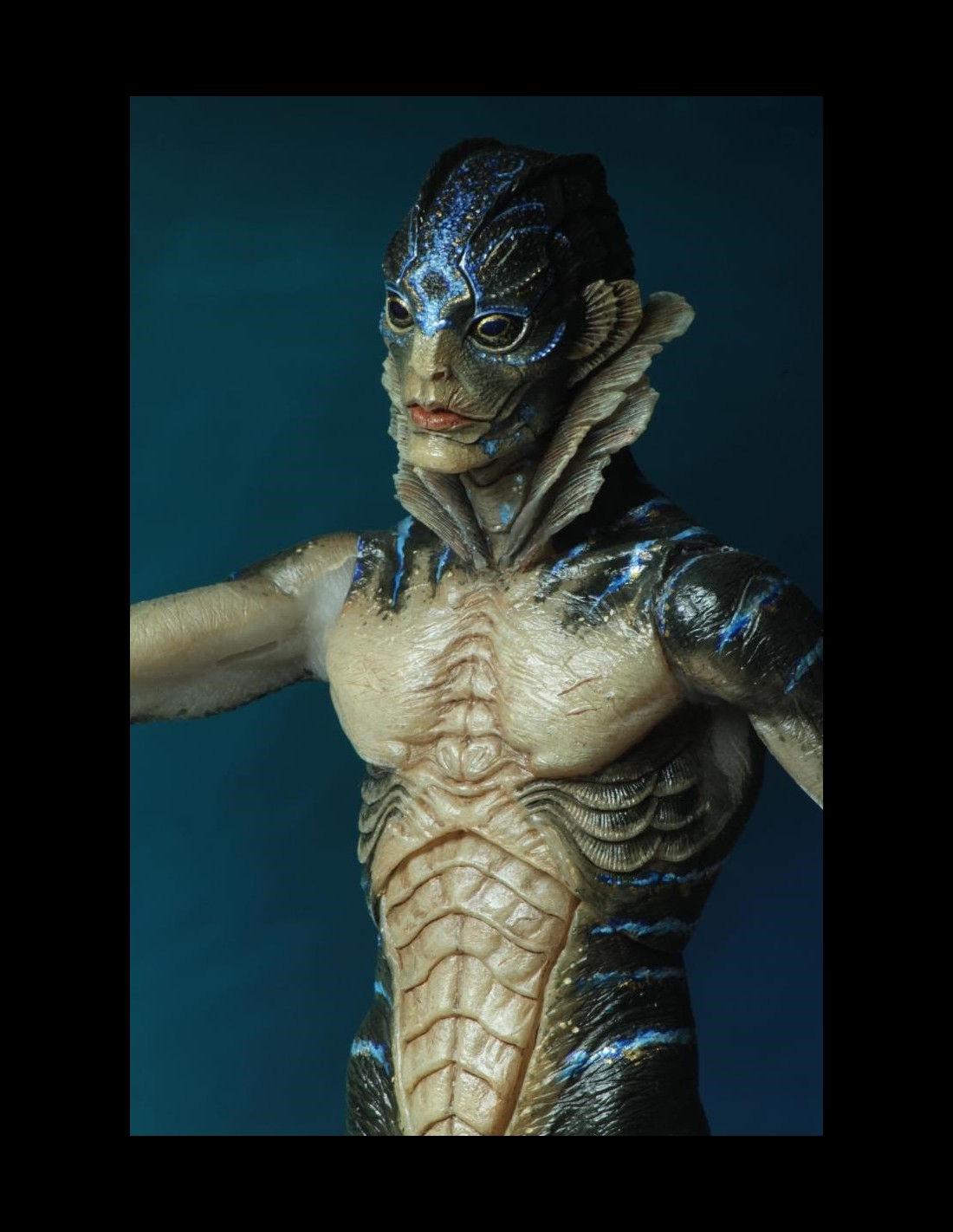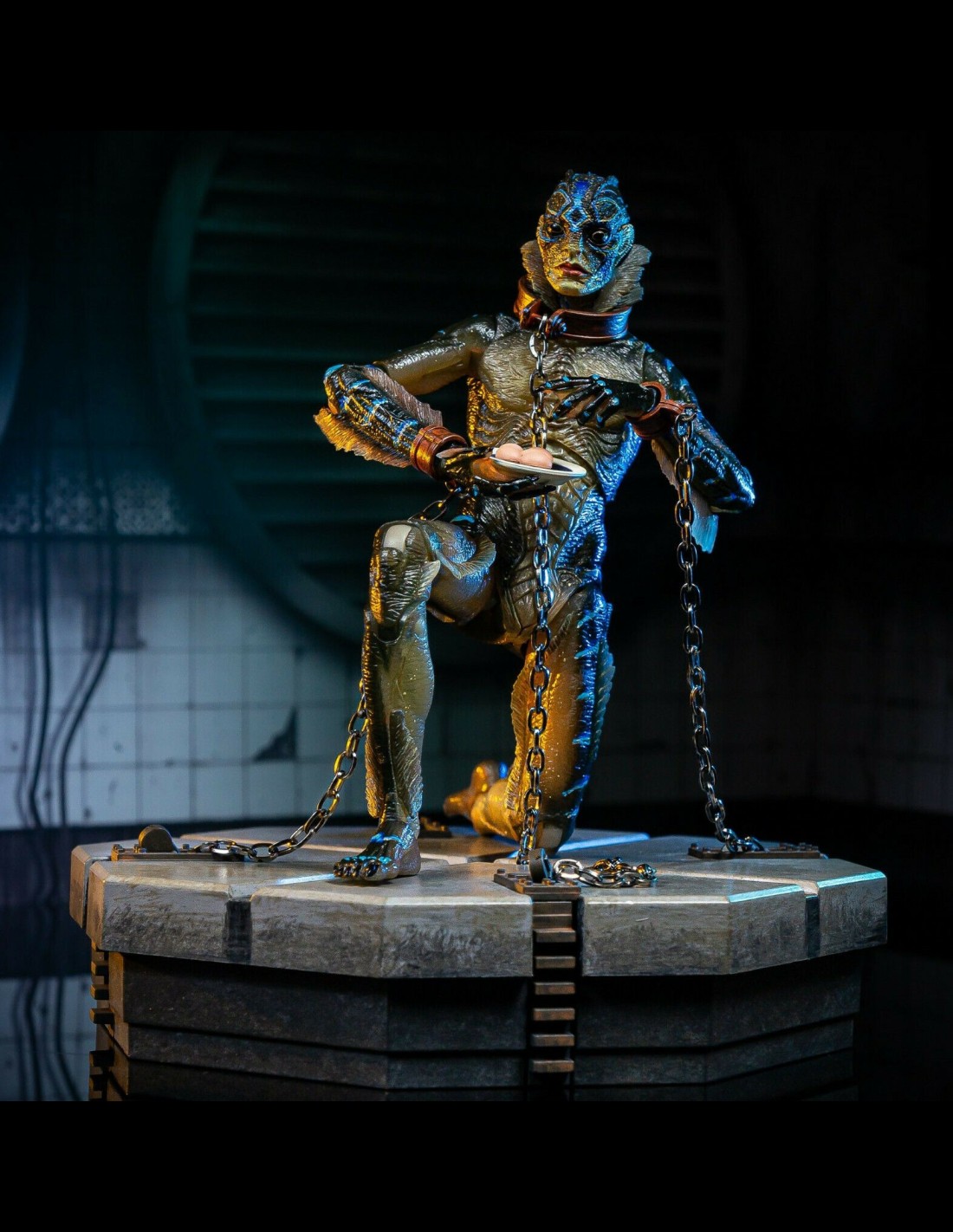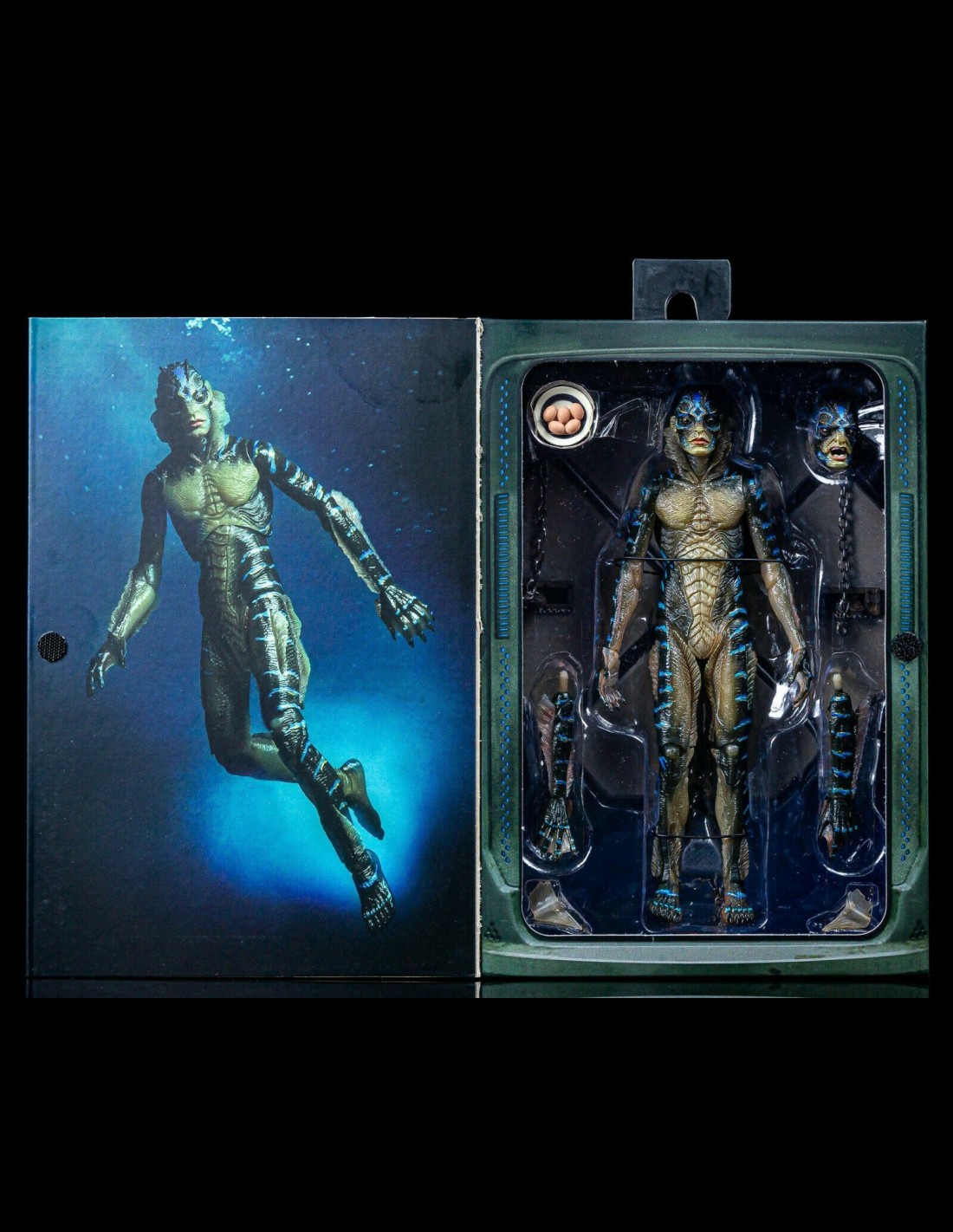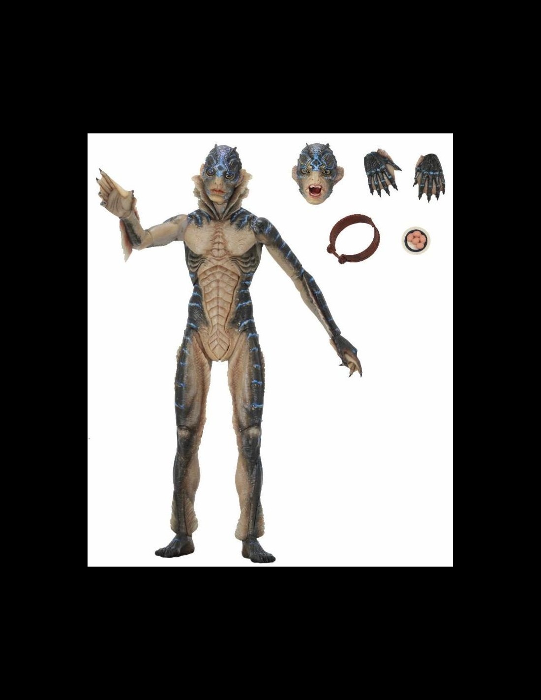 From the acclaimed film The Shape of Water, the Amphibian Man stands approximately 8 inches tall, is super-poseable and comes with removable shackles, interchangeable head and display base.