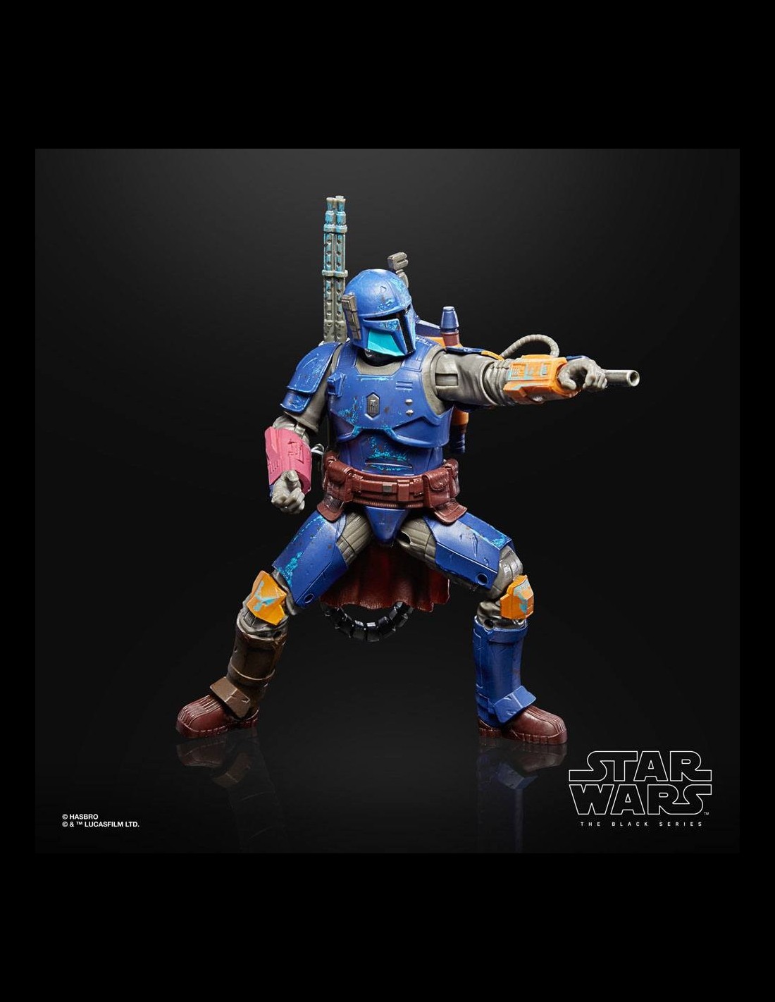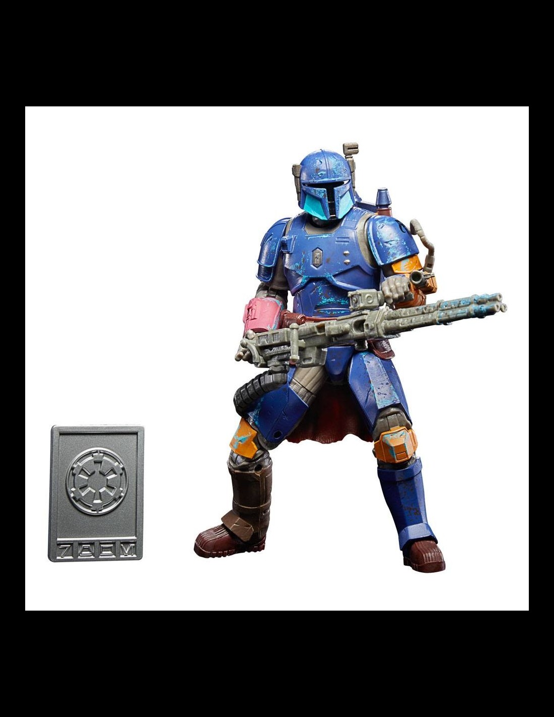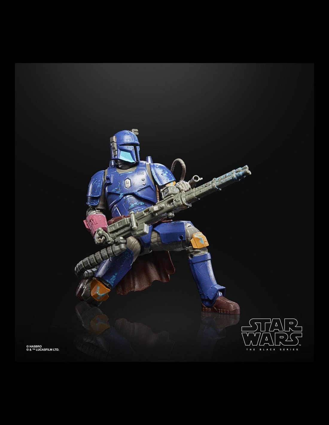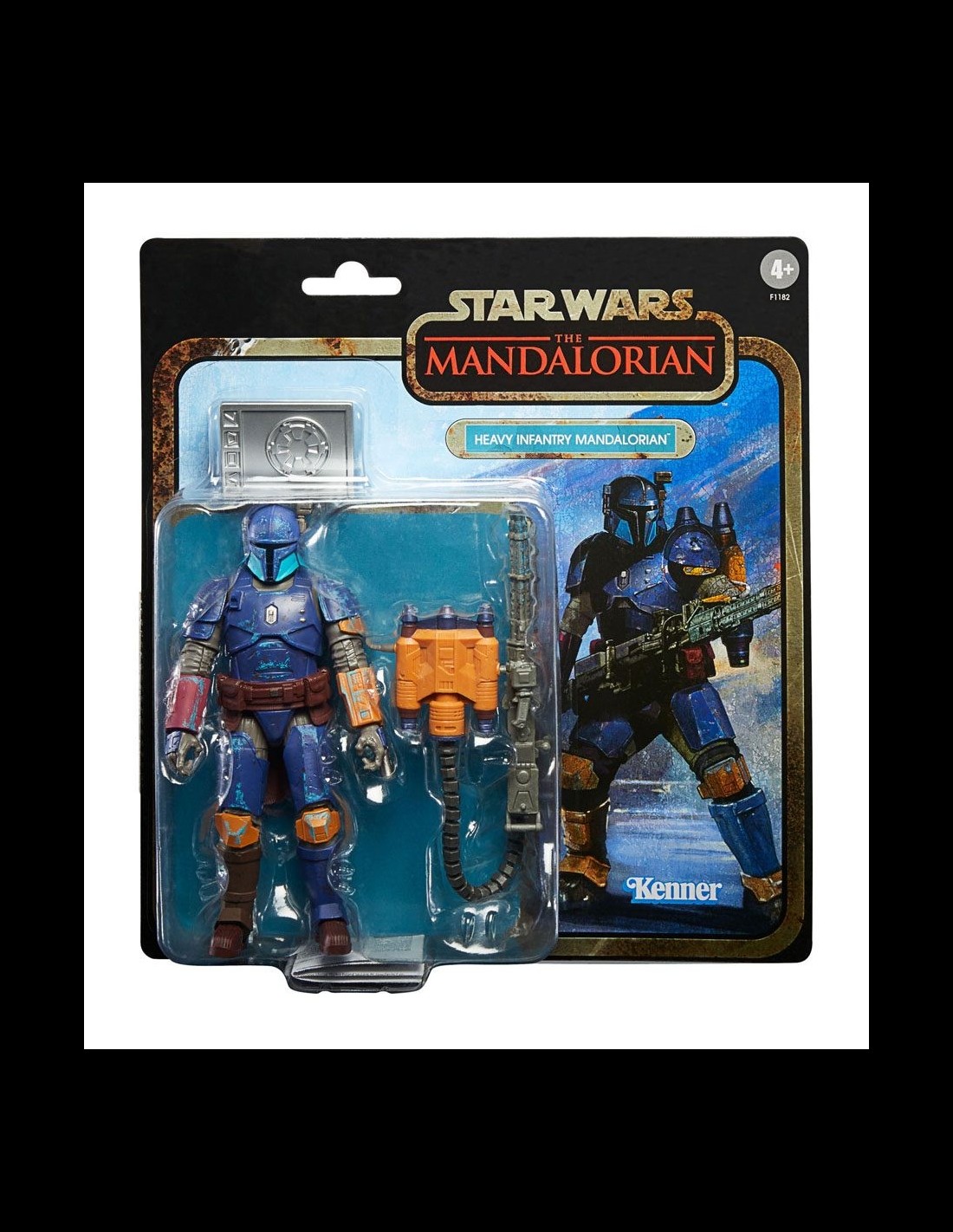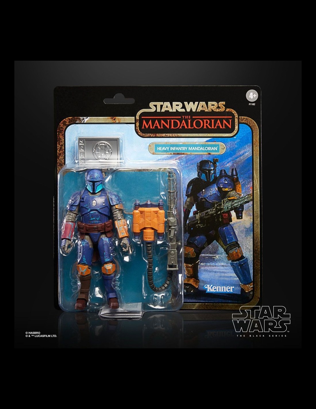The 6-inch-scale Heavy Infantry Mandalorian figure is detailed to look like the character from The Mandalorian, featuring premium detail and multiple points of articulation. Features vintage-designed The Black Series packaging that has been treated with a weathered look, inspired by the stylized images seen during the end credits of the live-action Disney Plus series.