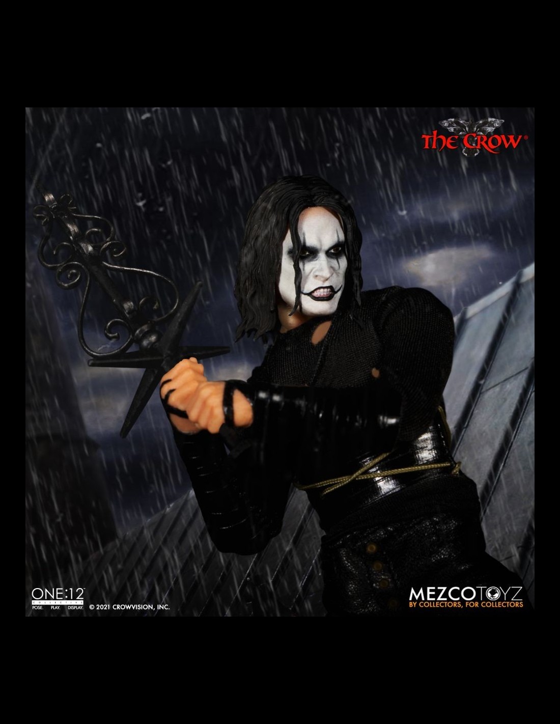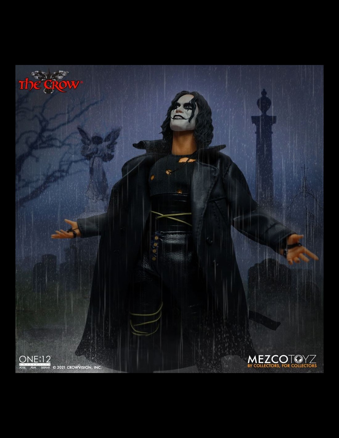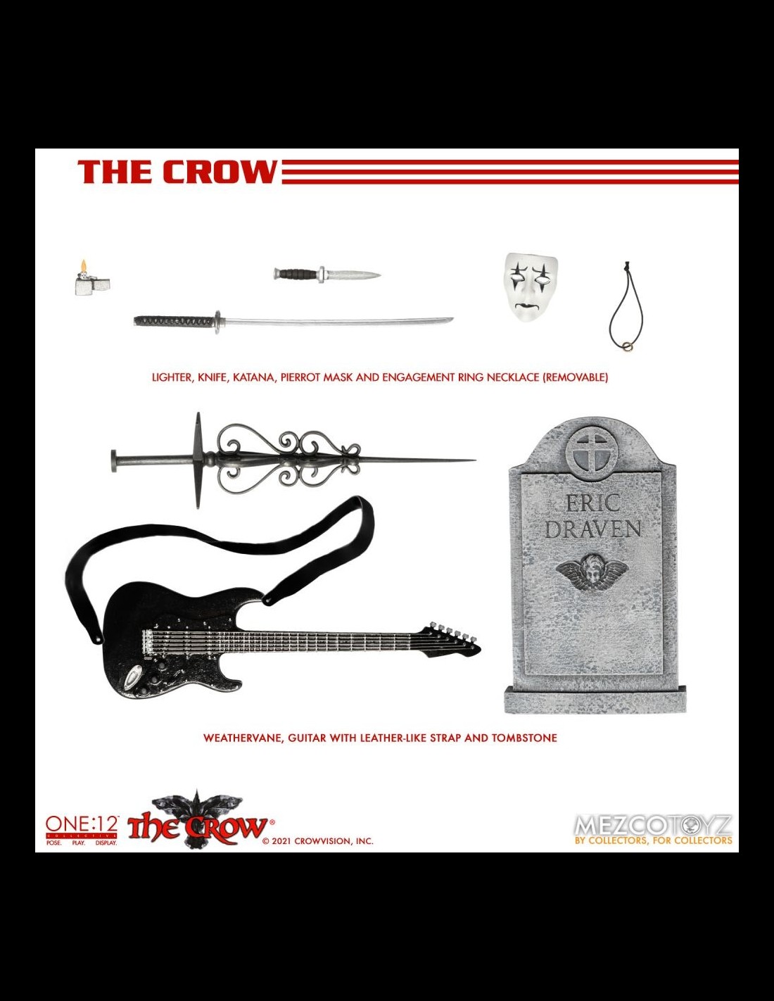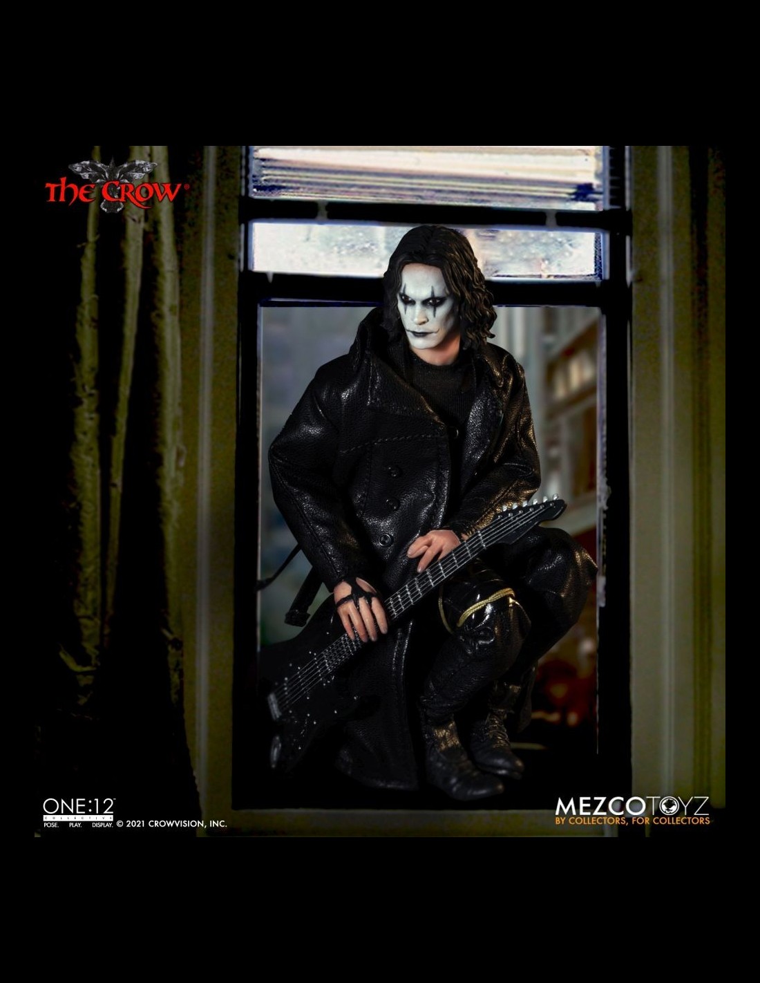 Anche il Corvo arriva nella serie One:12 Collective di Mezco! La figura indossa dettagliati abiti in vera stoffa ed è alta circa 16 cm. Nella scatola troverete tantissimi accessori: la chitarra, teste e mani intercambiabili, la lapide, armi, un fantastico corvo fiammeggiante da usare come base display e altro ancora!