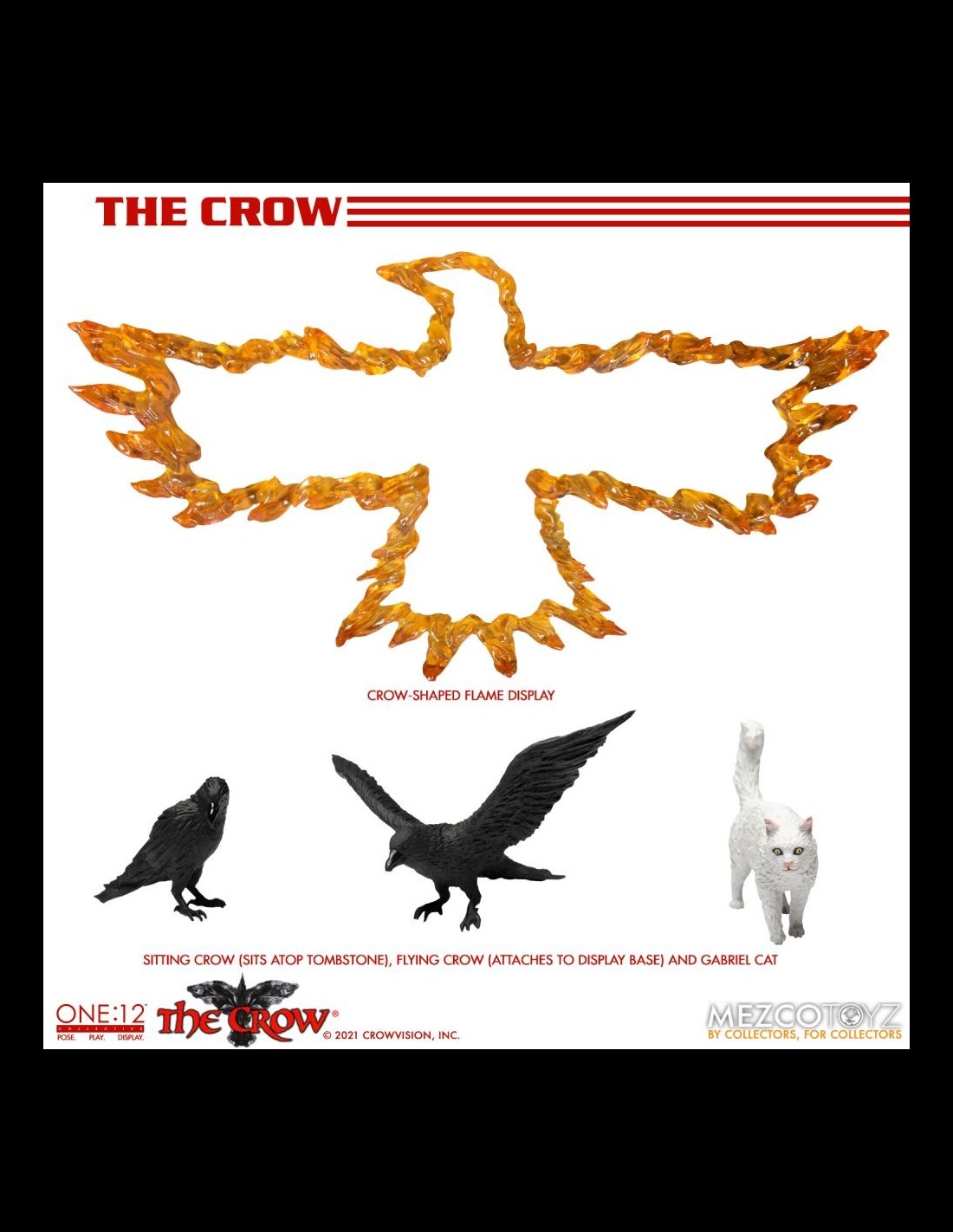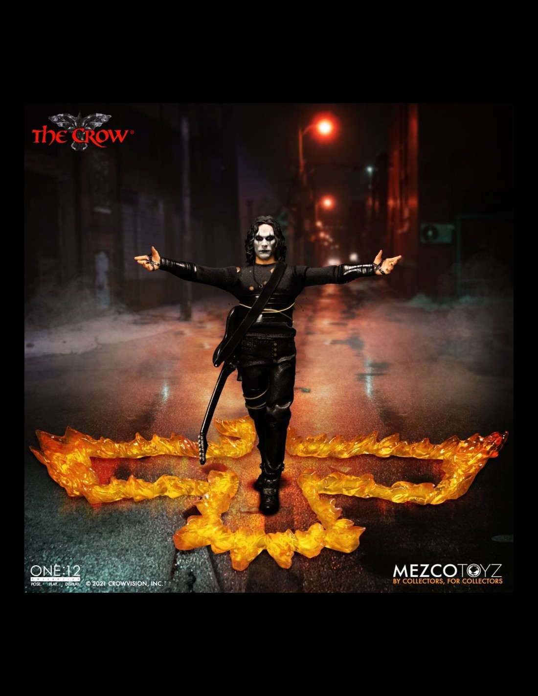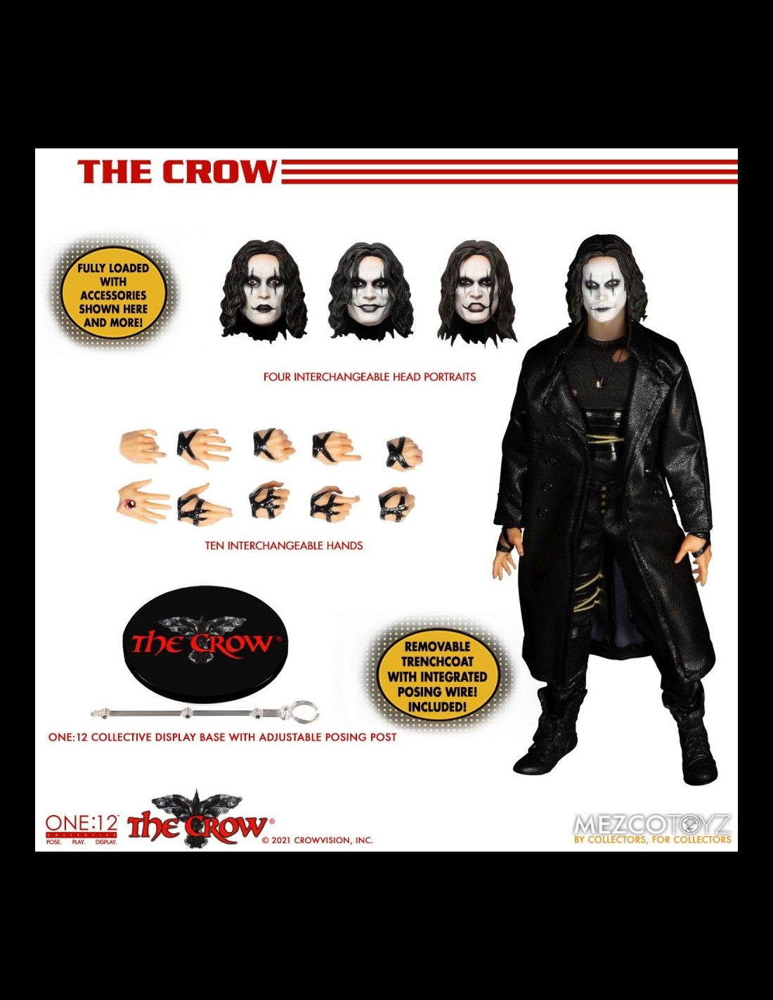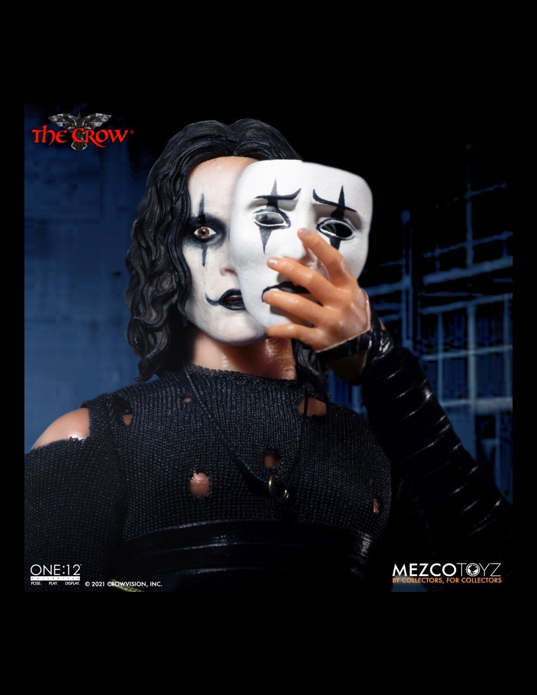 Anche il Corvo arriva nella serie One:12 Collective di Mezco! La figura indossa dettagliati abiti in vera stoffa ed è alta circa 16 cm. Nella scatola troverete tantissimi accessori: la chitarra, teste e mani intercambiabili, la lapide, armi, un fantastico corvo fiammeggiante da usare come base display e altro ancora!