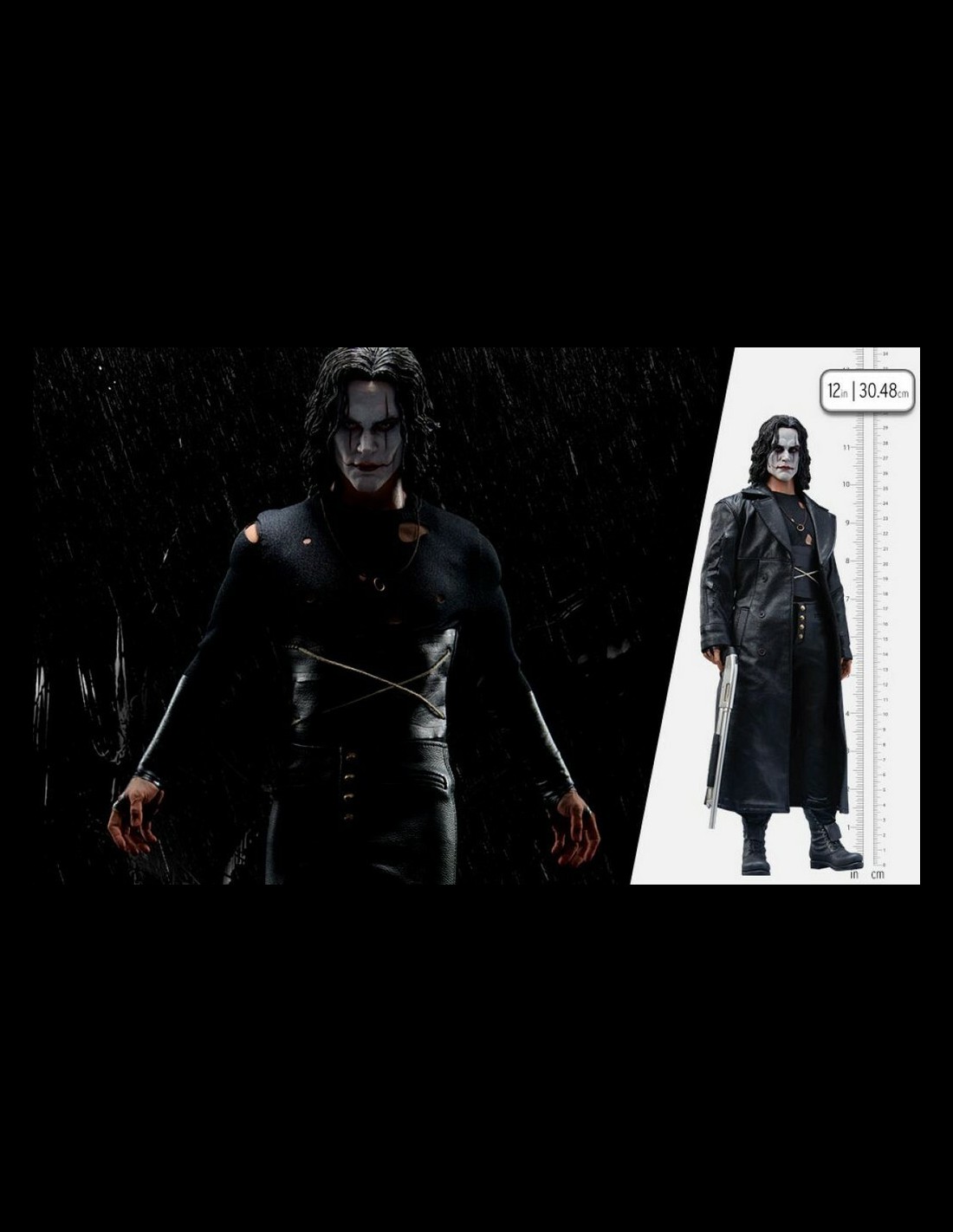 The Crow 1:6 Scale Figure features a detailed likeness of actor Brandon Lee in his role as Eric Draven from the film The Crow. Resurrected and ready for retribution, he wears a tailored black fabric costume, which consists of a torn trenchcoat, a long-sleeved shirt with holes and wrapping, pants, and a necklace holding his fiancée's ring close to his heart. Finished with a pair of sculpted boots, the undead antihero’s signature look captures the somber tragedy of that fateful Devil’s Night.