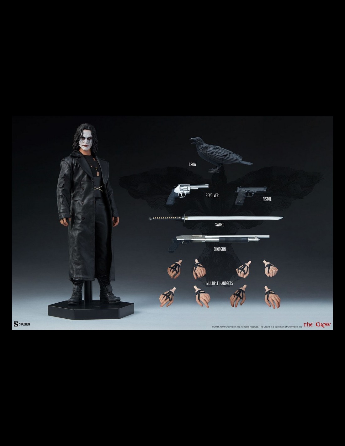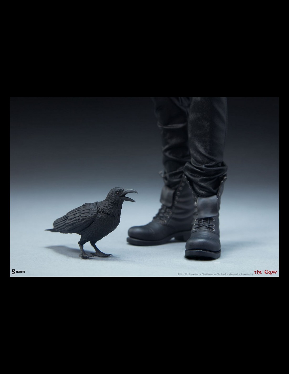 La figura in scala 1:6 del Corvo presenta una somiglianza dettagliata dell'attore Brandon Lee nel suo ruolo di Eric Draven dal film The Crow. Resuscitato e pronto per la vendetta, indossa un costume in tessuto nero su misura, che consiste in un trench strappato, una camicia a maniche lunghe con buchi, pantaloni e una collana che tiene l'anello della sua fidanzata vicino al suo cuore. Rifinito con un paio di stivali scolpiti, il look caratteristico dell'antieroe non morto cattura la cupa tragedia di quella fatidica Devil's Night.