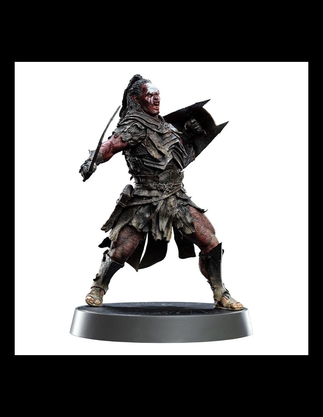 Abbiamo progettato Lurtz come compagno di Aragorn. Due guerrieri senza pari sull'eterno campo di battaglia del bene e del male. Qui il potente Lurtz si prepara a lanciare il suo scudo e intrappolare il suo nemico; muscoli gonfi mentre si prepara a colpire con furia e precisione...