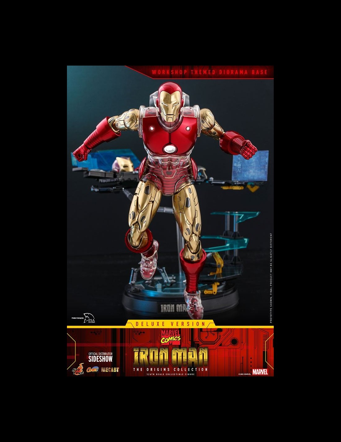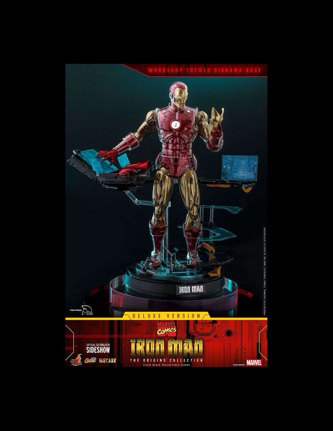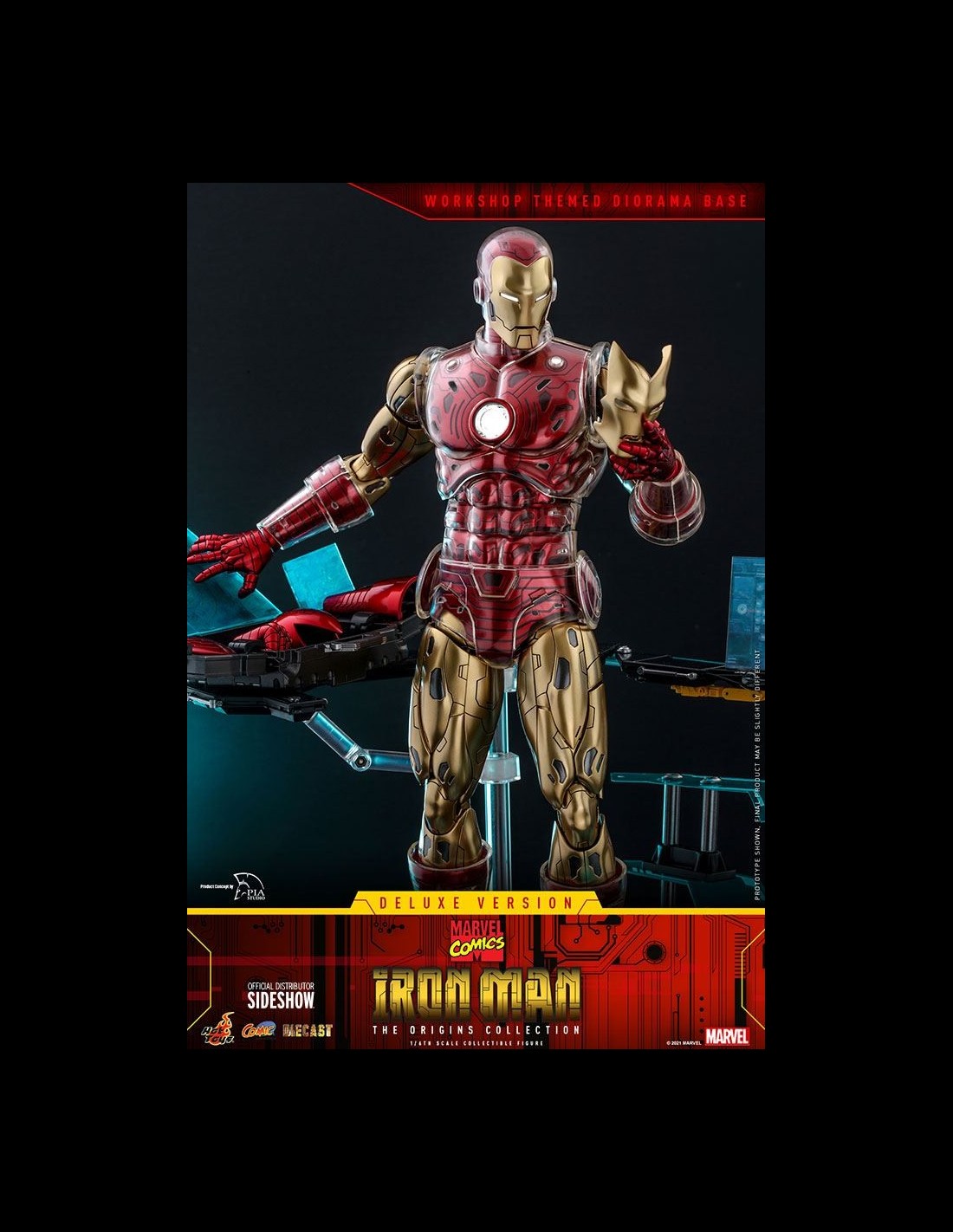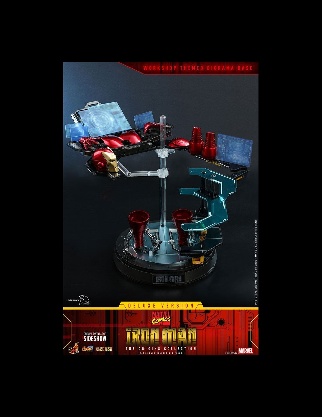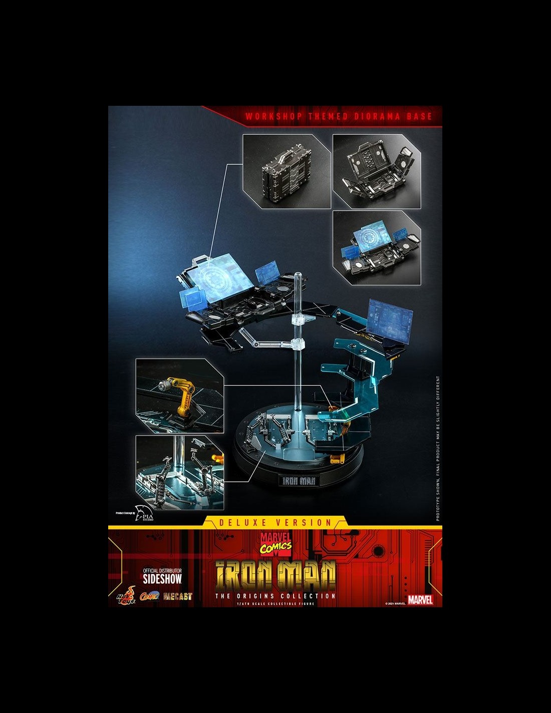 The deluxe version includes a signature Iron Man suitcase with articulated function, also an elaborated diorama figure base with LED light-up function, allowing fans to explore Tony Stark’s high-tech workshop straight from the comic pages, includes articulated gantry arms, extra armor parts, and holographic screen accessories.