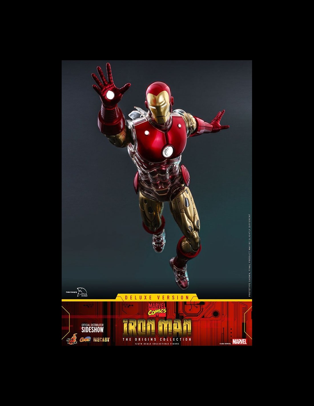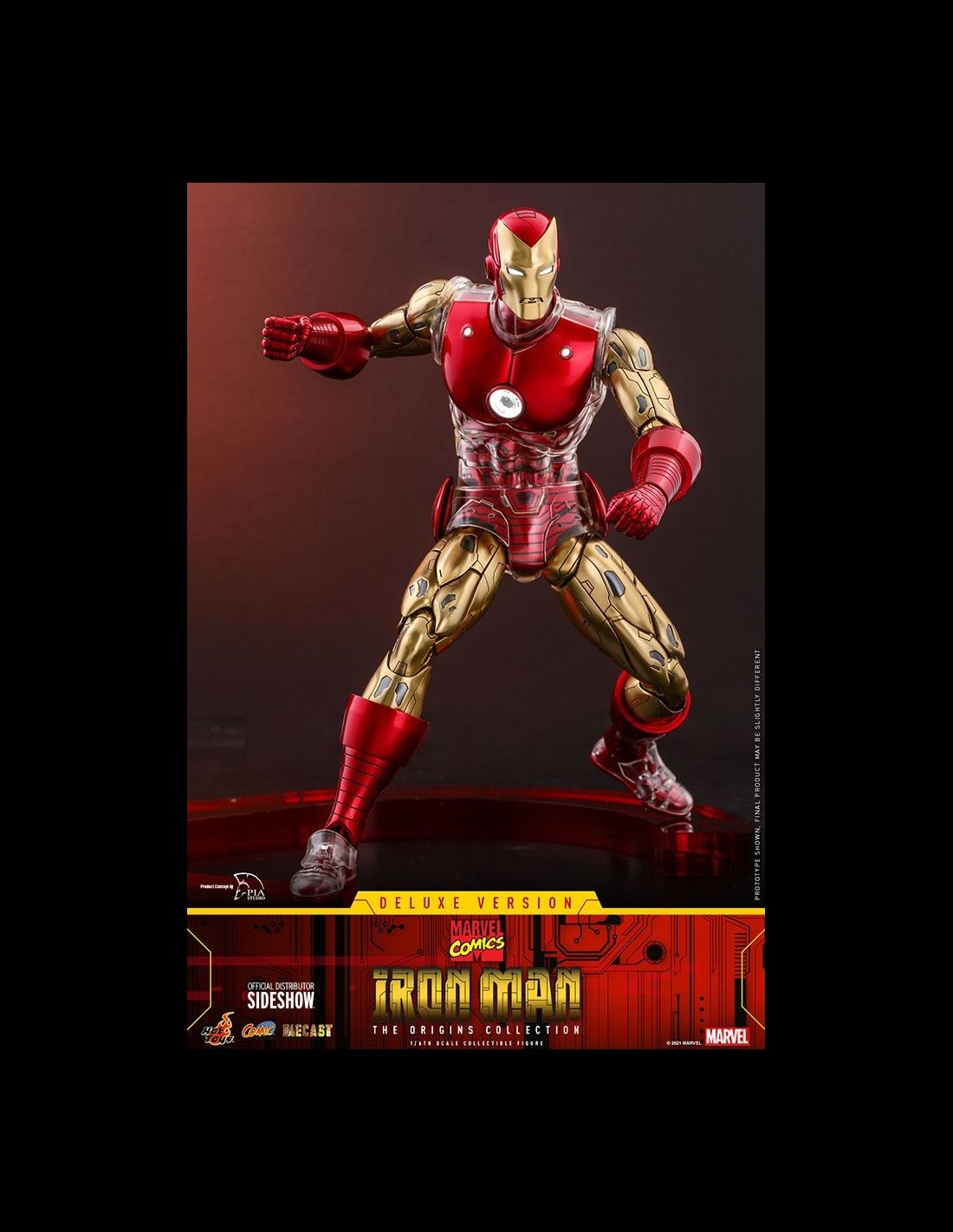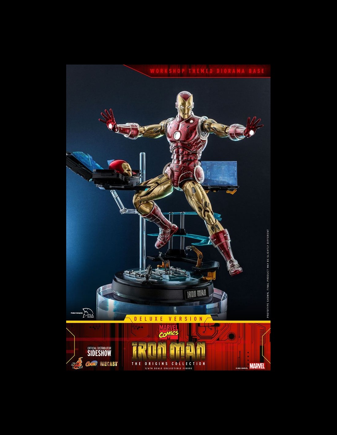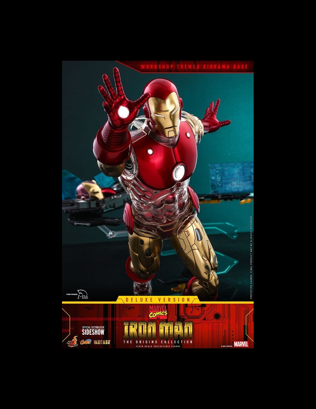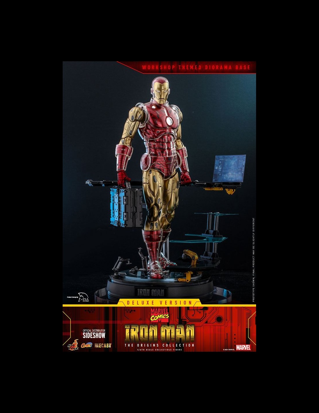 The deluxe version includes a signature Iron Man suitcase with articulated function, also an elaborated diorama figure base with LED light-up function, allowing fans to explore Tony Stark’s high-tech workshop straight from the comic pages, includes articulated gantry arms, extra armor parts, and holographic screen accessories.