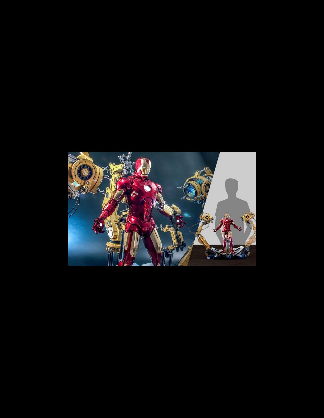 L'accurato oggetto da collezione Suit-Up Gantry presenta una notevole precisione del film, più aree di illuminazione a LED situate su bracci meccanici e piattaforma gantry, dettagli sostanziali con un design realistico di cavi e fili, strati di applicazioni di vernice e design delle articolazioni che consentono ai fan di ricreare il iconica scena d'ingresso.