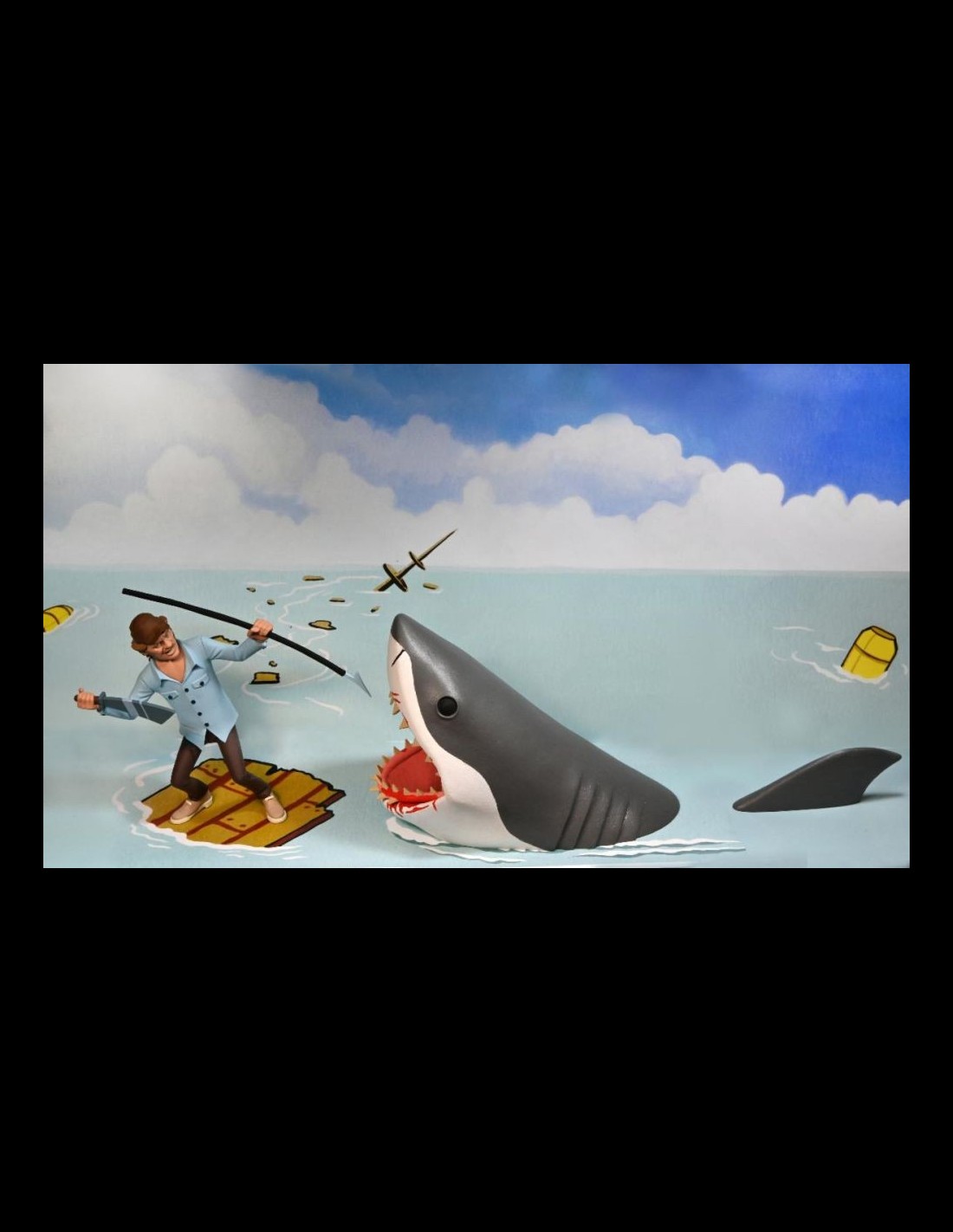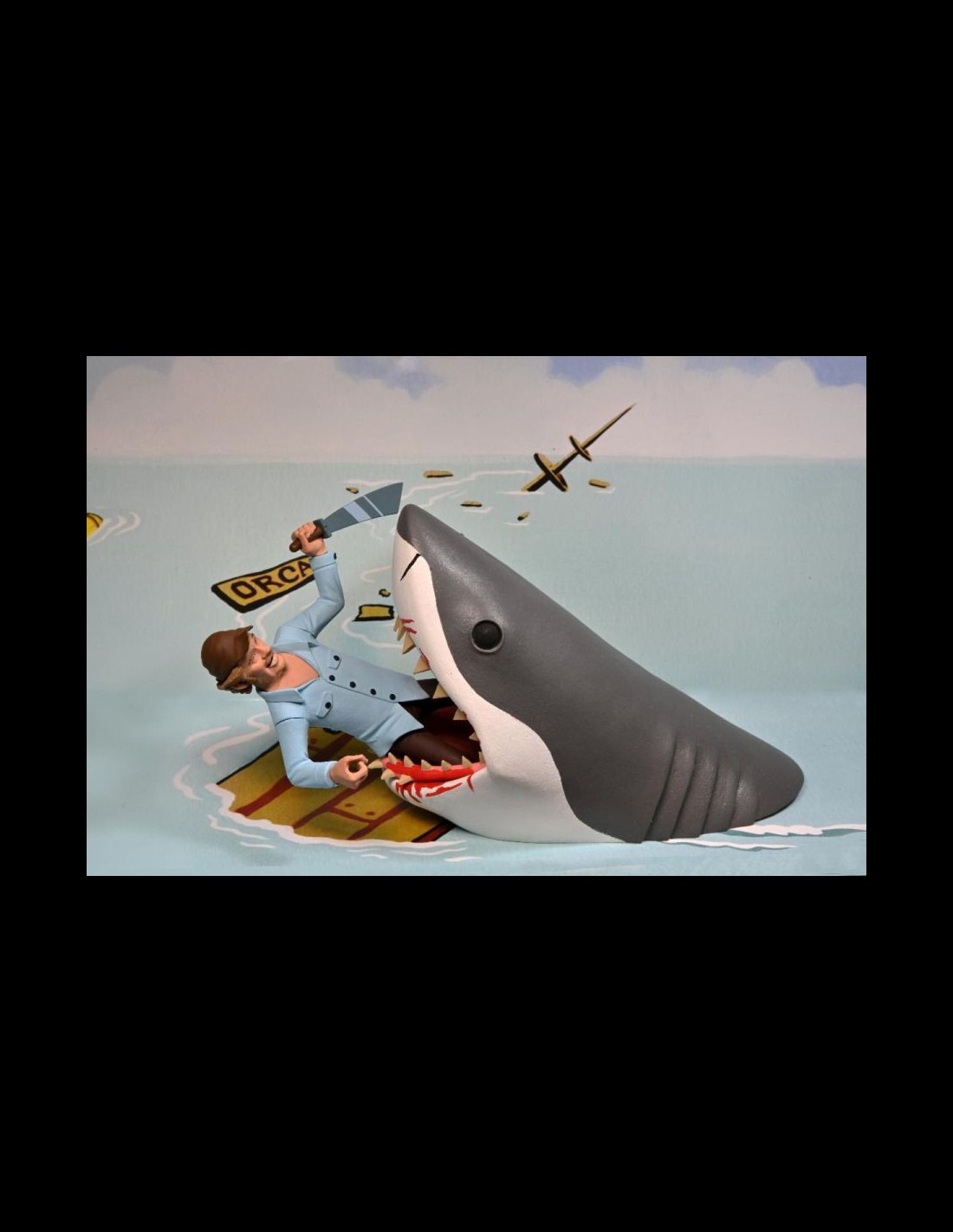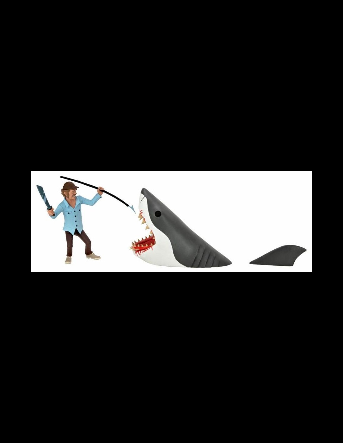 Quint e lo Squalo arrivano nella serie Toony Terrors di Neca! Nella scatola, oltre alle due action figures, troverete un machete e un arpione per Quint, una pinna per lo squalo e uno sfondo in cartoncino!