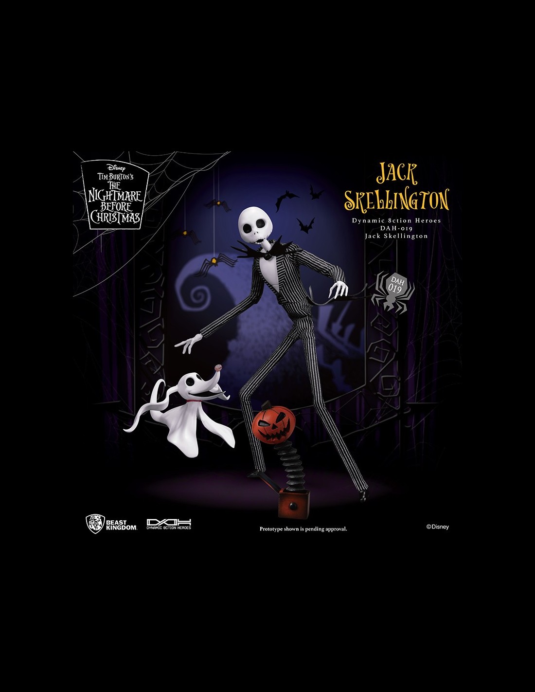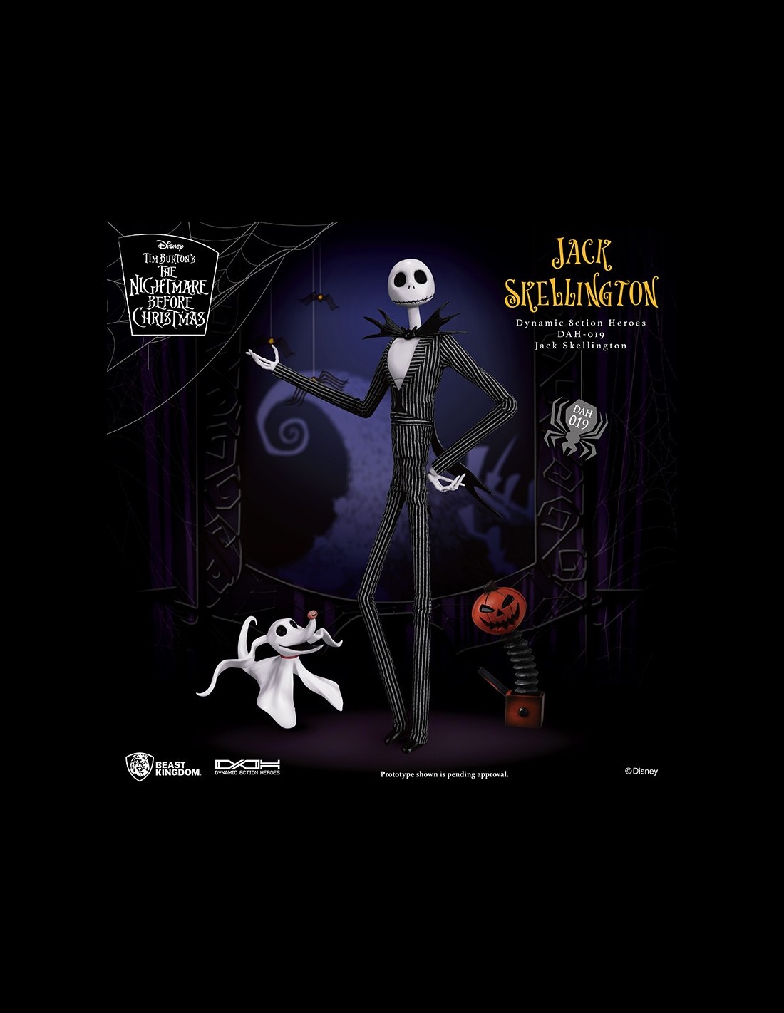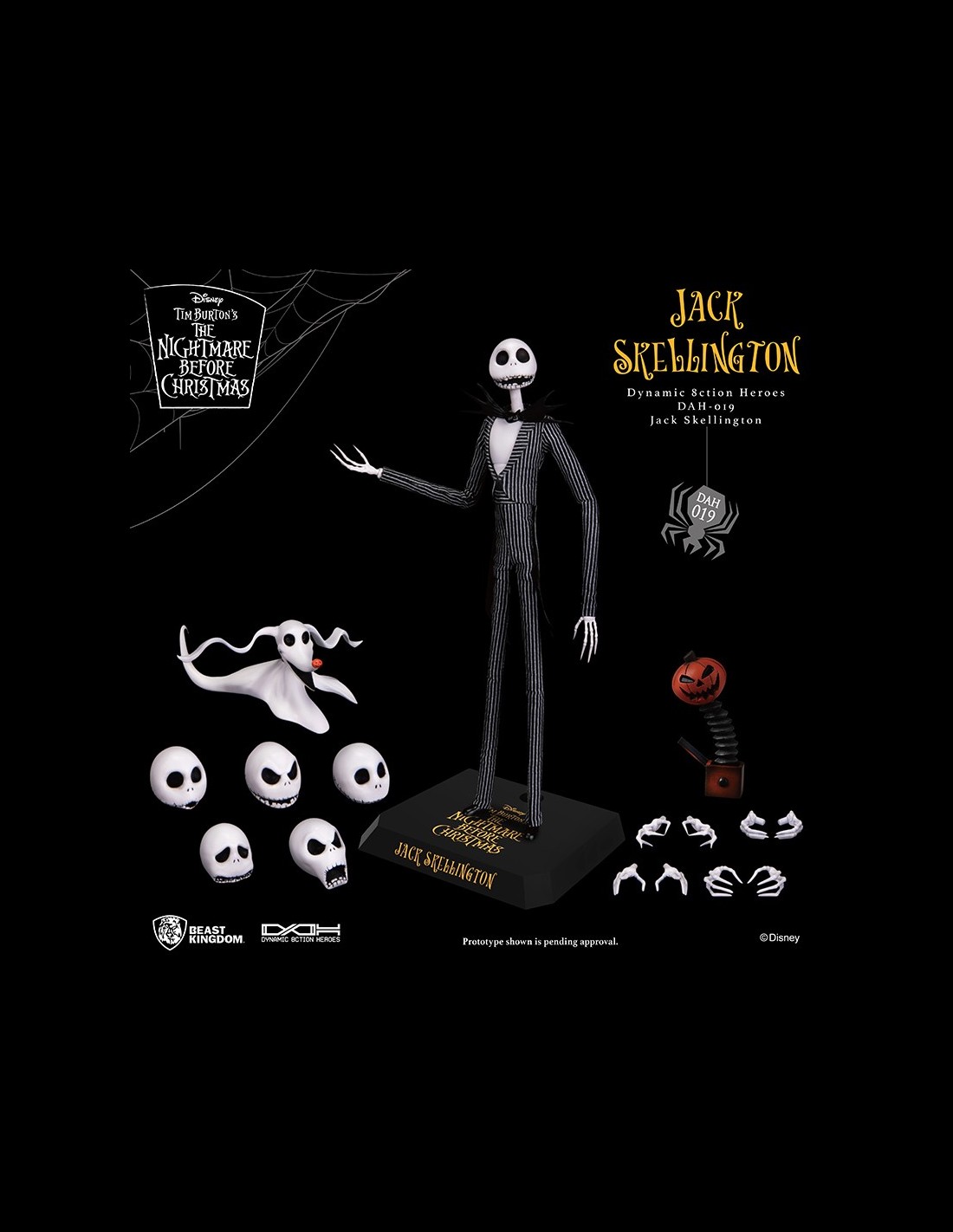 Da Beast Kingdom, l'action figure di Jack Skellington, dal classico Disney, Nightmare Before Christmas. Con 6 differenti teste intercambiabili, 5 paia di mani, un set di accessori glow in the dark, la figura di Jack include Zero e vestiti in stoffa. Incredibili dettagli per questo must, da non perdere! Altezza 21 cm.