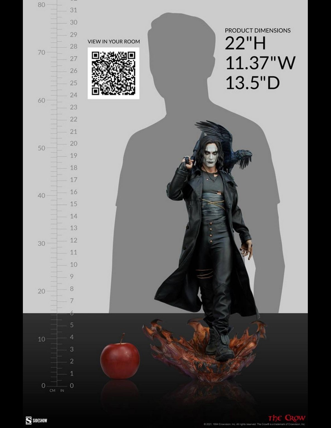 The Crow Premium Format Figure measures 22 inches tall and 11.38 inches wide as Eric Draven, fresh from the grave, stalks through raging flames to exact his revenge on the men who ruined his life. Based on the likeness of actor Brandon Lee in the unforgettable role, the undead antihero rests a shotgun on his shoulder while the mysterious crow guides his vindictive path, wings outstretched. His portrait features his iconic face makeup, sculpted hair, and a somber look encapsulating his tragic transformation.