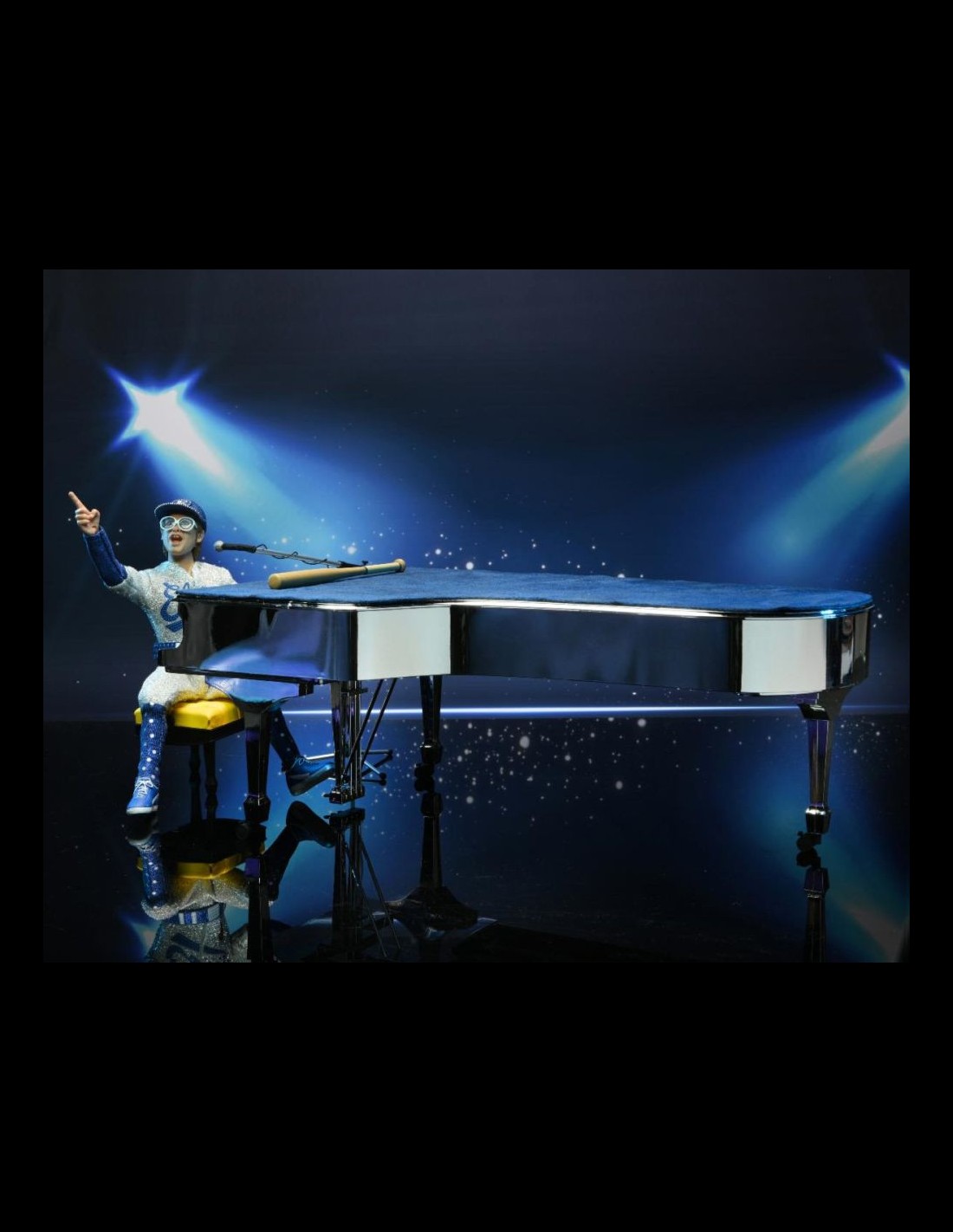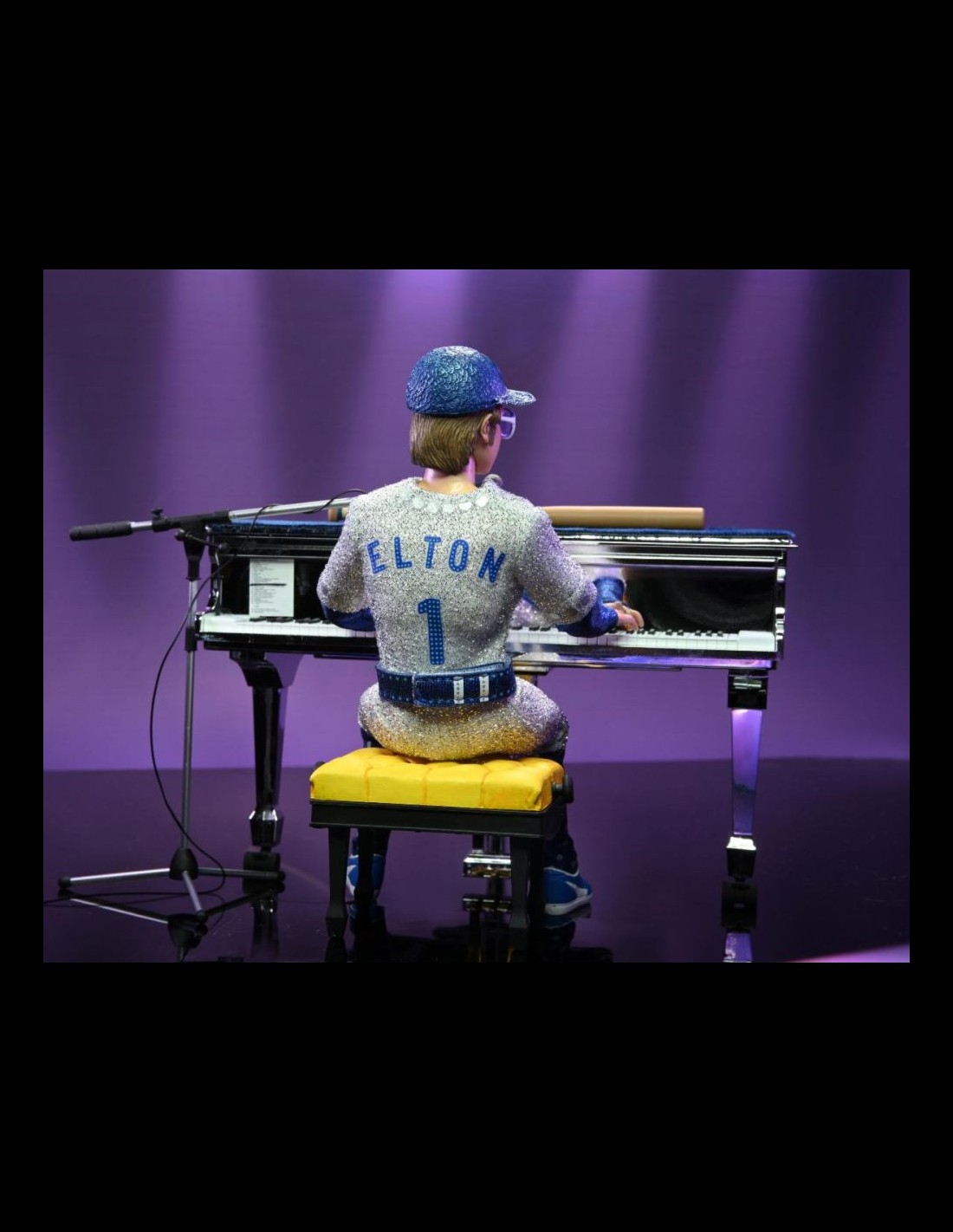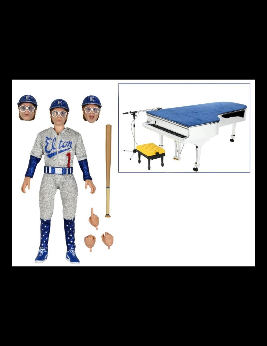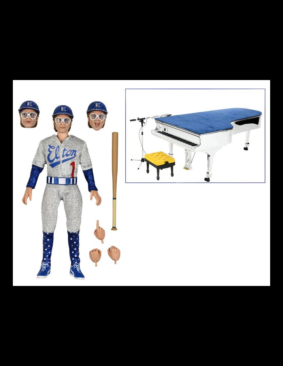 Questo set deluxe include anche la mazza da baseball di Elton, la panca per pianoforte, l'asta del microfono, le mani intercambiabili e tre teste intercambiabili con diverse espressioni.