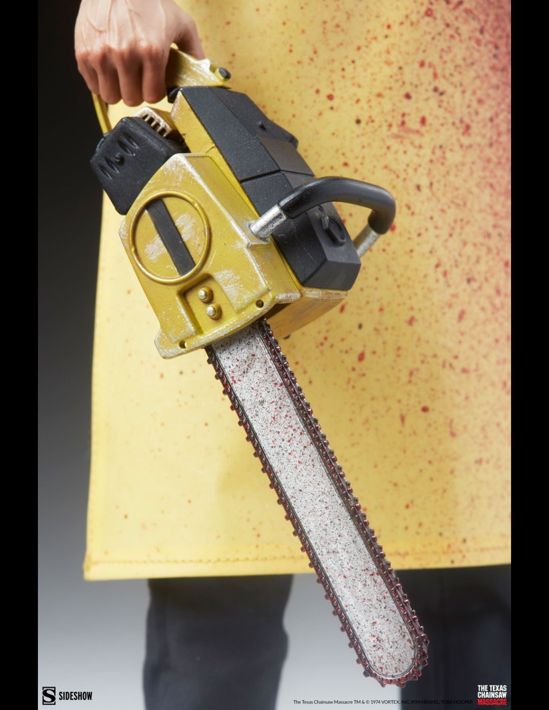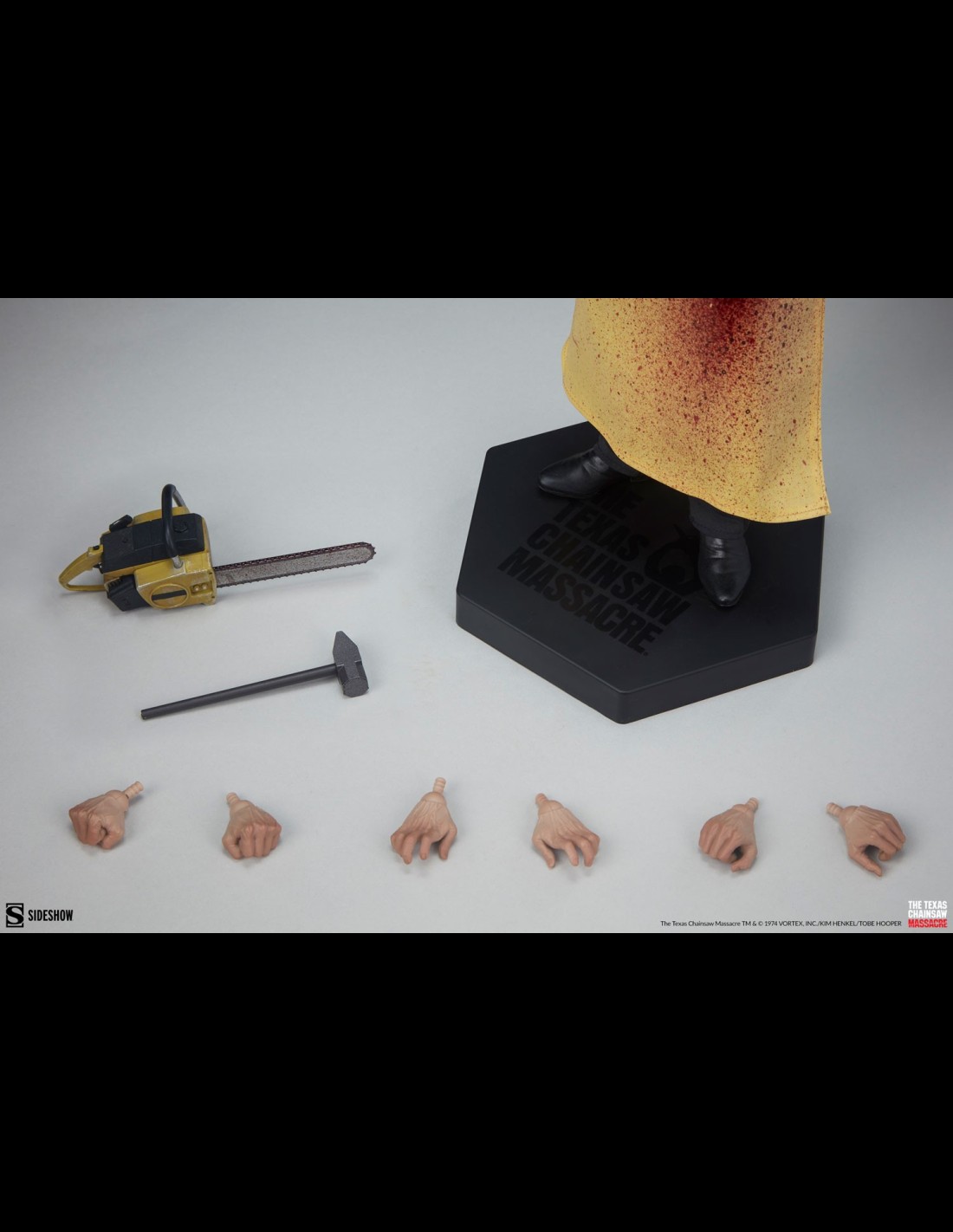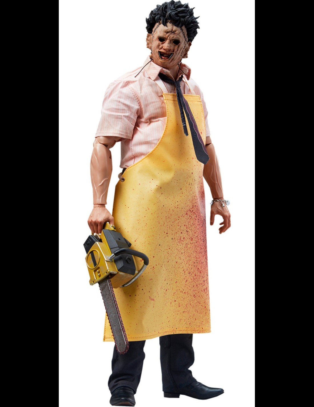 Ispirato alla sua apparizione iconica in The Texas Chainsaw Massacre (1974), la figura di sesta scala Leatherface (Killing Mask) presenta un costume in tessuto su misura composto da una camicia con colletto, pantaloni neri, una cravatta fantasia e un grembiule da macellaio giallo insanguinato oltre a i suoi stivali neri scolpiti. Un sottotuta imbottito riempie la silhouette intimidatoria del cannibale assassino. Il ritratto omonimo di Leatherface è dettagliato in modo inquietante con una colorazione giallastra sull'esterno della finta pelle, capelli selvaggi in cima alla testa e inquietanti elementi cuciti, tutti scolpiti per catturare il suo aspetto inquietante.