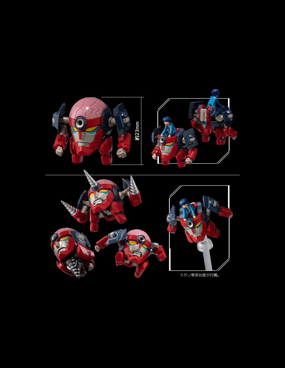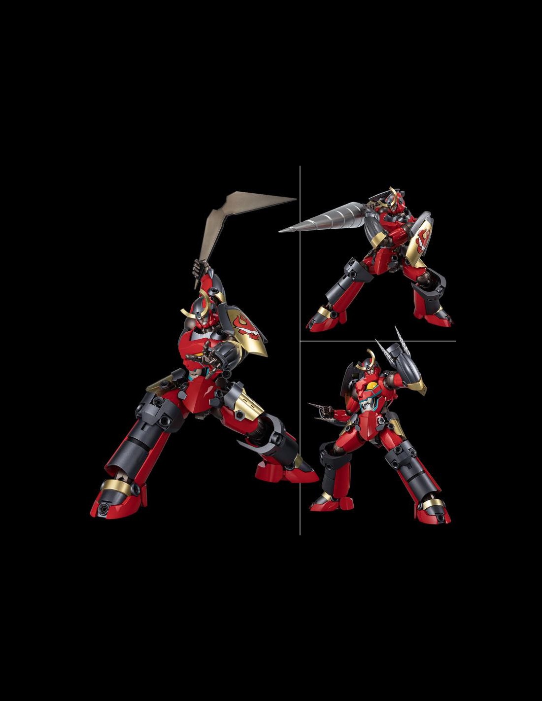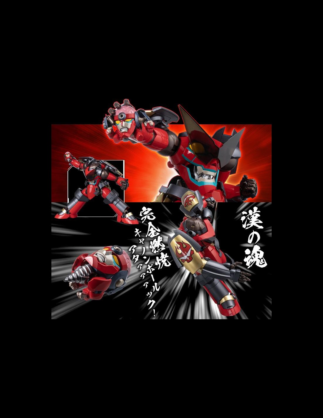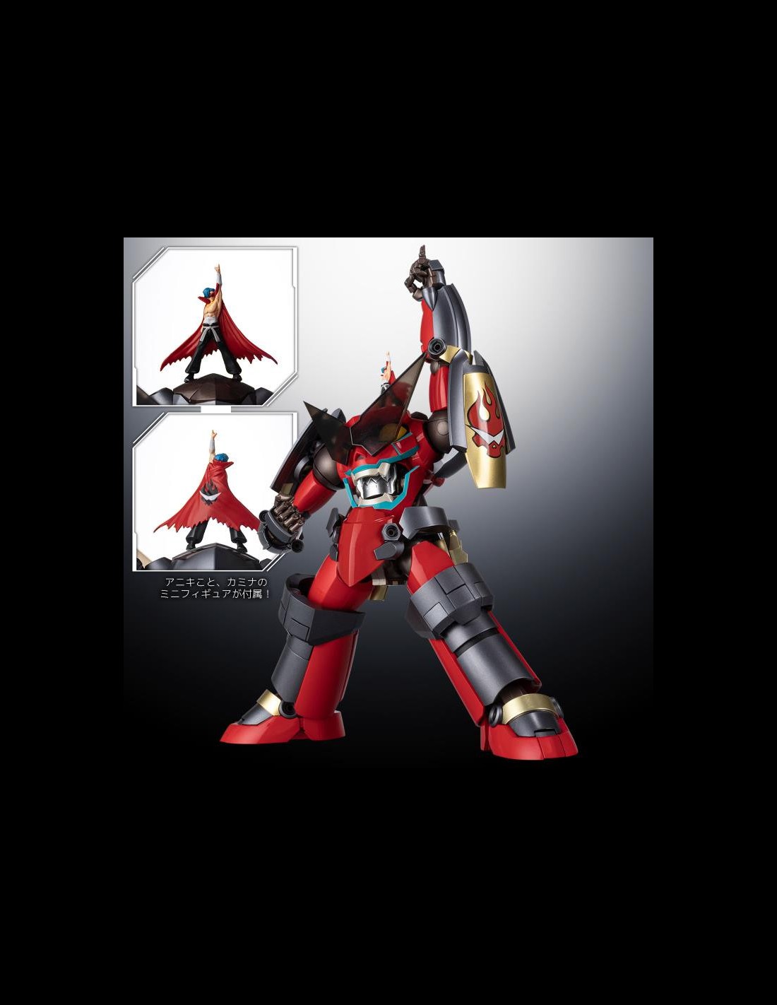 La figura del Gurren Lagann è super dettagliata, super articolata, trasformabile, include numerosi accessori, parti intercambiabili, nonchè le due figure di Kamina e Simon.