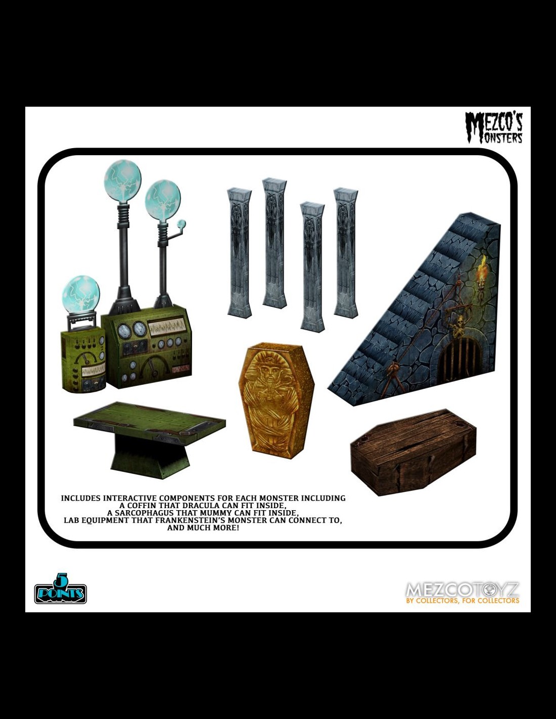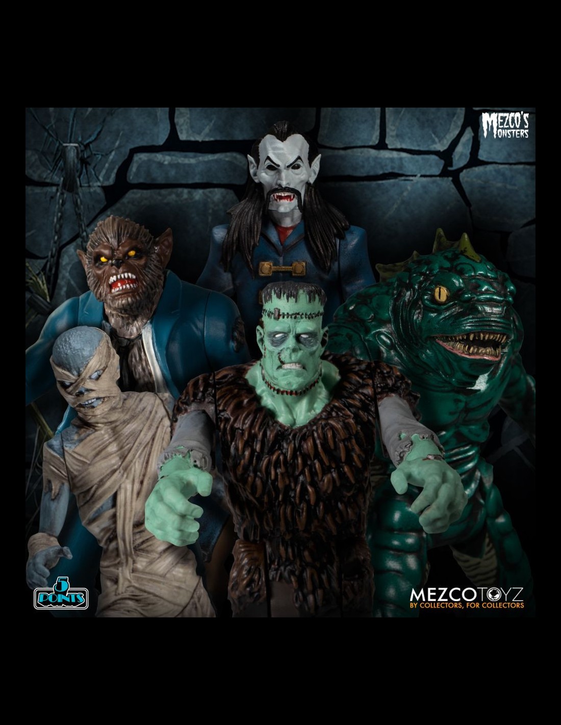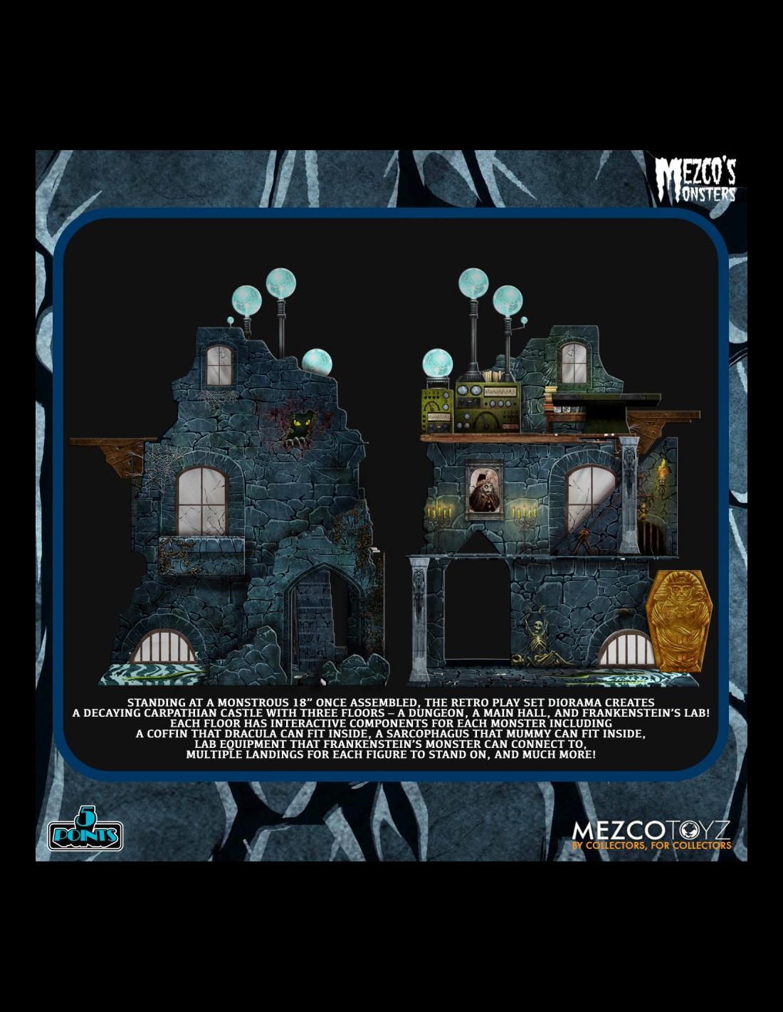 La serie 5 Points di Mezco è dedicata ad action figure di celebri personaggi della cultura pop caratterizzate dal look vintage! Il nuovo set è ispirato ai più celebri personaggi della cultura horror di tutti i tempi! Il box incclude 5 action figures: Dracula, Frankenstein, la Mummia, Sea Creature e il Licantropo. Ogni figura dispone di accessori. Inoltre nella scatola troverete un bellissimo scenario (alto ben 45 cm) che raffigura un tenebroso castello dei Carpazi. Da non perdere!