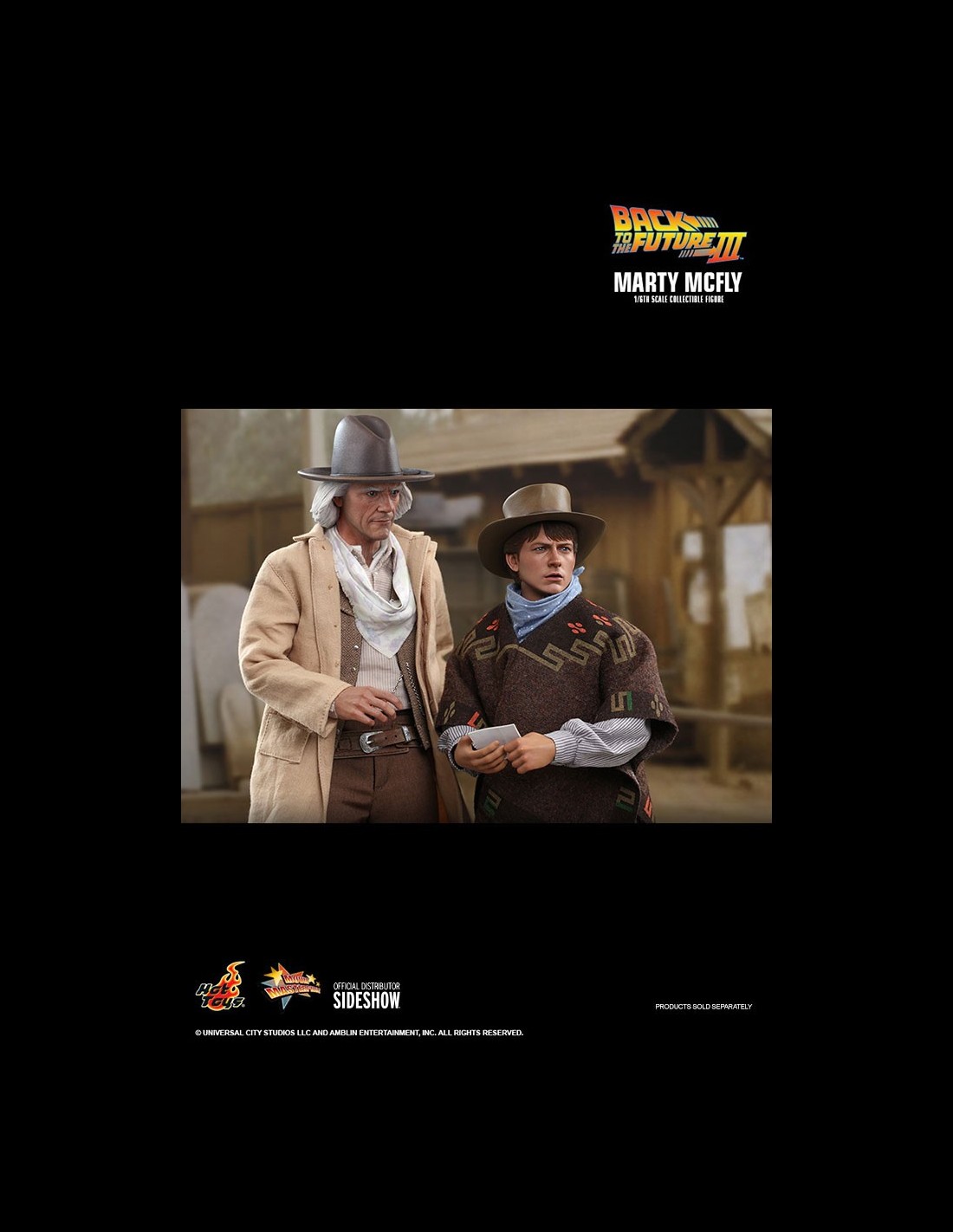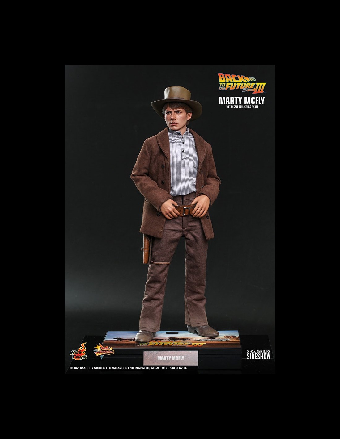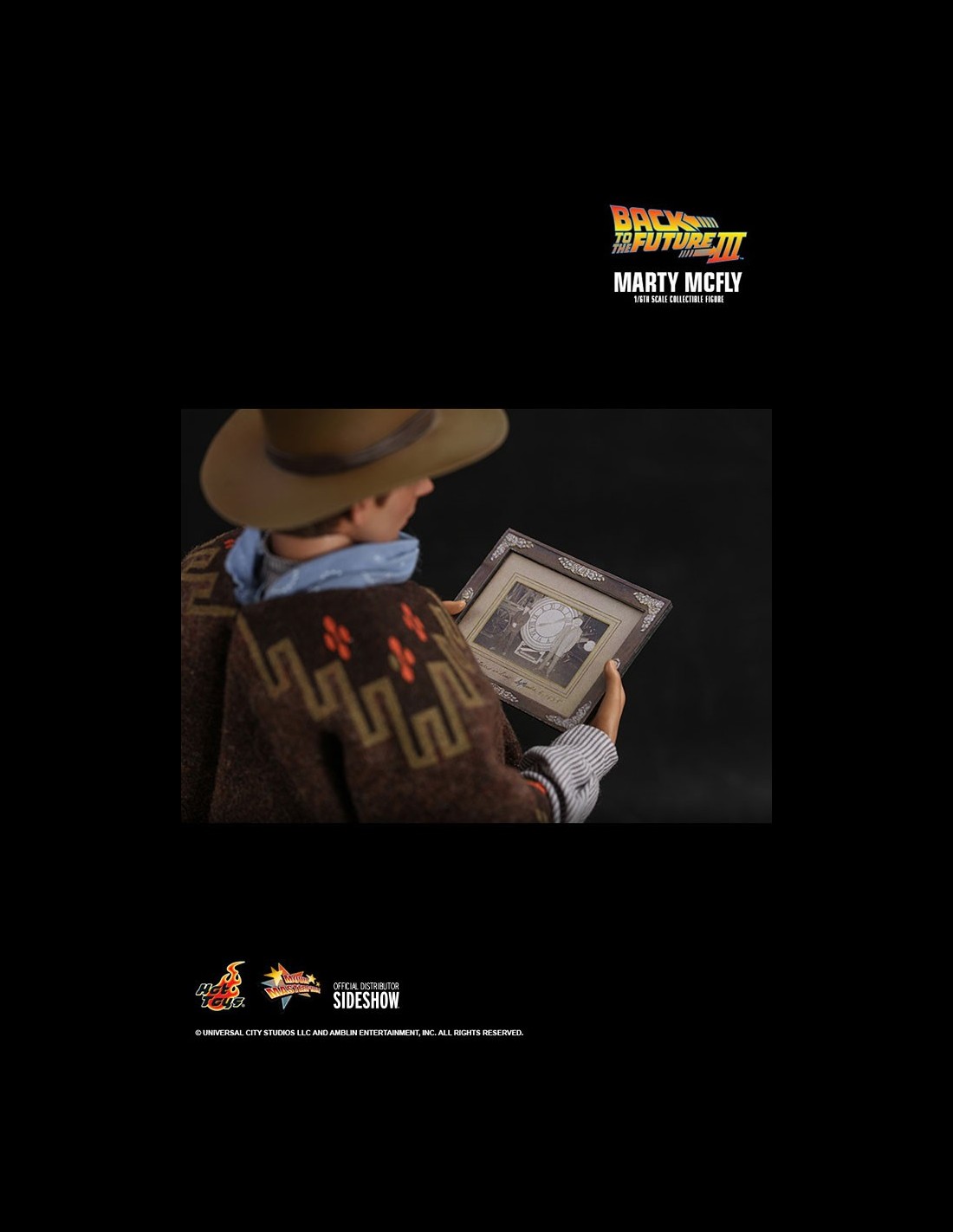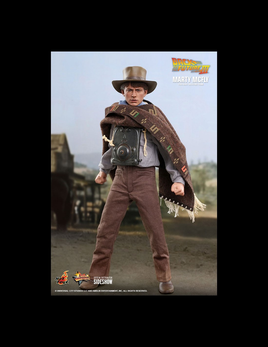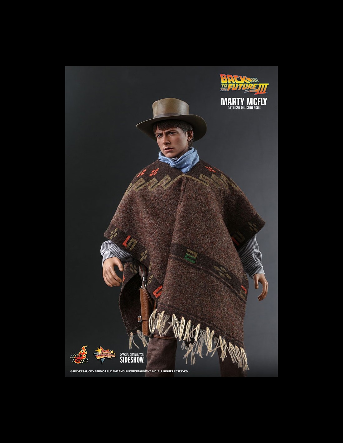 The stunningly detailed collectible figure is specially crafted based on the appearance of Michael J. Fox as Marty McFly in Back to the Future III, featuring a newly developed head sculpt and a cowboy hat with amazing likeness, screen accurate costume, a brown patterned poncho, cowboy scarf, an array of weapon and accessories including a pistol, bulletproof stove plate, pie dish, framed photo from Doc Brown, photo of Doc?s tomb, communicator with battery, hoverboard, and a figure stand!