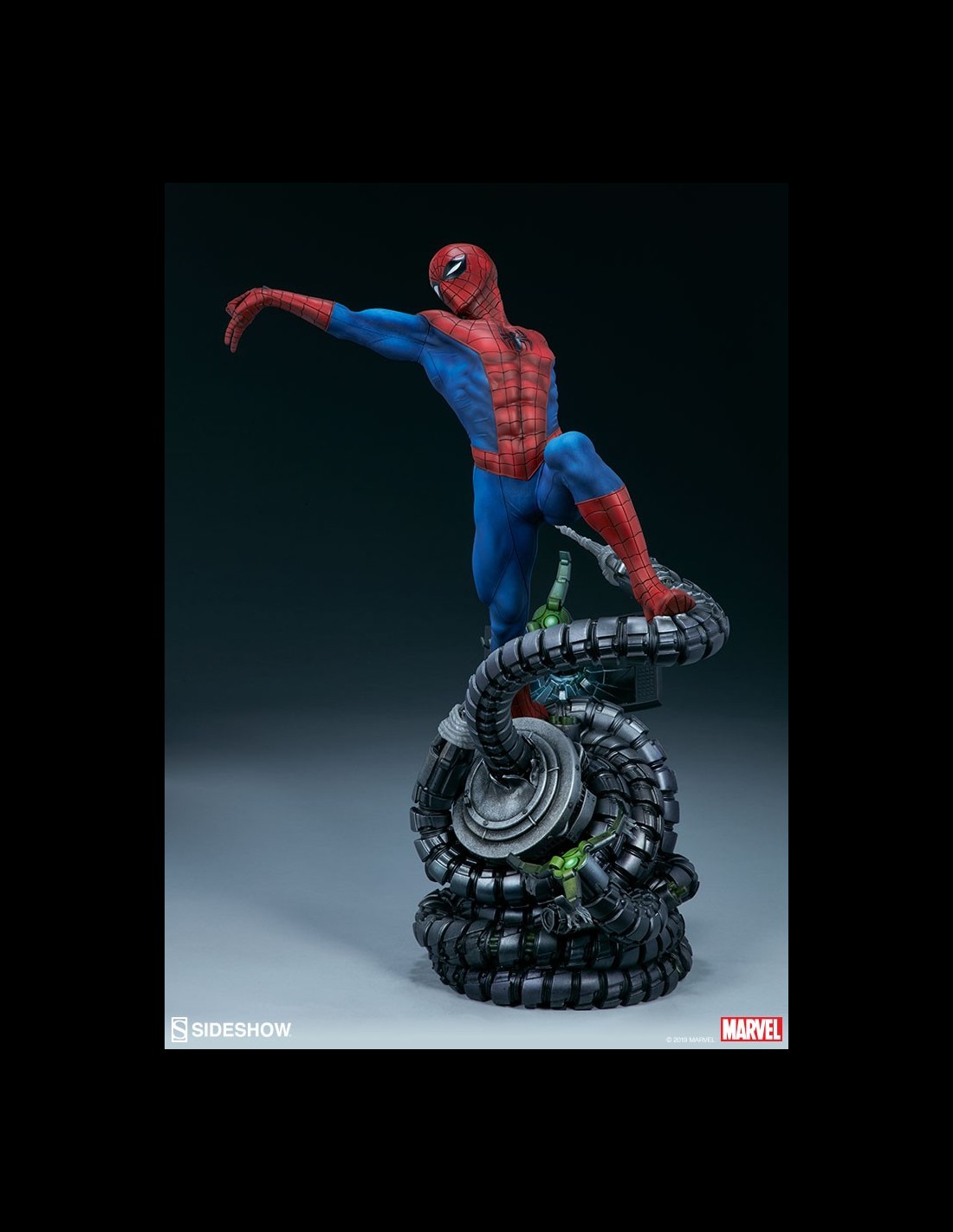 Just another day at the lab! The Spider-Man Premium Format Figure measures 22.5 inch tall as everyone's favorite web-head wrestles with the tentacles of his foe Doctor Octopus on an Oscorp Laboratories-themed base. Peter Parker expertly avoids Doc Ock's clawed clutches as the robotic arms coil around mangled monitors and machinery in an attempt to snare him.