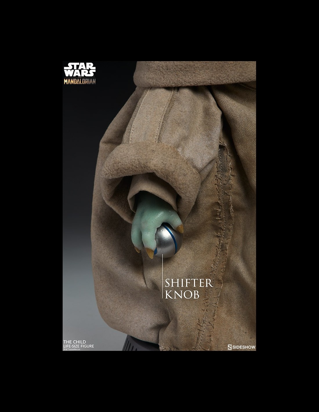 The Child Life Sized Figure measures 16.5 inch tall, standing on a simple black podium base that lets this adorable alien steal all of the focus - along with the Mandalorian's ship parts. Inspired by its unique onscreen appearance, this mixed media statue features a tan fabric coat swaddling The Child as it gazes up with charming wide eyes, hiding the silver shift knob from the Razor Crest in its right hand.