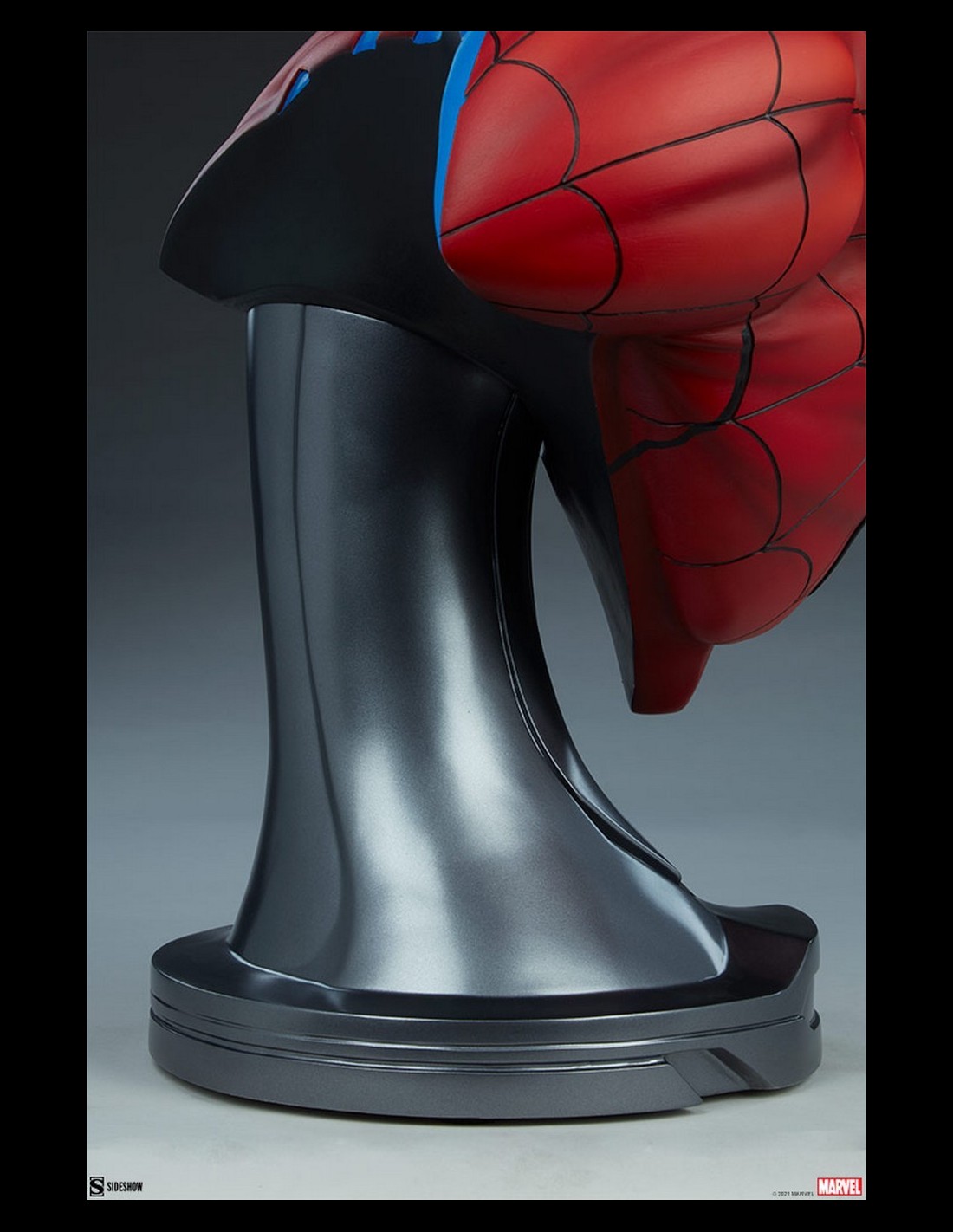 Perched on a sleek silver base, all the focus remains on the wall-crawler, whose detailed costume sculpt features black web impressions, a raised black spider-symbol on his chest, and large white eyes on his mask to give him a classic Spidey expression. Hints of blue can be seen on his back, and the entire bust is painted dynamically to emphasize Peter Parker’s agile, athletic physique.
