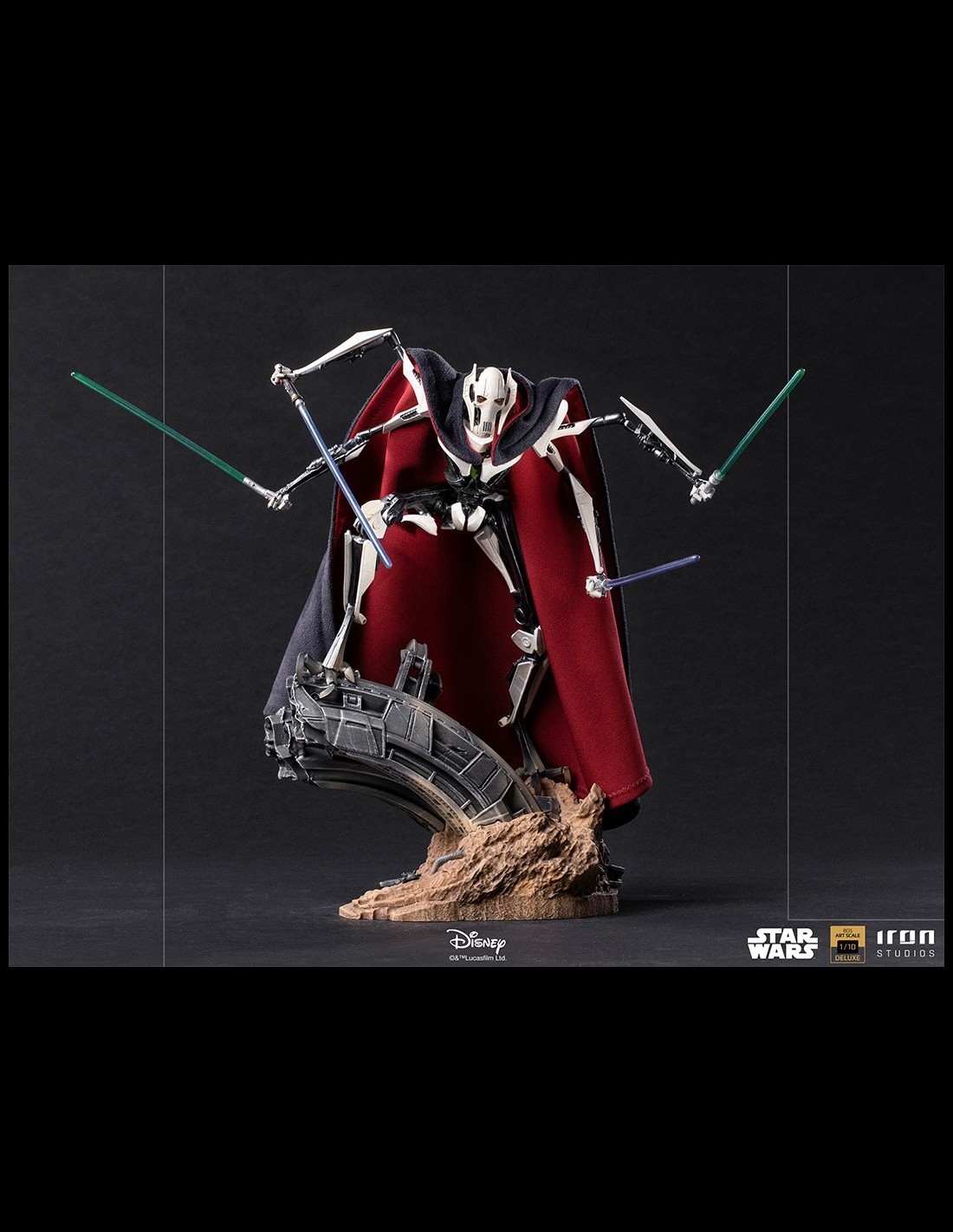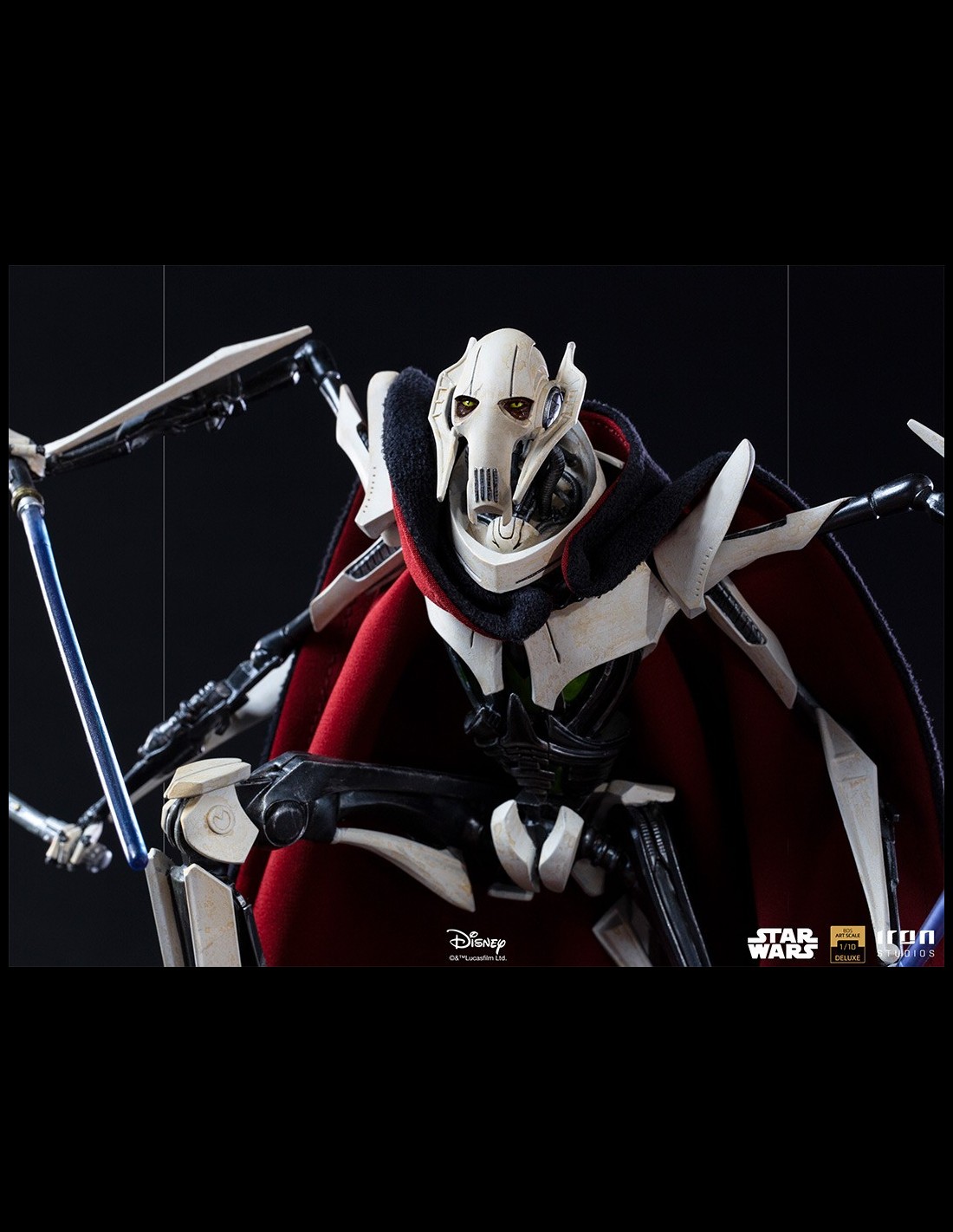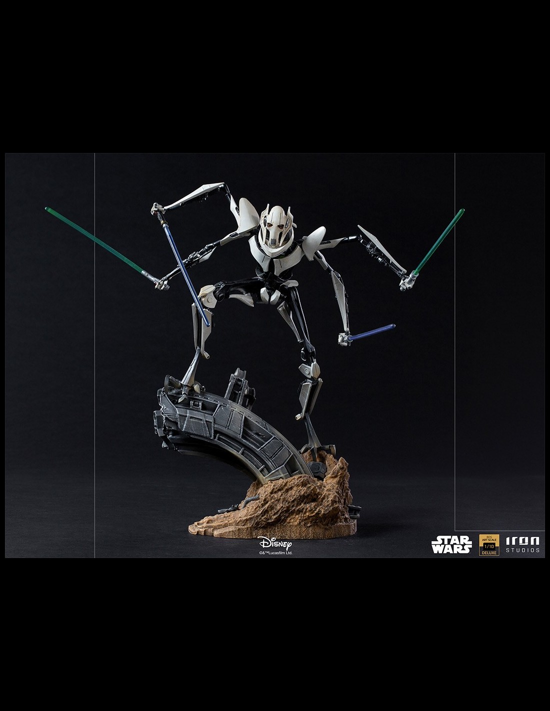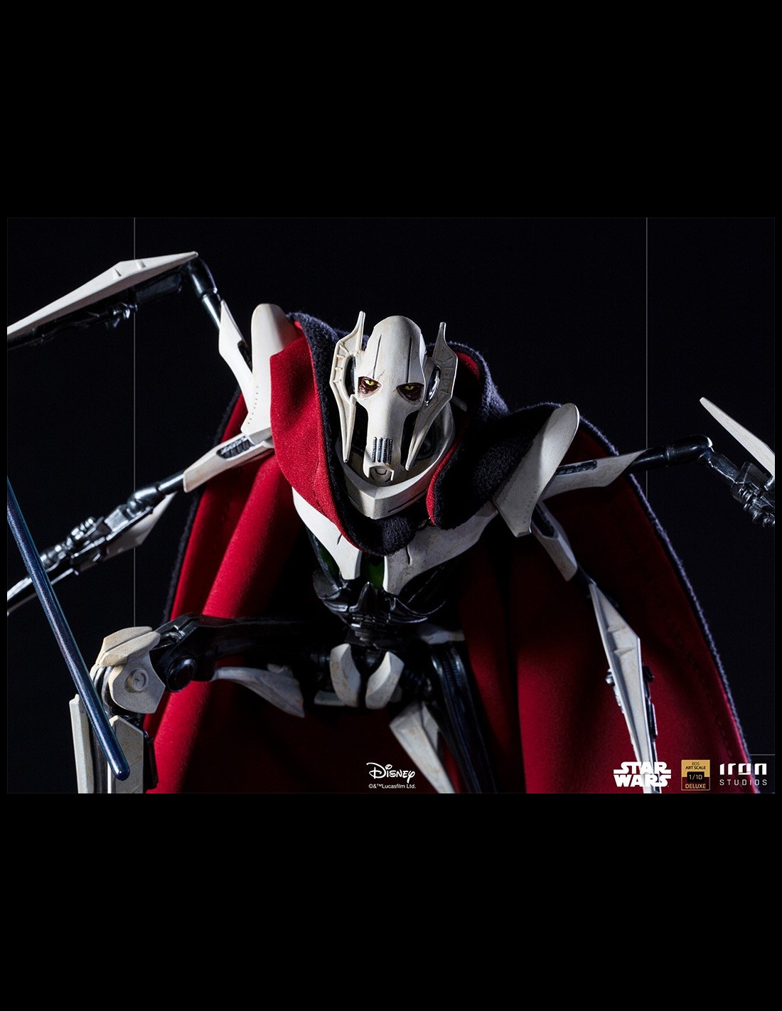 Brandendo quattro diverse spade laser, bottino dei combattimenti con coraggiosi cavalieri Jedi che hanno osato affrontarlo, questo temuto signore della guerra impone la paura ai suoi nemici attraverso i suoi freddi occhi gialli, una delle sue poche parti organiche, nascosta dalle reliquie del suo passato, come il suo vero volto dietro una maschera e un rivestimento sfoderabile in tessuto che ricopre il suo corpo robotico, ornamenti caratteristici della sua specie. Su una base diorama che fa riferimento a un campo di battaglia, supportato da resti metallici tecnologici, incastonato nella superficie di un terreno arido, questo temibile nemico dell'Ordine Jedi e della Repubblica Galattica si erge, pronto a sterminare chiunque si metta sulla sua strada.