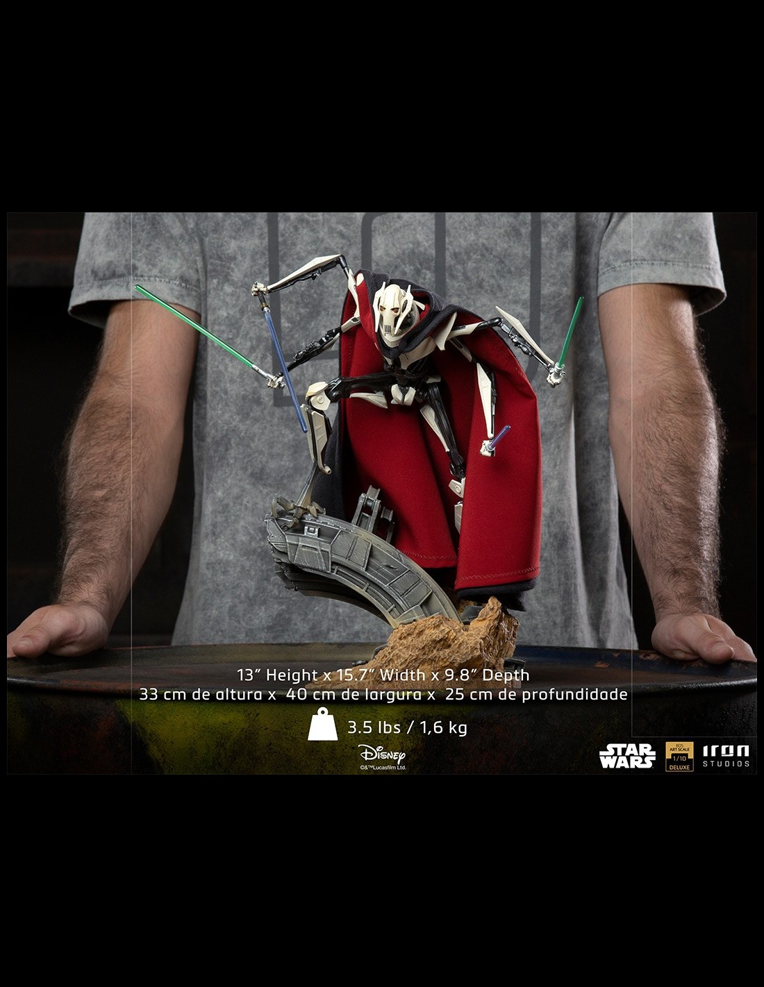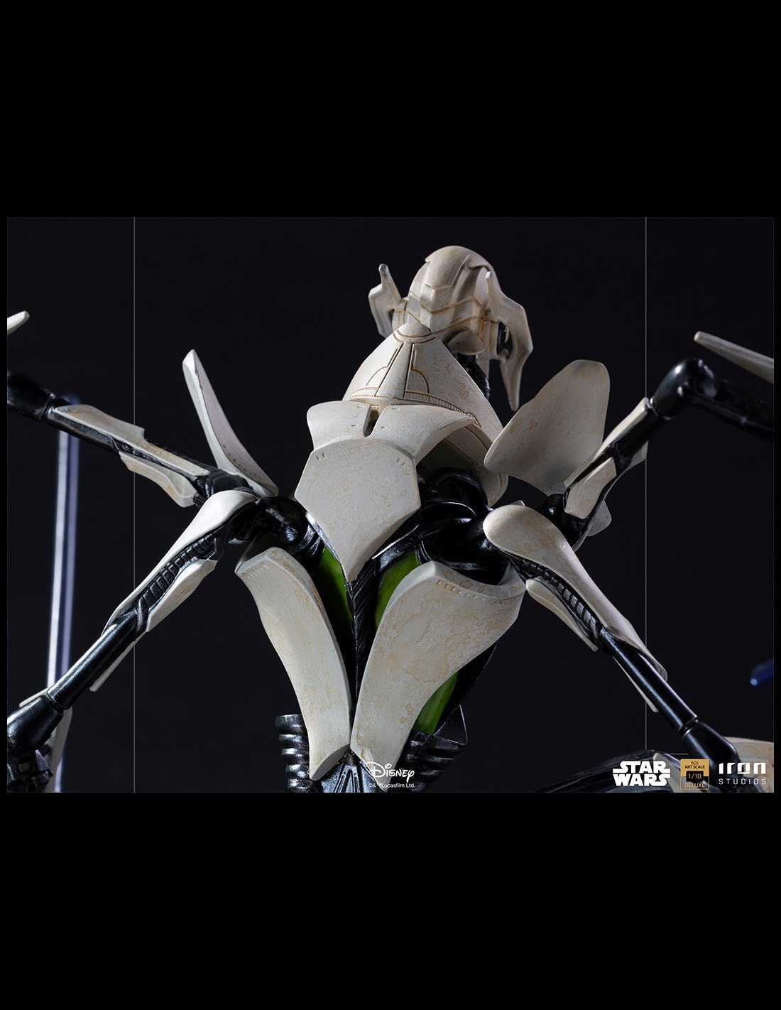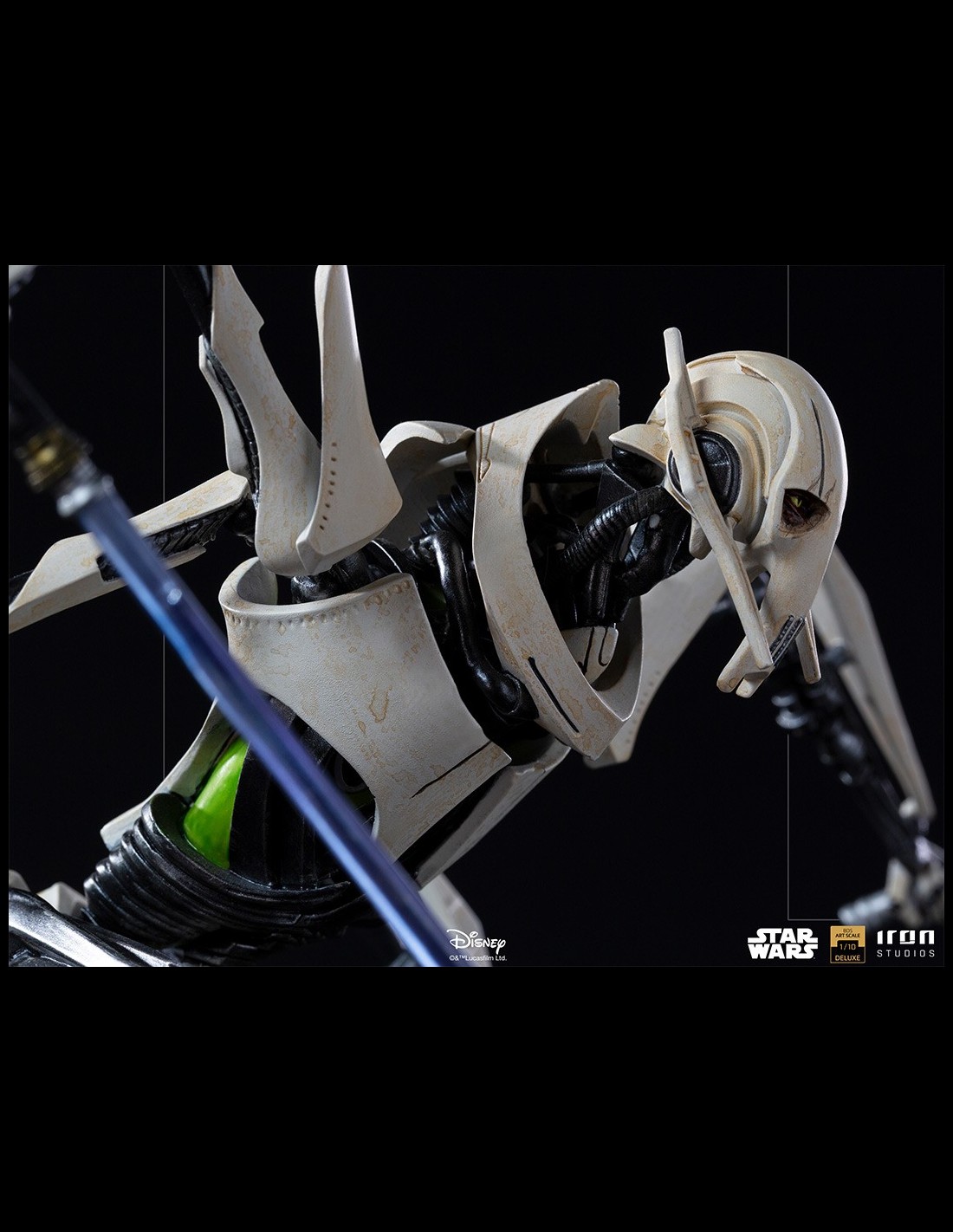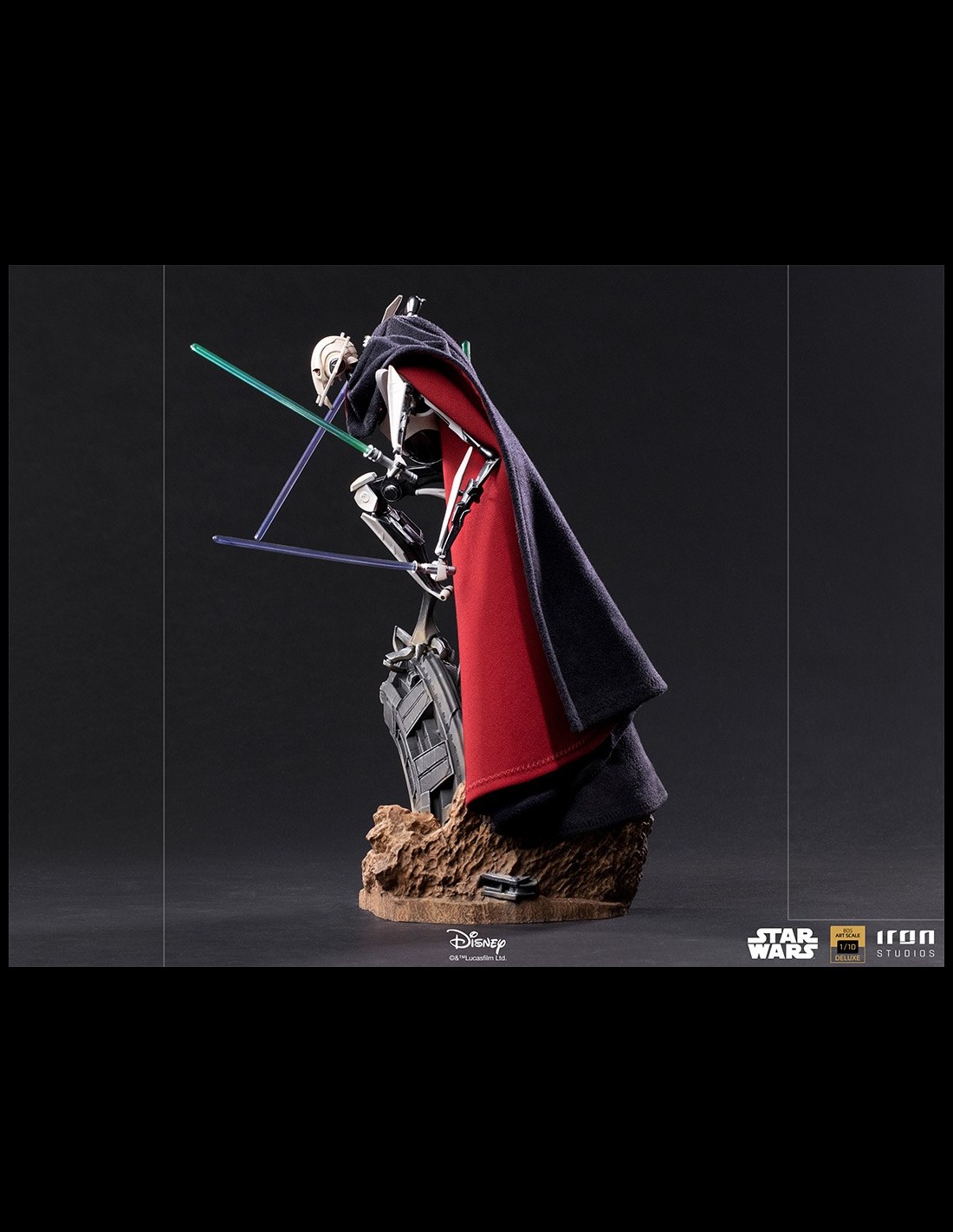 Brandendo quattro diverse spade laser, bottino dei combattimenti con coraggiosi cavalieri Jedi che hanno osato affrontarlo, questo temuto signore della guerra impone la paura ai suoi nemici attraverso i suoi freddi occhi gialli, una delle sue poche parti organiche, nascosta dalle reliquie del suo passato, come il suo vero volto dietro una maschera e un rivestimento sfoderabile in tessuto che ricopre il suo corpo robotico, ornamenti caratteristici della sua specie. Su una base diorama che fa riferimento a un campo di battaglia, supportato da resti metallici tecnologici, incastonato nella superficie di un terreno arido, questo temibile nemico dell'Ordine Jedi e della Repubblica Galattica si erge, pronto a sterminare chiunque si metta sulla sua strada.