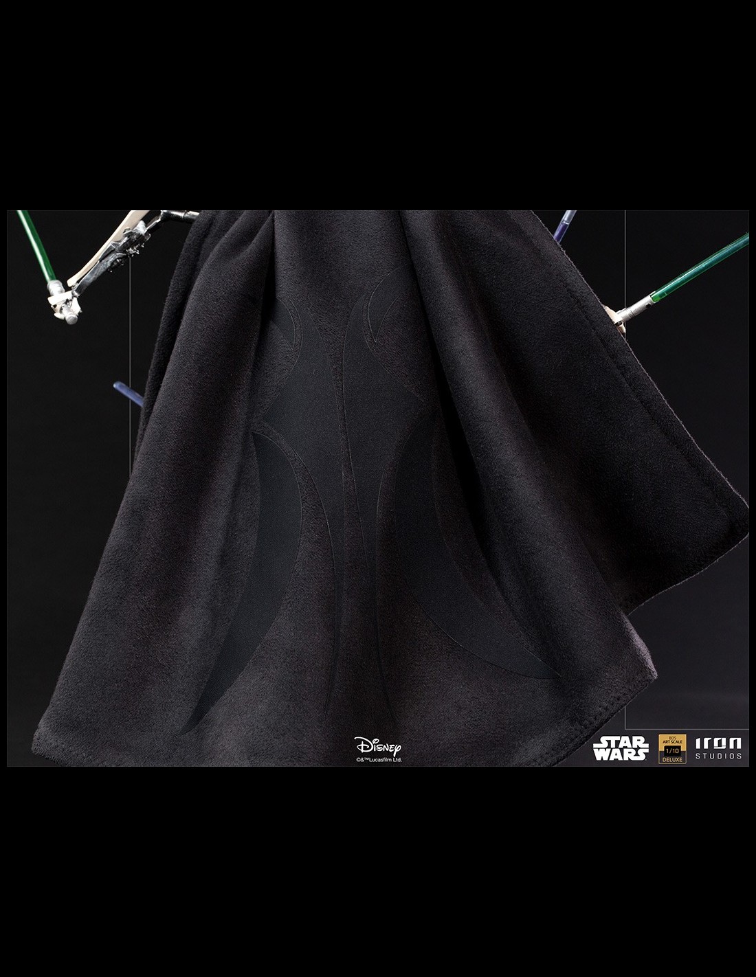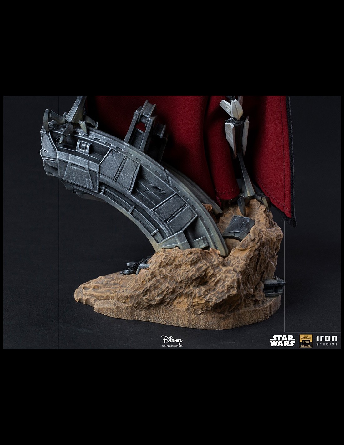 Wielding four different lightsabers, combat spoils with brave Jedi knights who dared to face him, this feared warlord imposes fear on his enemies through his cold yellow eyes, one of his few organic parts, hidden by relics from his past, like his real face behind a mask and a removable cover made of fabric that covers his robotic body, adornments that are characteristic of his species. On a diorama base that refers to a battlefield, supported by technological metallic remains, embedded in the surface of arid terrain, this fearsome enemy of the Jedi Order and the Galactic Republic poses, prepared to exterminate anyone who gets in his way.