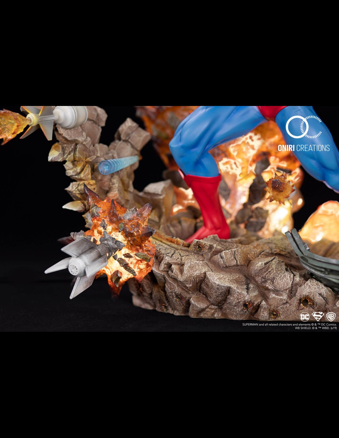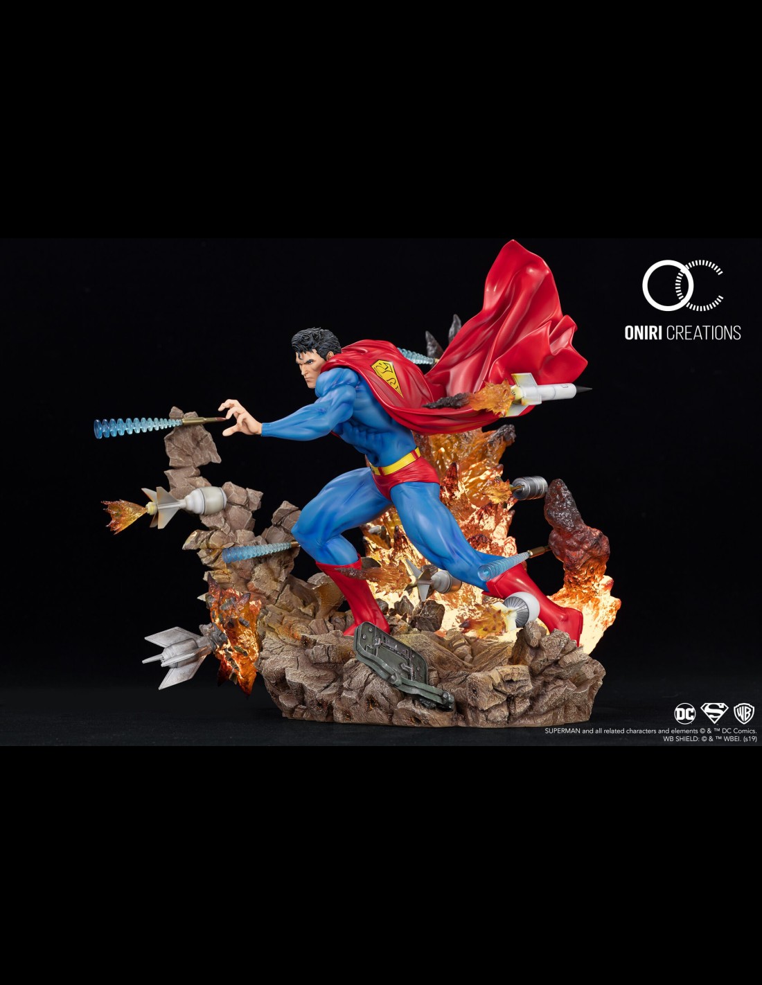 Meticulously placed around Superman, the bullets and missiles give an immersive perspective effect as you move around the statue.