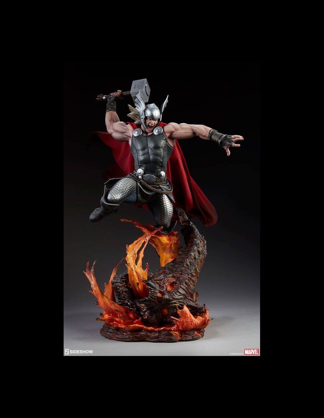 The Thor: Breaker of Brimstone Premium Format Figure measures 25.5” tall, as Thor descends onto a Muspelheim-themed base, with plumes of lava erupting around the fire giant Surtur’s roaring skull.
