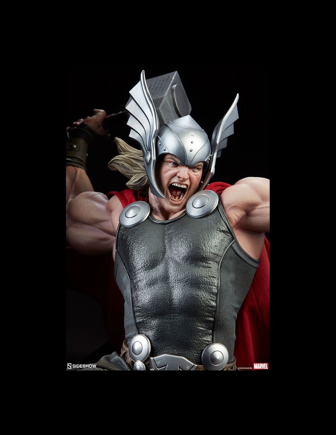 Thor wears sculpted Asgardian armor including his iconic winged helmet, wrist guards, scaled leg guards, knotted belts, and a black tunic detailed with realistic fabric-like textures. His regal red cape features weathering details and internal wiring for custom posing options. Thor, the Son of Asgard, has detailed musculature and a portrait with flowing blonde locks that captures his berserker fury. Thor is prepared to swing down the mystical hammer, which bears its famous enchantment etched into the side.