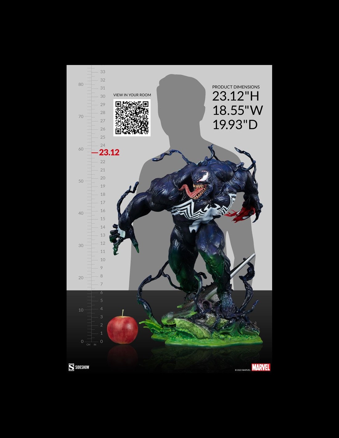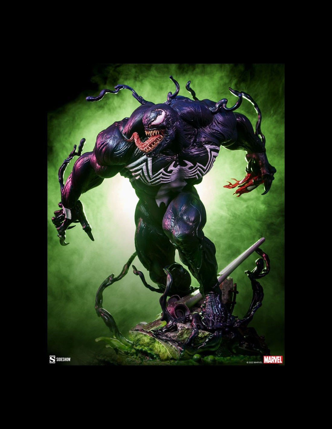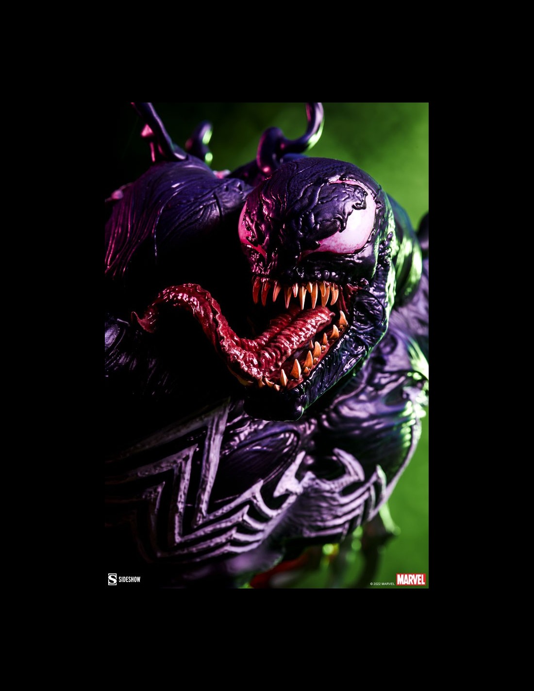 The Venom Premium Format Figure measures 23.12 inch tall and 18.56 inch wide as the monstrous symbiote stalks his prey in the sewers beneath Oscorp Labs. Under his feet, remnants of the Goblin Glider are consumed by green chemicals and in his powerful claws he holds Peter Parker’s signature Spider-Man mask, torn to shreds. Enemies beware - when Venom’s lashing tongue and gnashing teeth are exposed in a wicked grin, you might make his next meal!